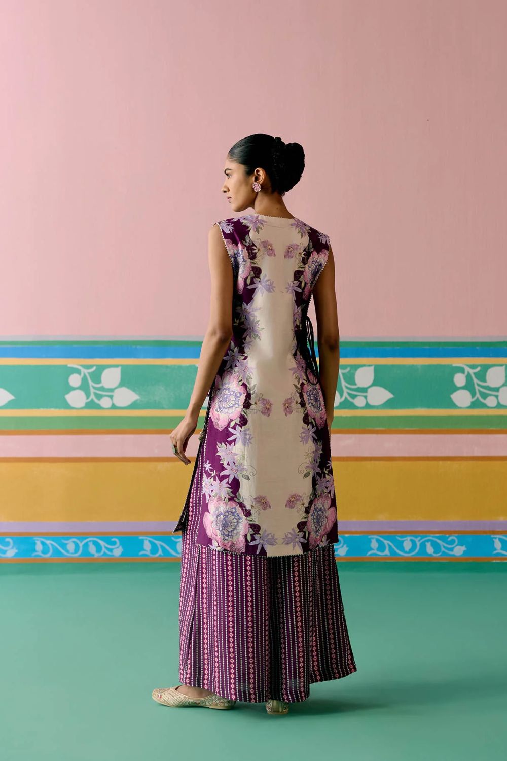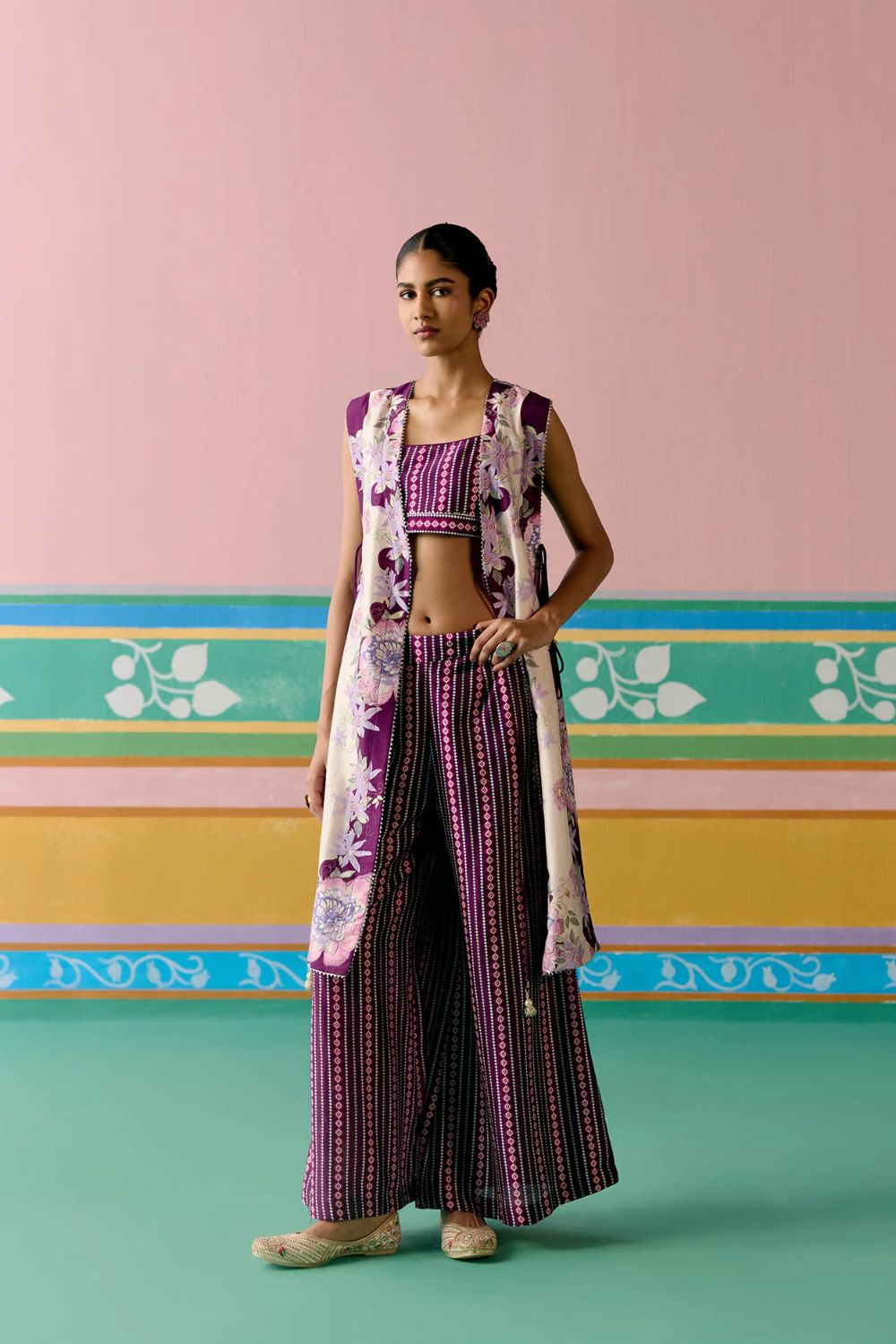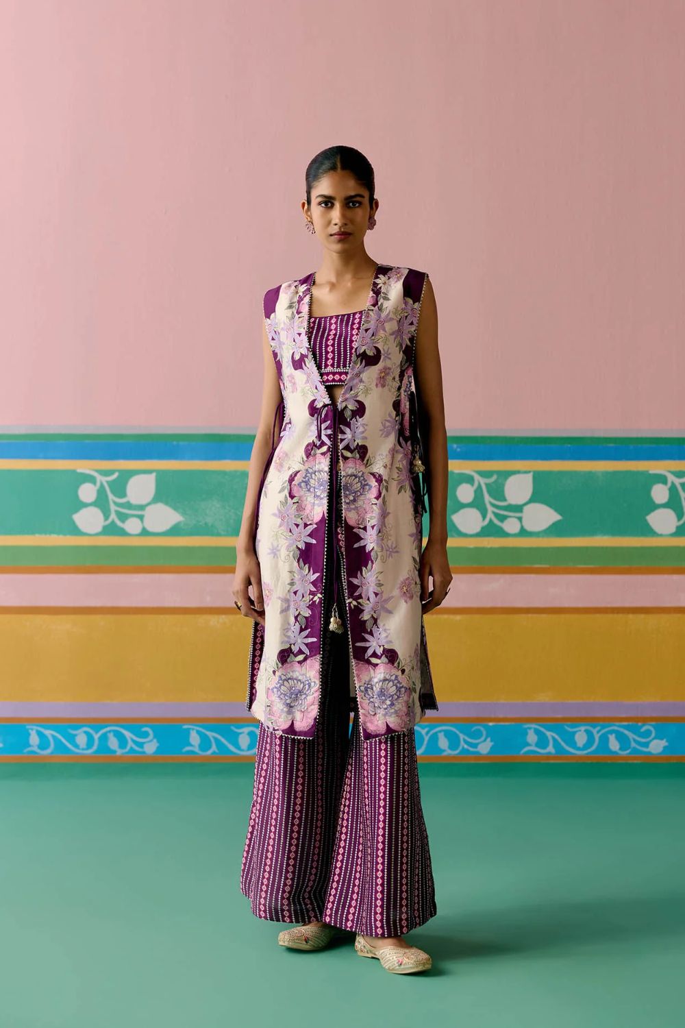 Chic and contemporary, the Purple Ikkat Jacket Set is crafted in airy Chanderi for a statement festive look. The sleeveless jacket is finished with a full lace border and playful dori tie-up details on the front and sides, accentuated with tassels for added charm. Paired with a bralette featuring a comfortable smocked back and pants with an elasticated waist, this versatile set blends ease with elegance—perfect for celebrations that call for a modern twist on tradition.