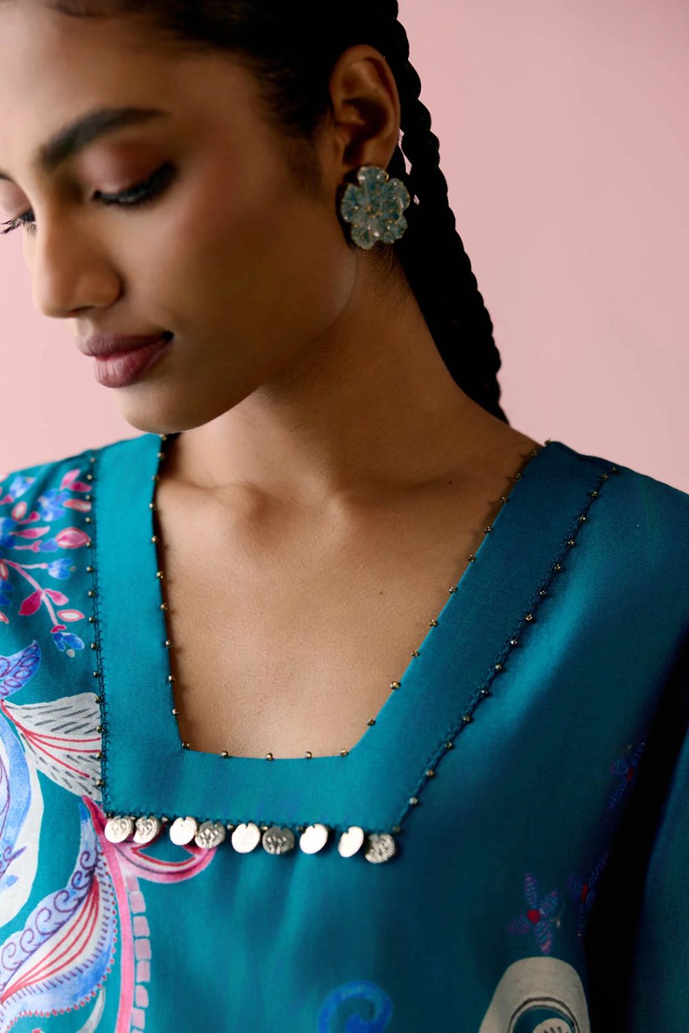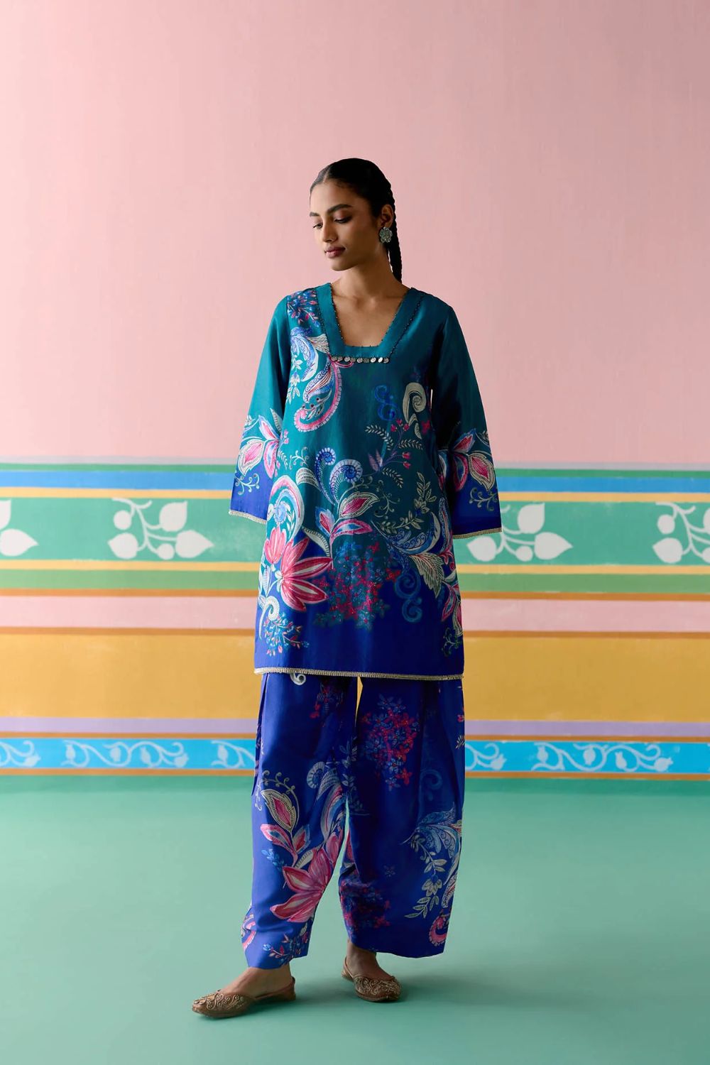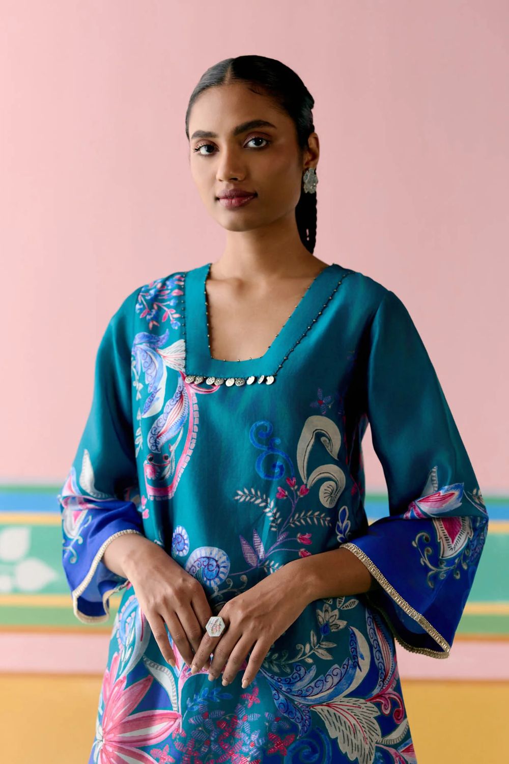 A graceful blend of charm and sophistication, the Teal Paisley Square Neck Kurta Set is designed to elevate your festive style. Tailored in airy Chanderi, the kurta is adorned with intricate lace detailing along the neckline, sleeves, and hem, finished with playful tassels for a hint of whimsy. The fully elasticated farsi-style pants offer ease of movement without compromising on elegance—making this set a perfect choice for both daytime festivities and evening soirees.