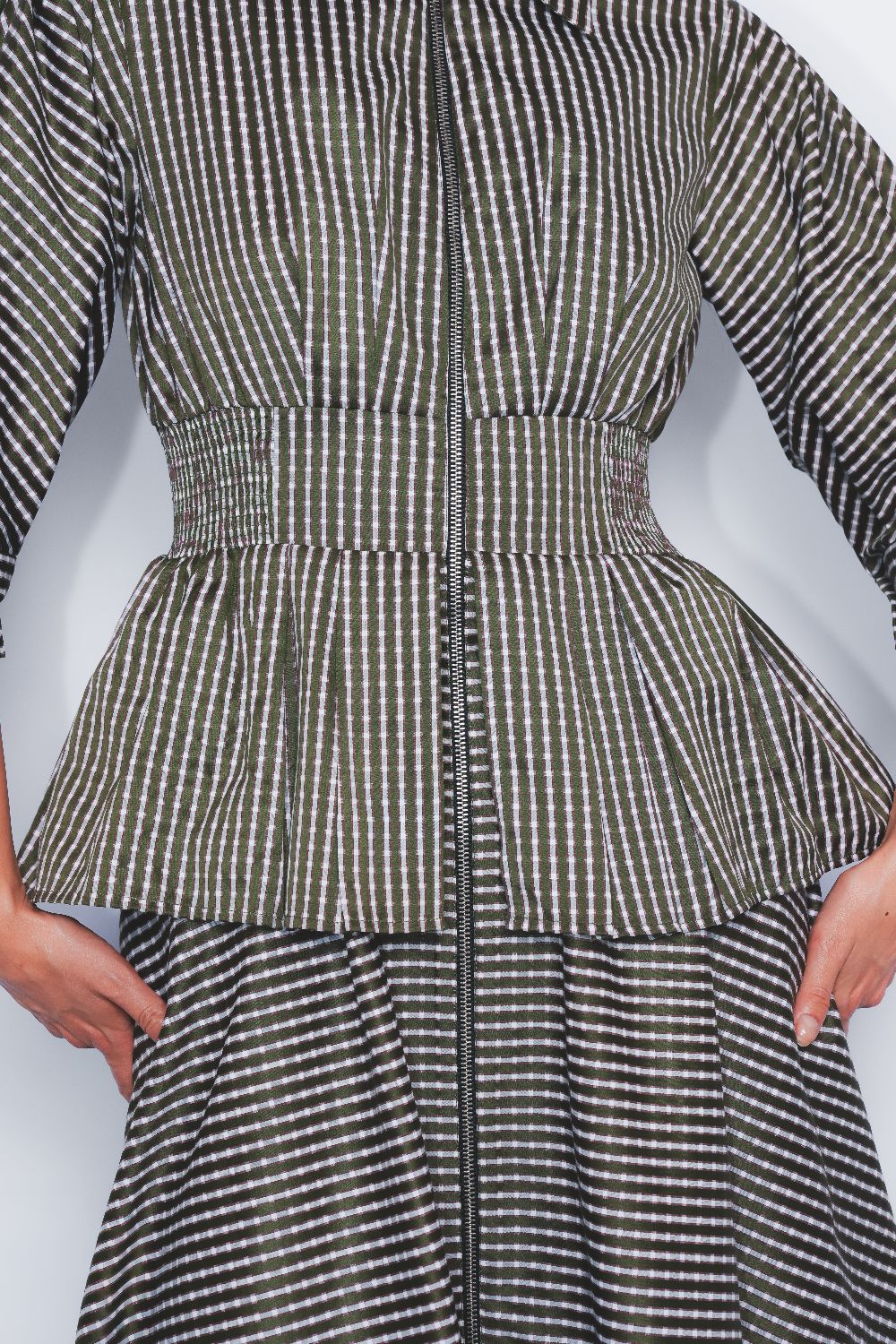 A classic dress silhouette cinched with an elasticated waistline elevated with a utilitarian update with a full front zipper opening. A tailored construction with a feminine touch. pleated detail at the sleeves adding to it and a flared skirt adding volume to it.