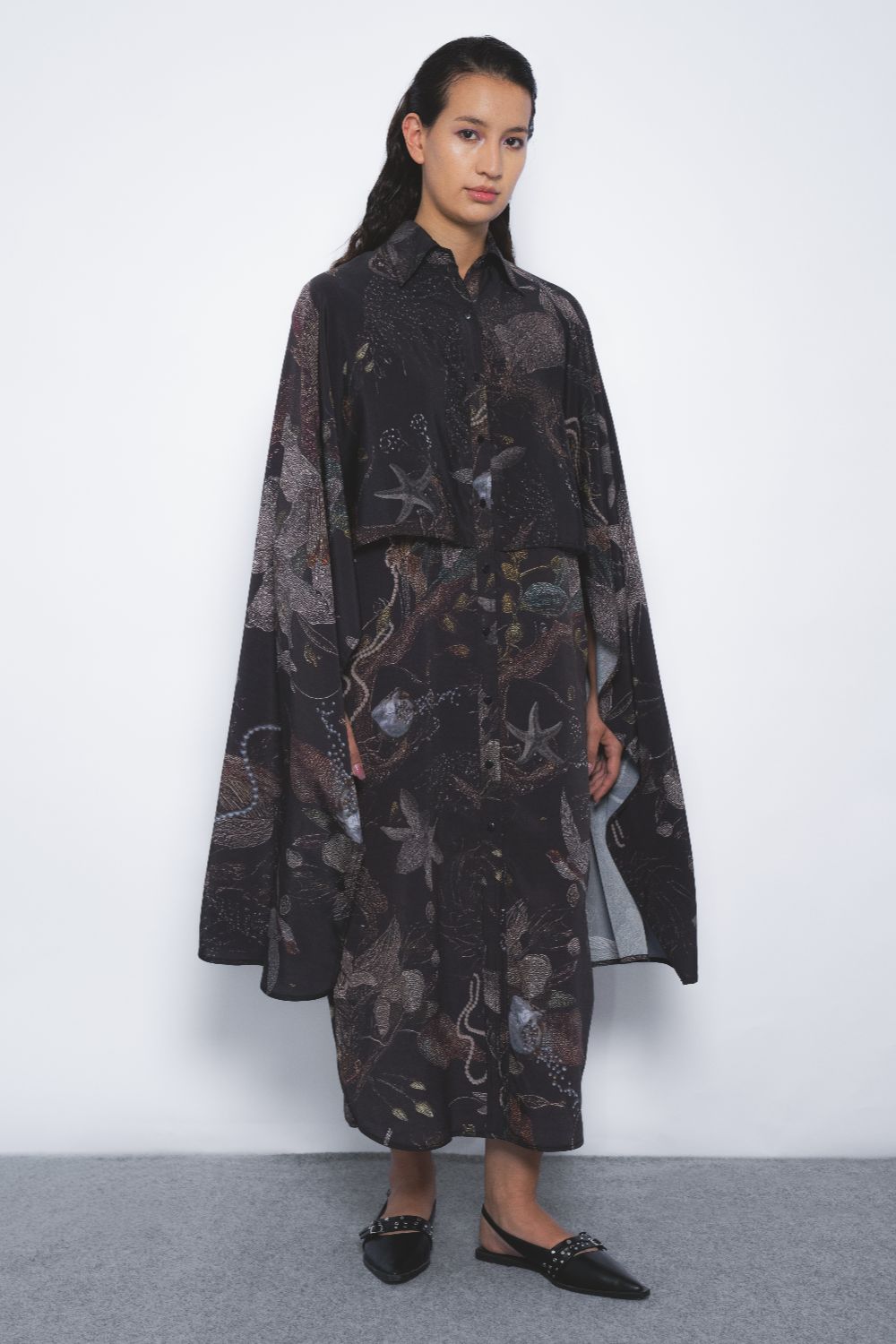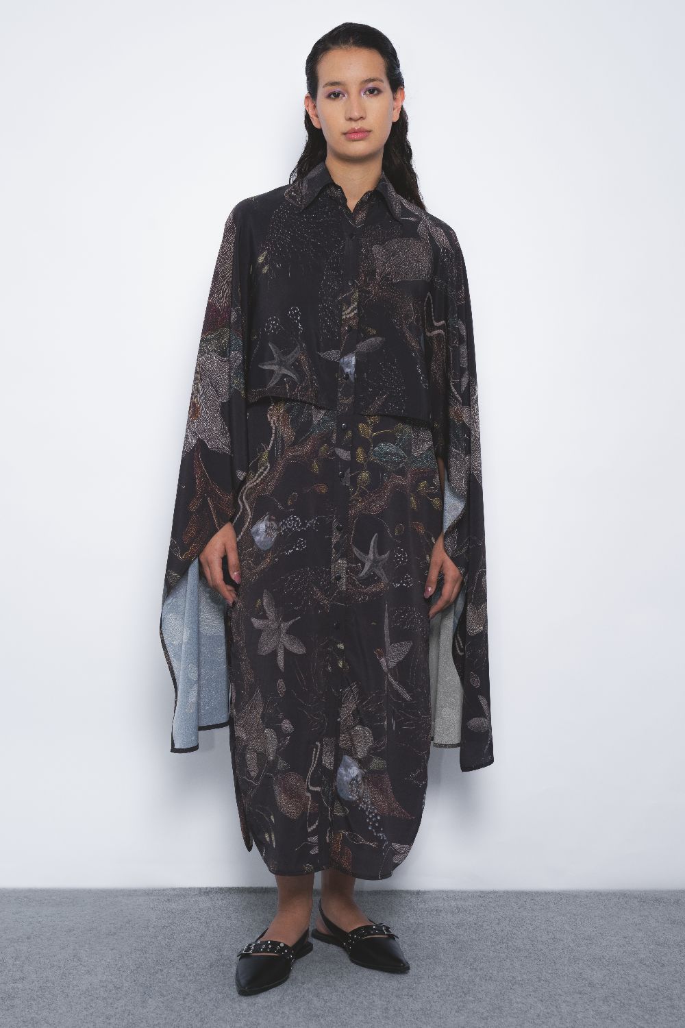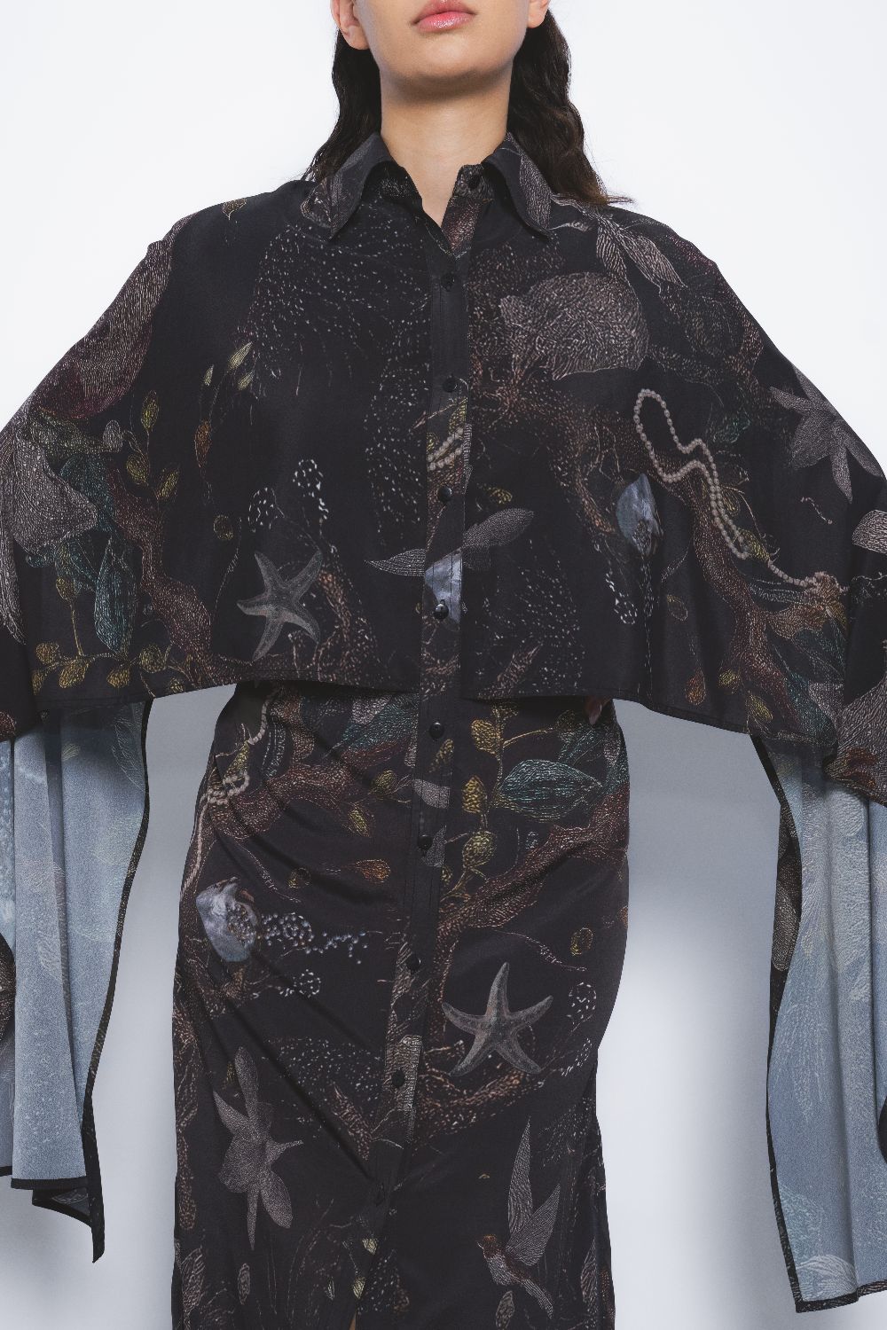 Crafted in Viscose Crepe, this classic shirt is reiimagined and tailored in a fluid silhouette with an extended cape detail at the sleeves. The garment features an artistic print merging elements of vegetation, the sea, and the stars, this artistic print evokes a balance of elegance and boldness.
