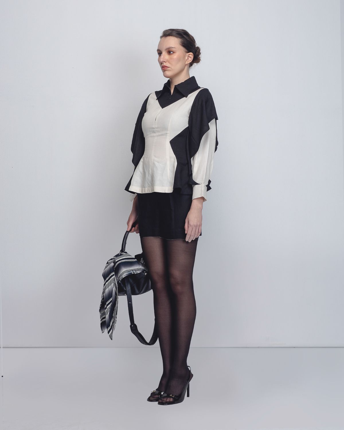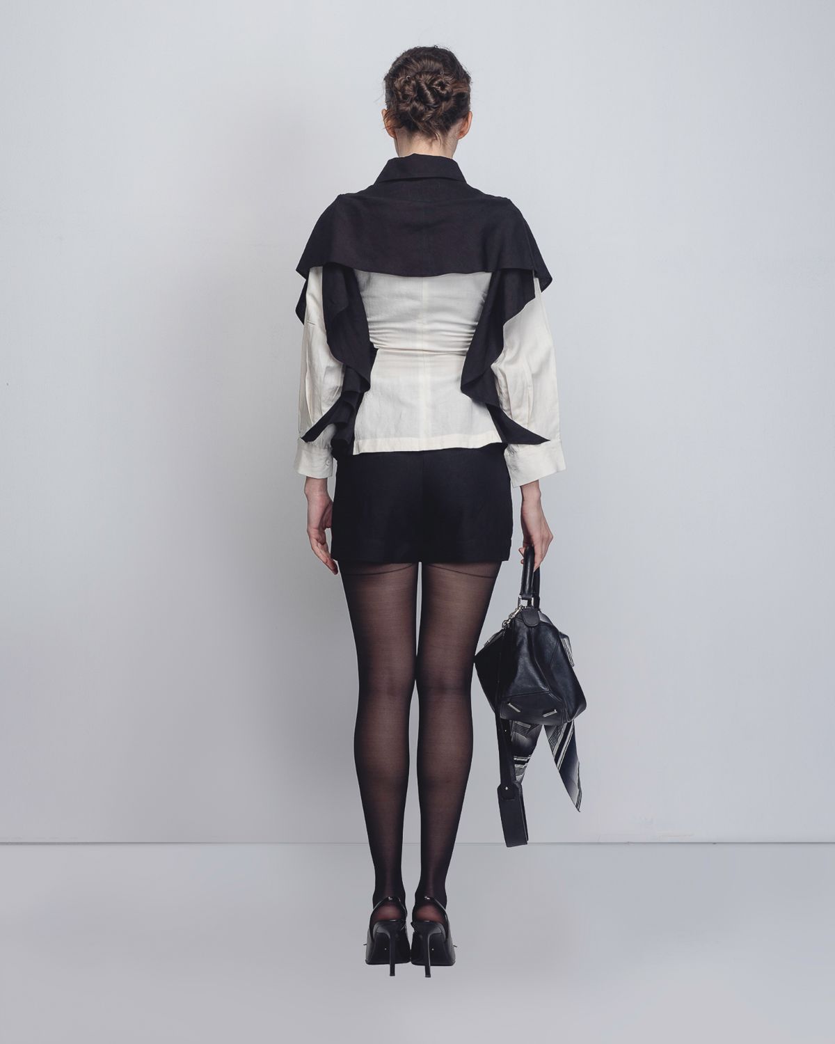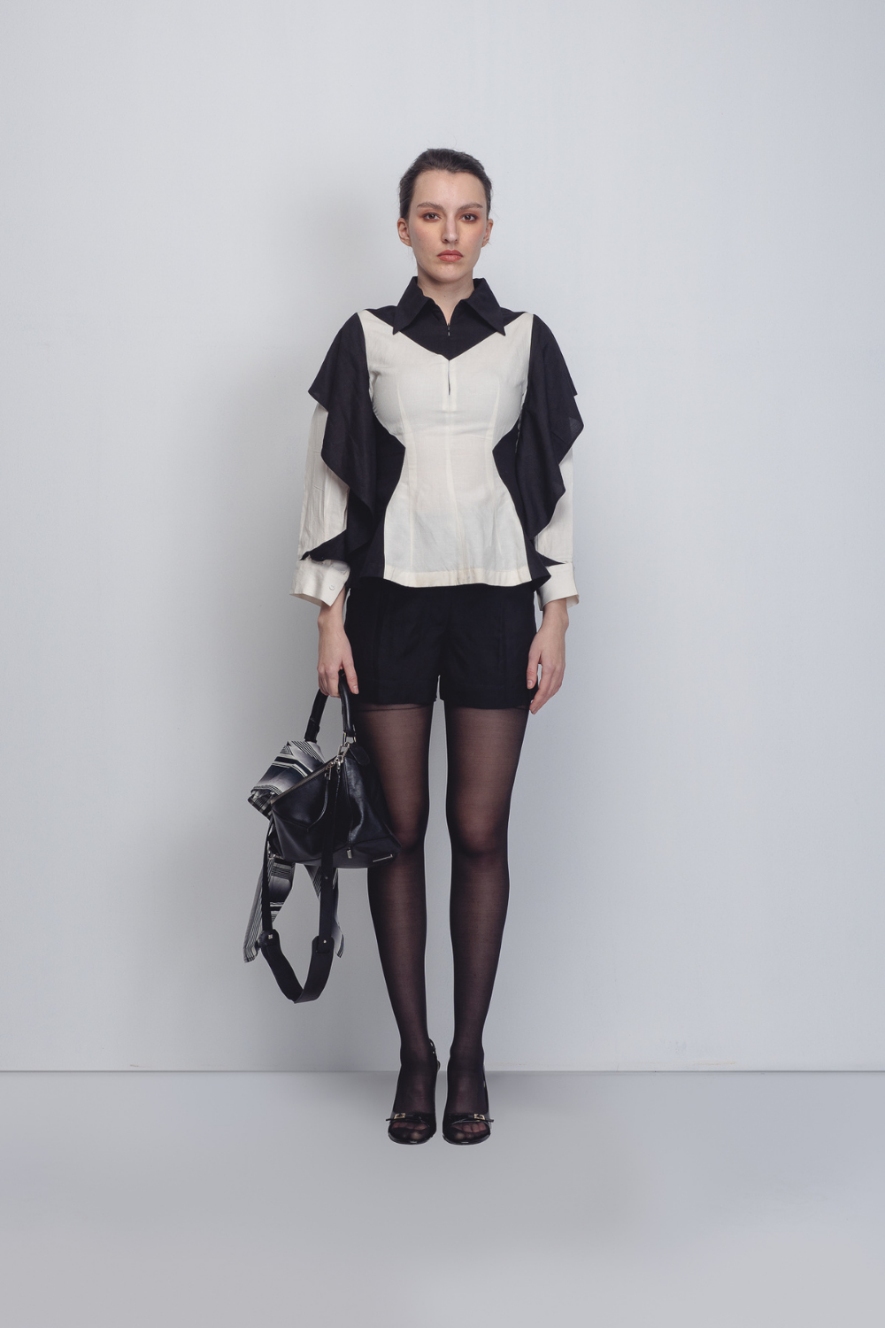 This top explores contrast through shaped paneling and color blocking. Its angular construction is balanced by a circular-cut ruffle panel that runs across the shoulders and extends to the back, creating a striking interplay of structure and softness. top 25", shorts 14"