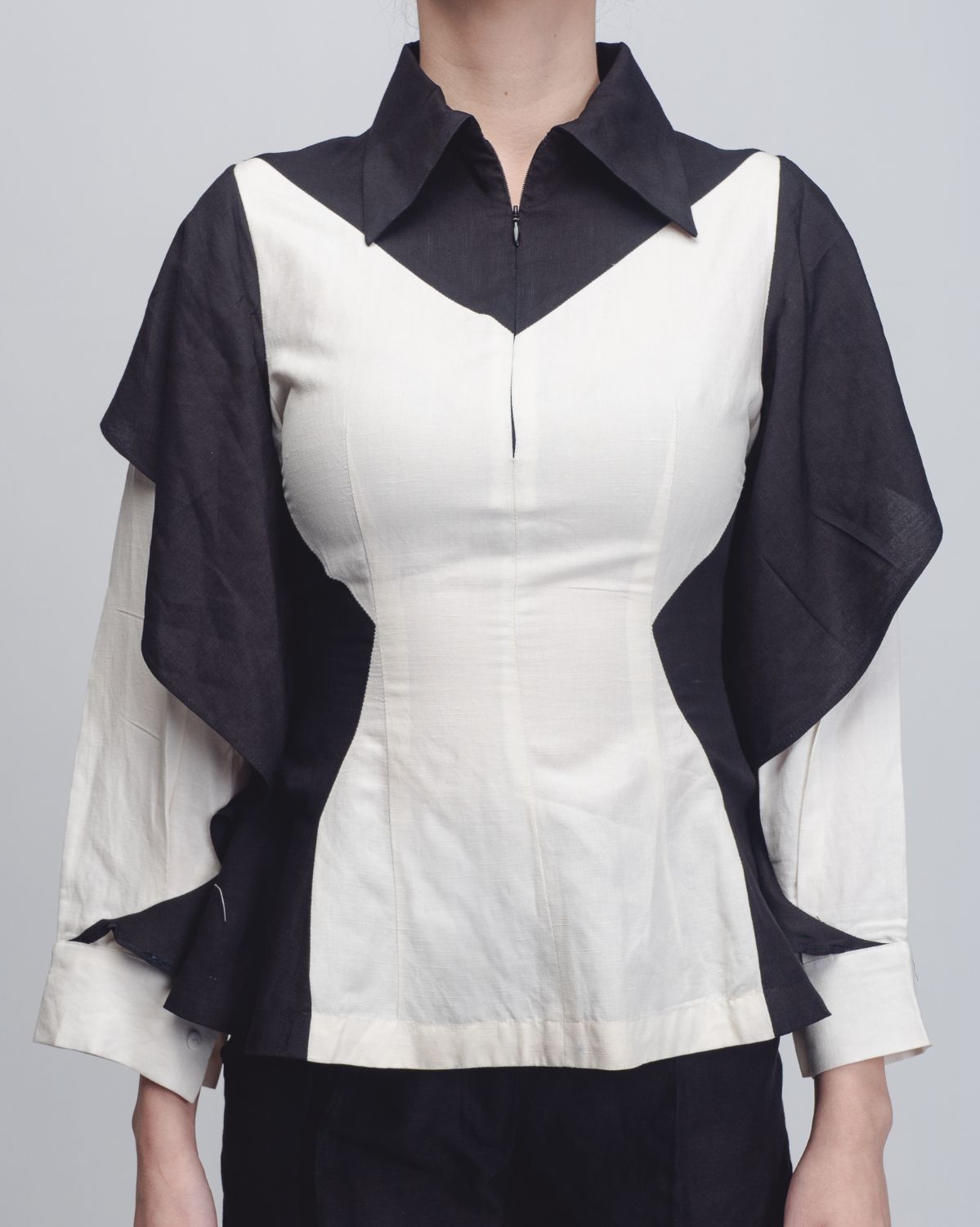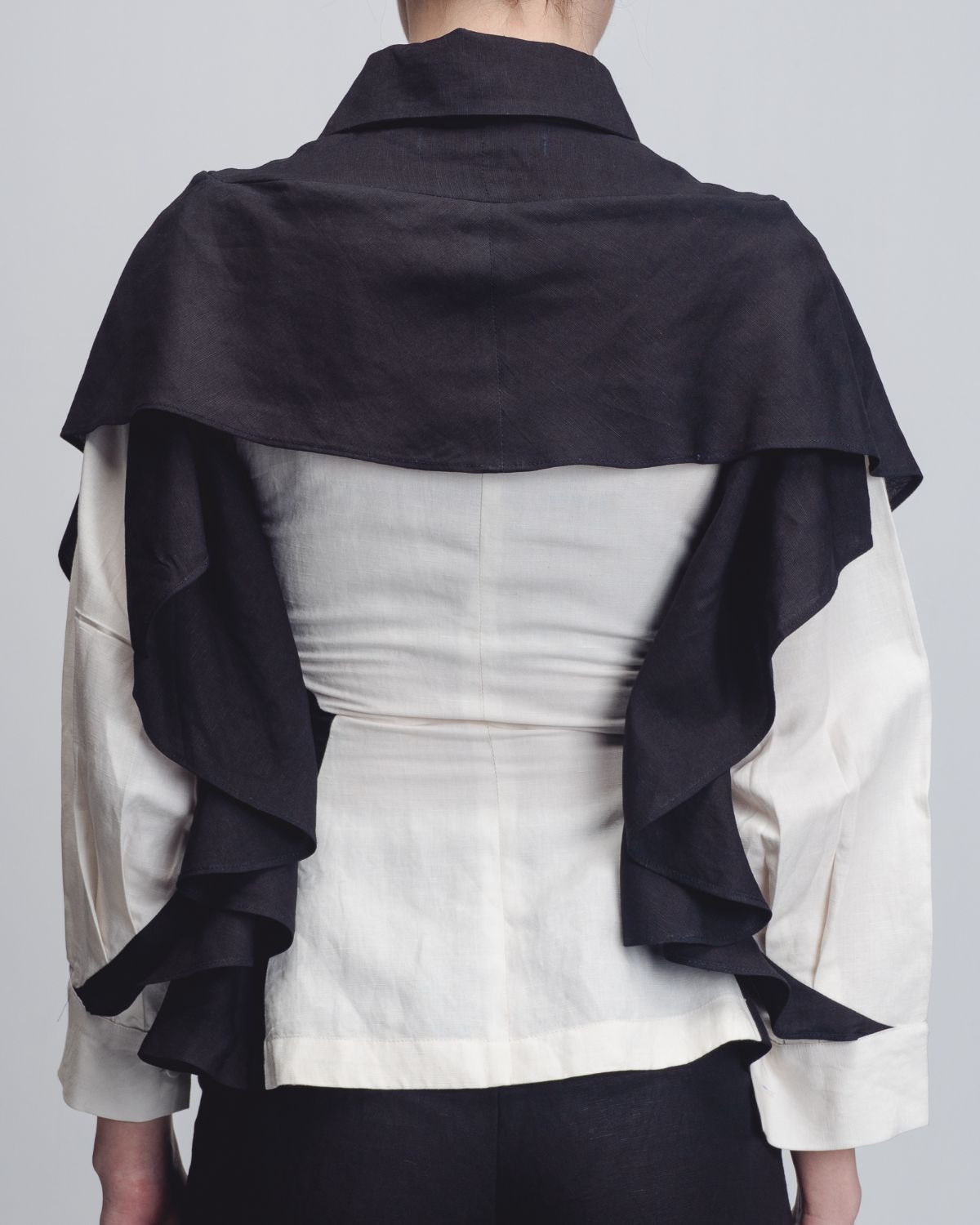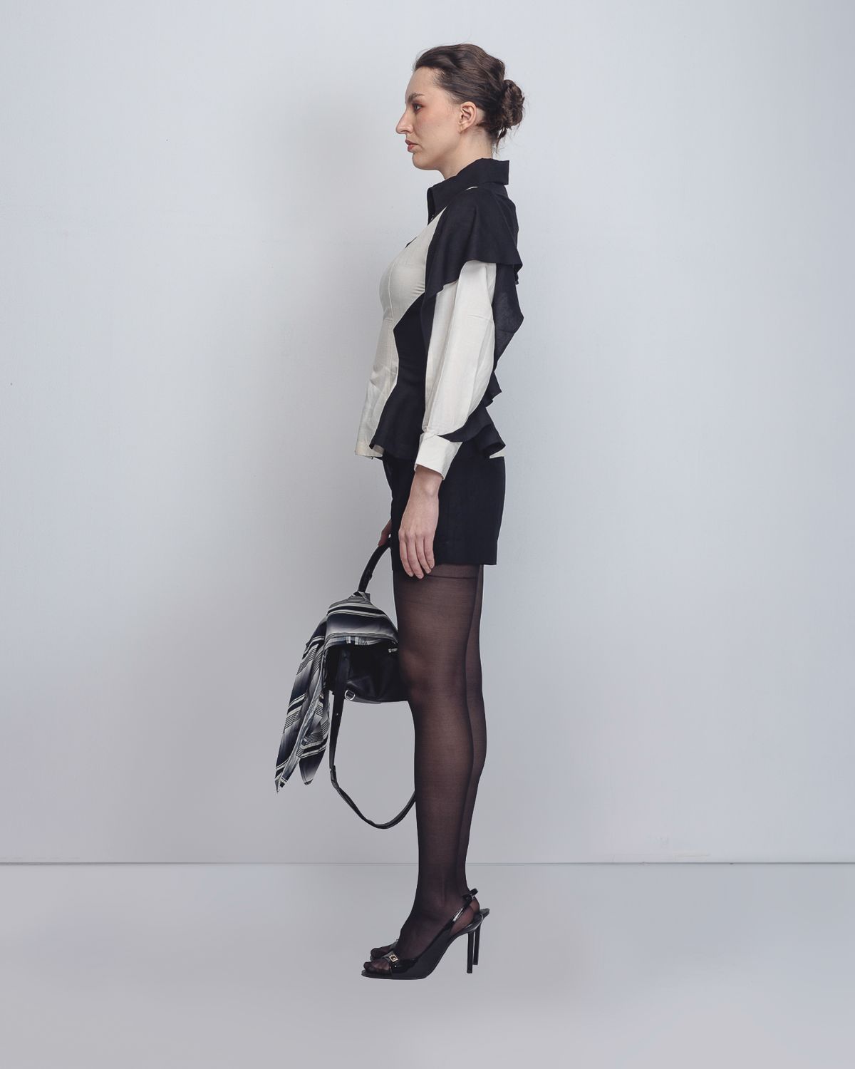 This top explores contrast through shaped paneling and color blocking. Its angular construction is balanced by a circular-cut ruffle panel that runs across the shoulders and extends to the back, creating a striking interplay of structure and softness. top 25", shorts 14"