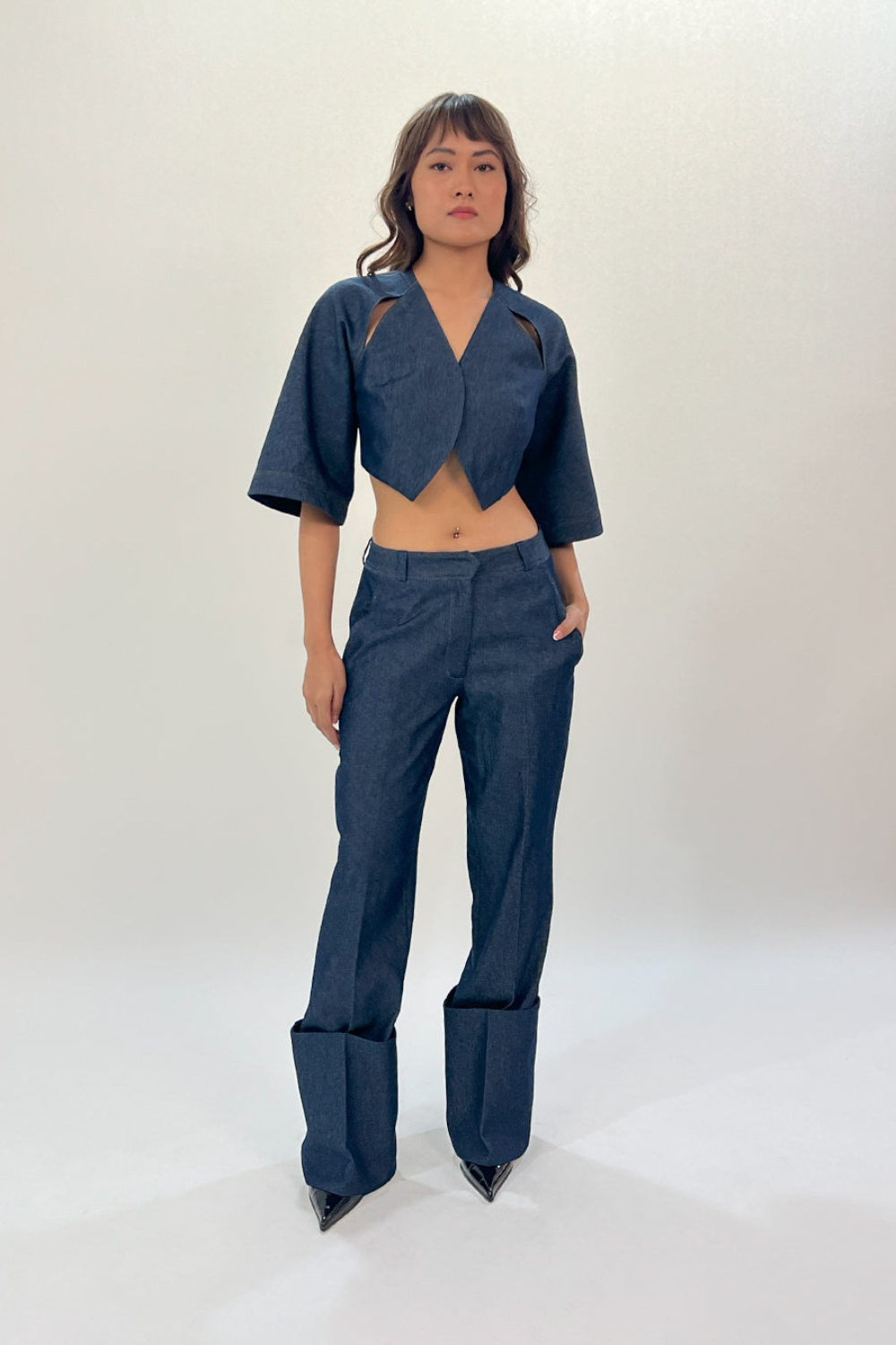 Made from durable denim, this mid waist pants feature a flattering fit that sits comfortably at the waist. The design includes a flared bottom and folded hem enhancing the flared style, giving the pants a more polished and contemporary finish. Model wear size S model height is 5'8 garment length is 43"