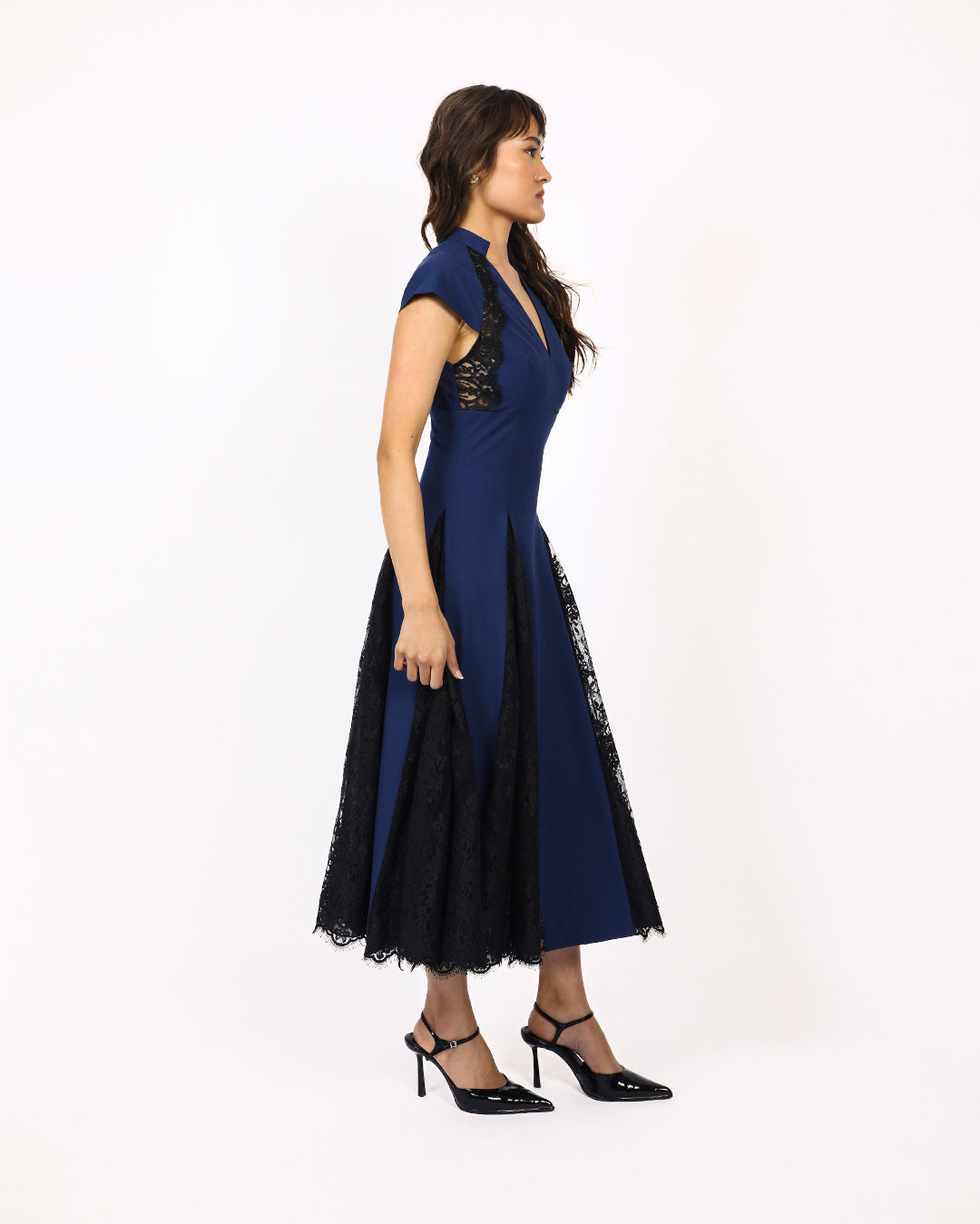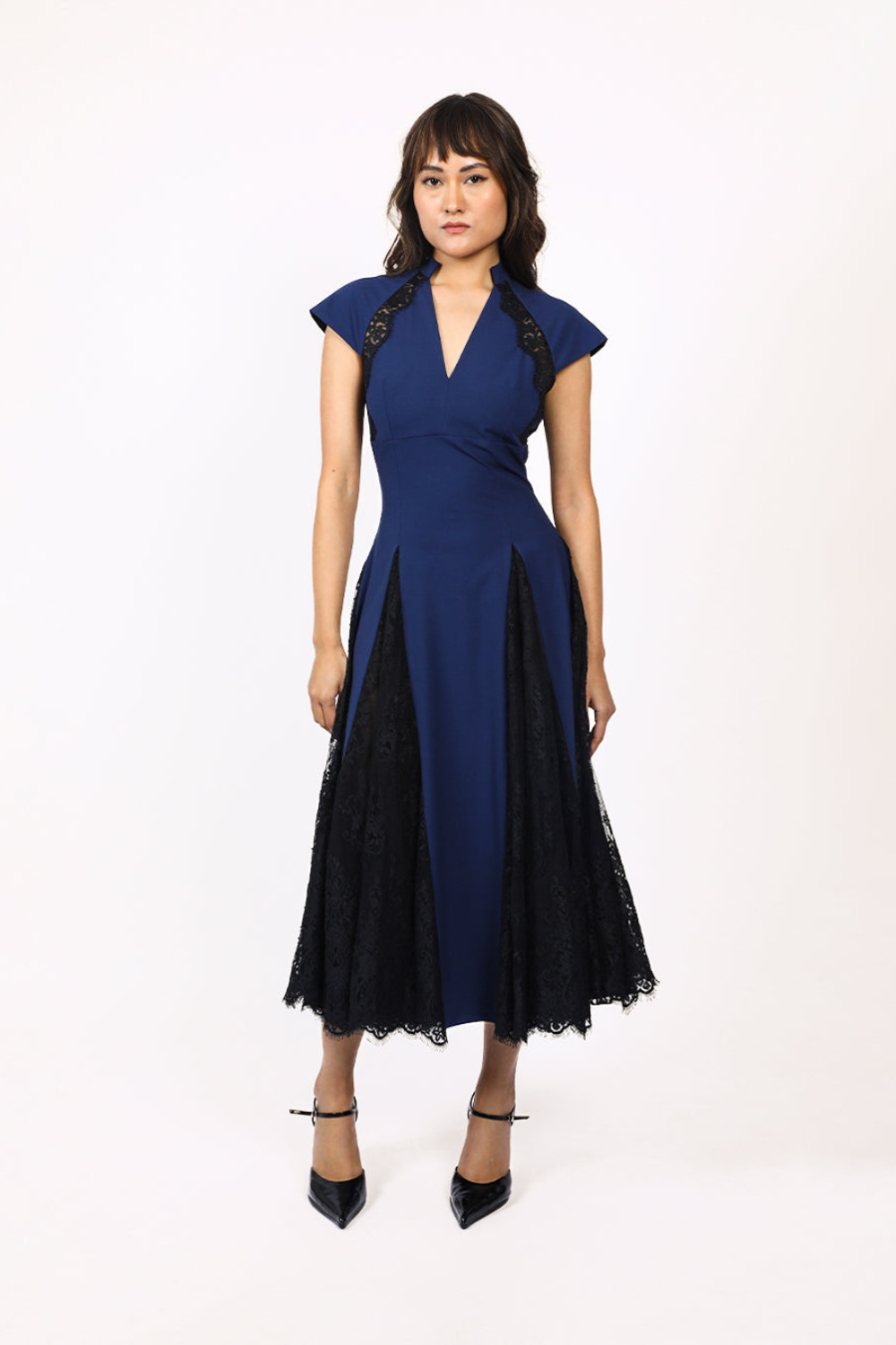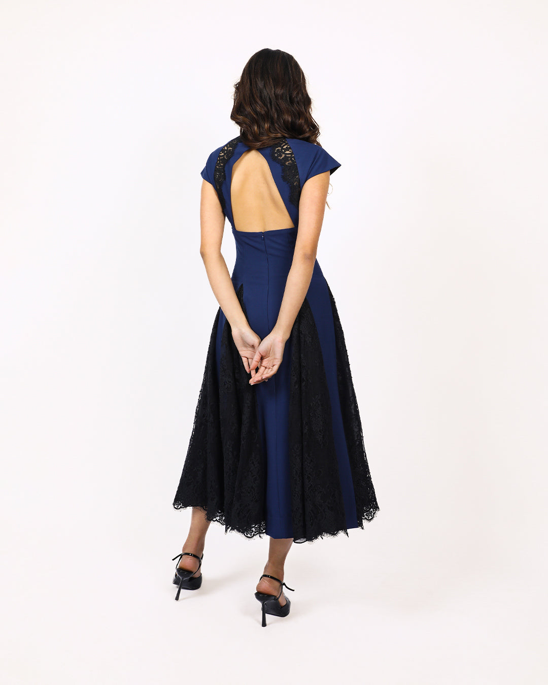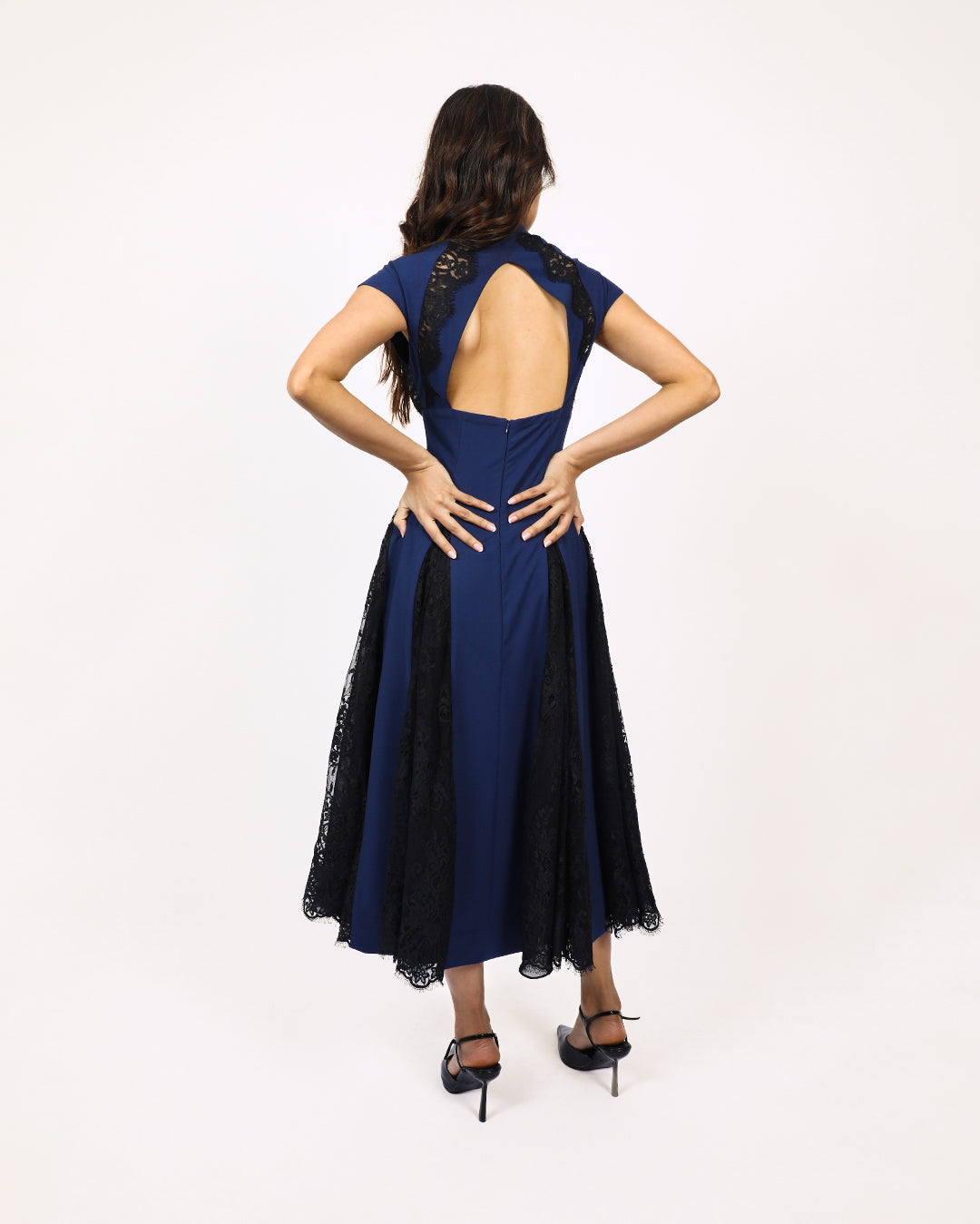 A sophisticated and elegant midi dress crafted from suiting fabric, featuring intricate lace godets that add a delicate touch with backless design that creates a striking yet chic appeal, while the extended cap sleeves provide coverage and structure. A plunging neckline enhances the dress's bold look, complemented by lace panels that add texture and depth. Model wear size S model height is 5'8 garment length is 50"