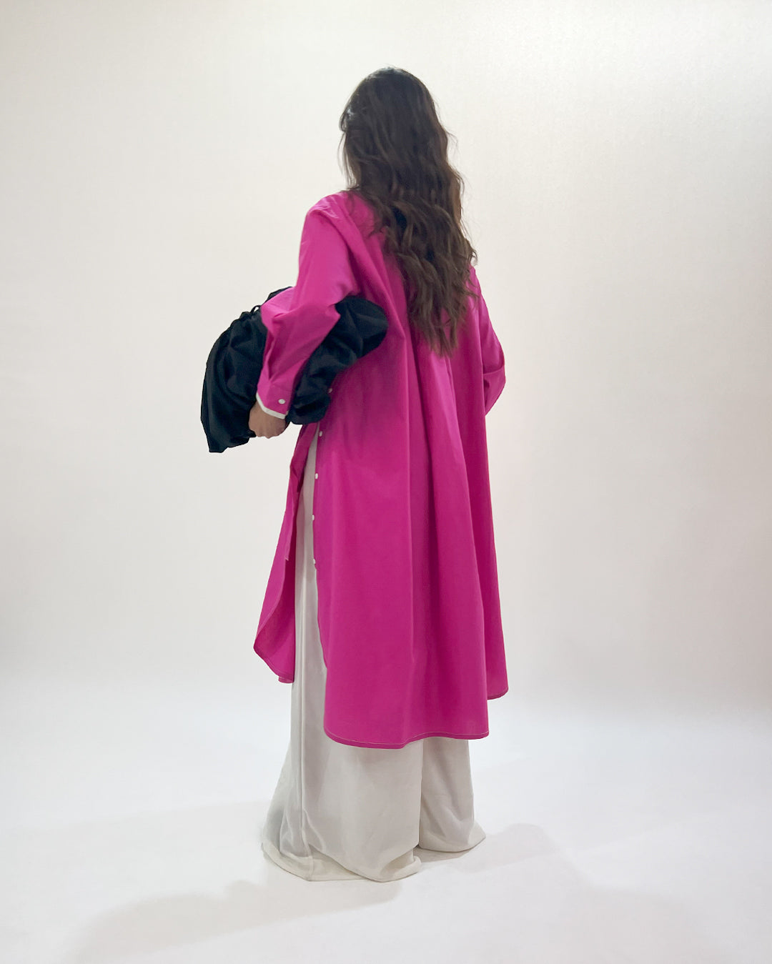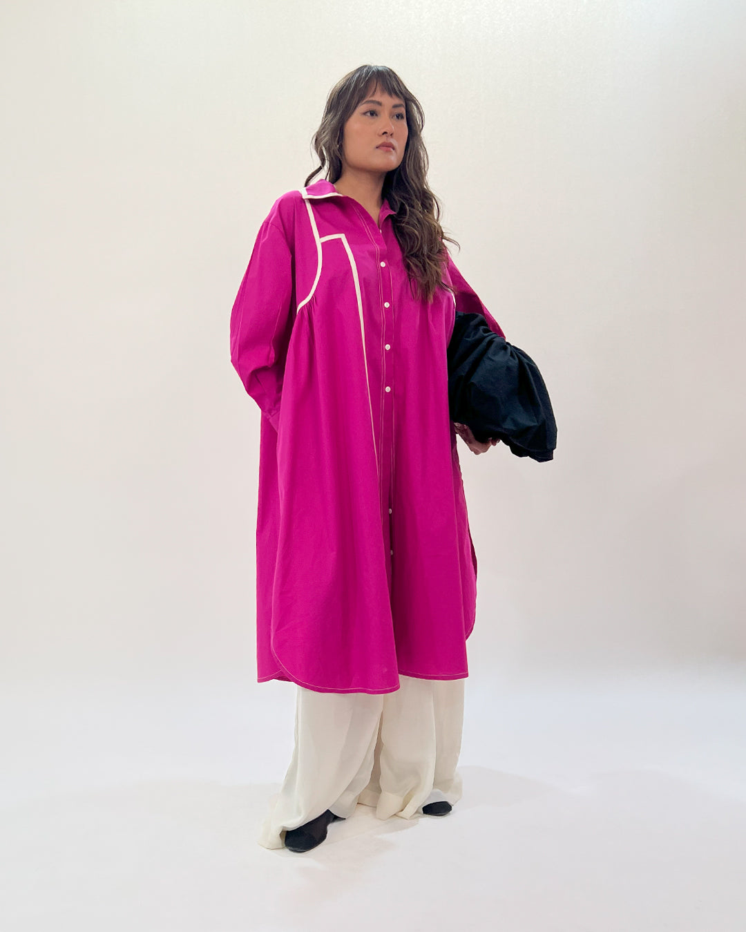 This long shirt dress combines clean lines with subtle design details for a refined look. It features side plackets that create a sleek, functional detail, with curved hemline. The contrast curved tapes with slight gathers that introduce a relaxed, comfortable element. Enhancing the overalll look with contrast tapes on the collar and cuffs, offering a crisp, polished finish. Model wear size S model height is 5'8 garment length is 45"