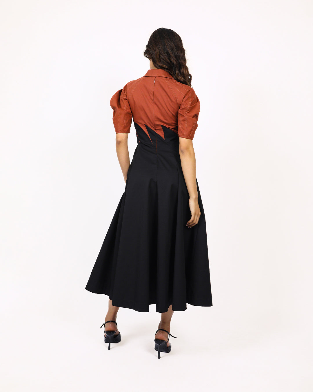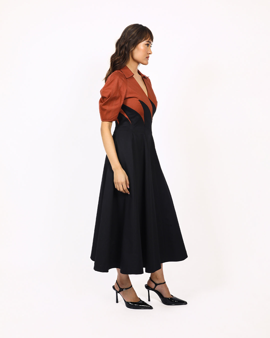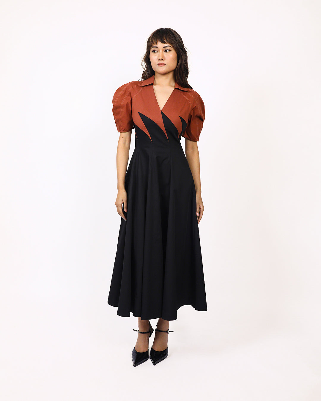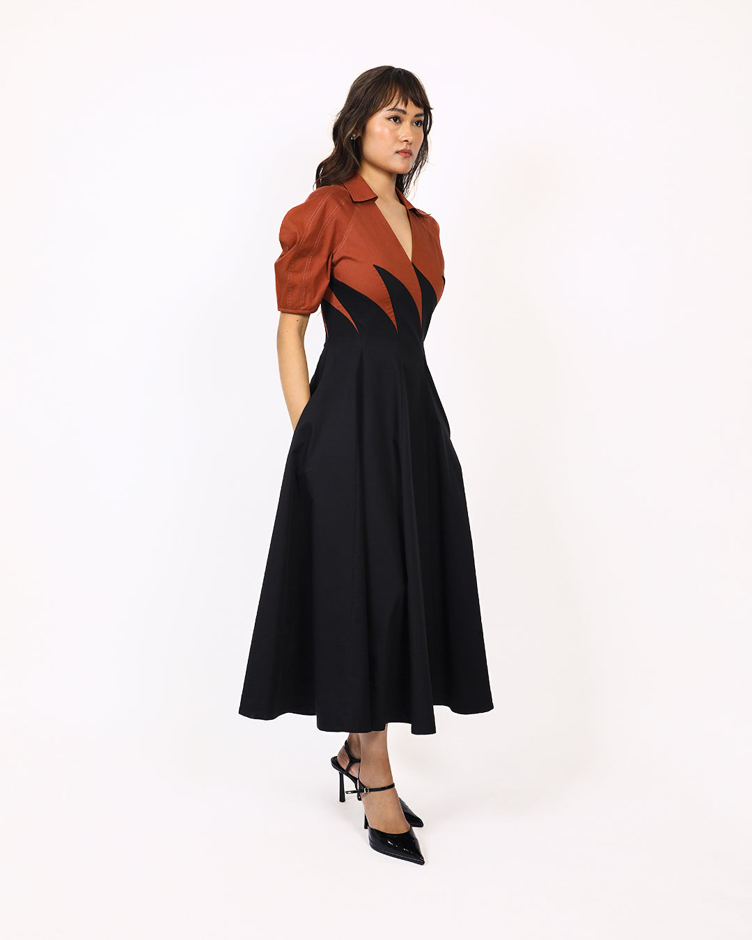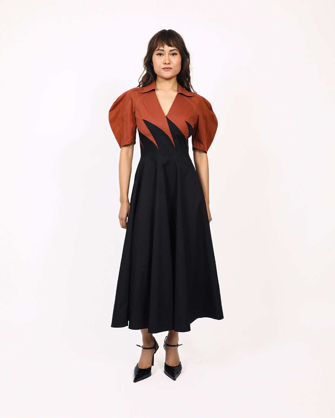 This dress is a blend of sophistication and contemporary design, featuring plunging V neckline that adds a touch of allure. The collar contrasts elegantly with the rest of the design. Contrasting top and bottom with yacht pointed panels that accentuate the silhouette , adding a bold angular flair and creating a visually dynamic effect. Further enchancing it with structured panel sleeves. Model wear size S model height is 5'8 garment length is 50"