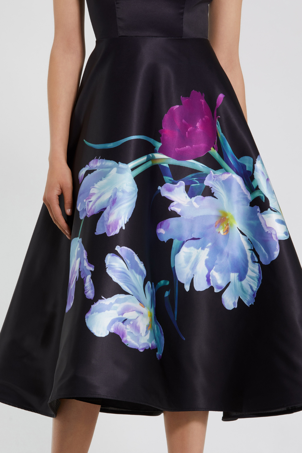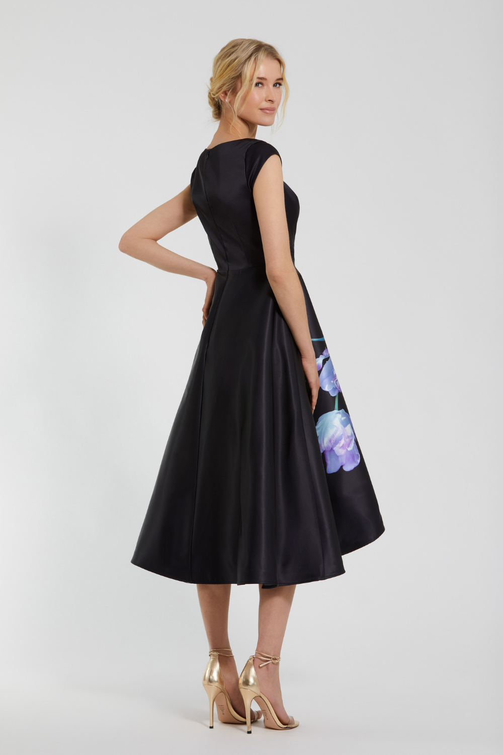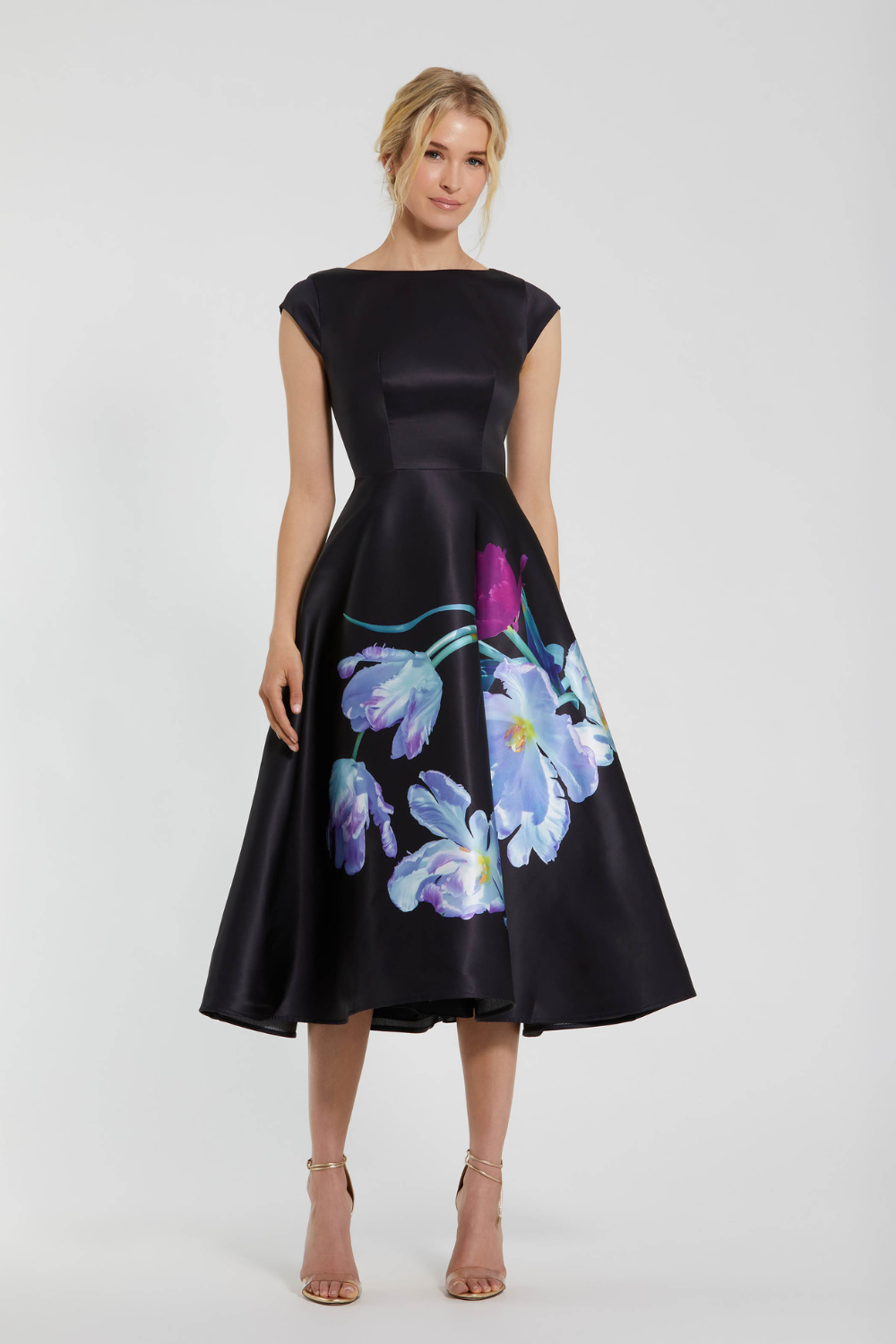 Black Satin Cap Sleeve Midi Dress With Floral Print