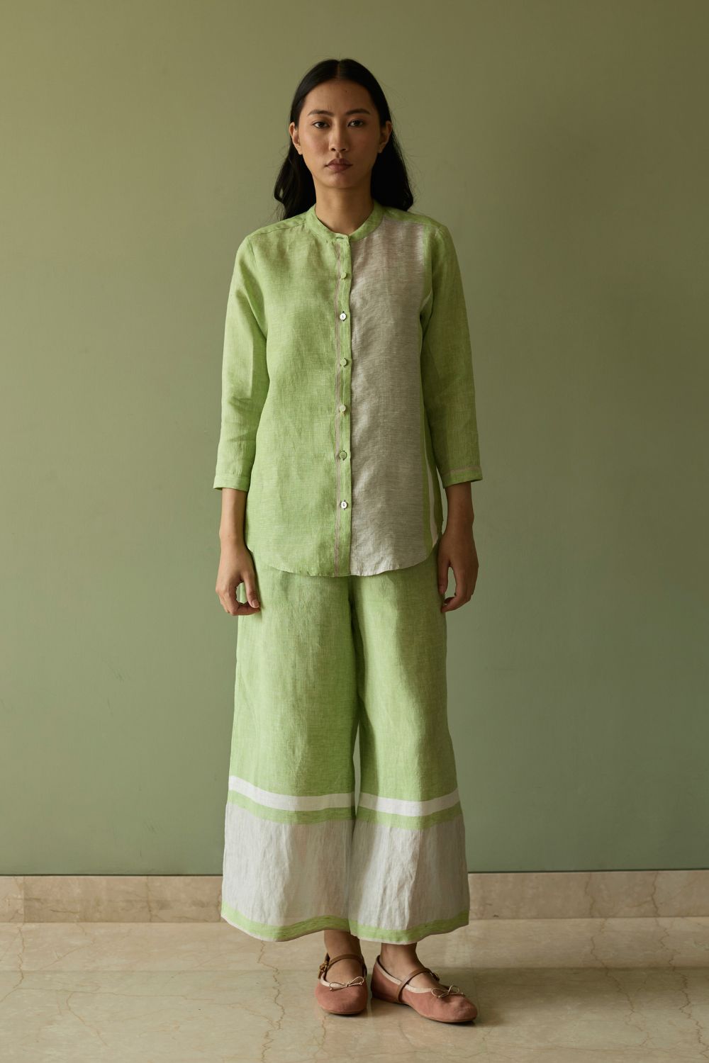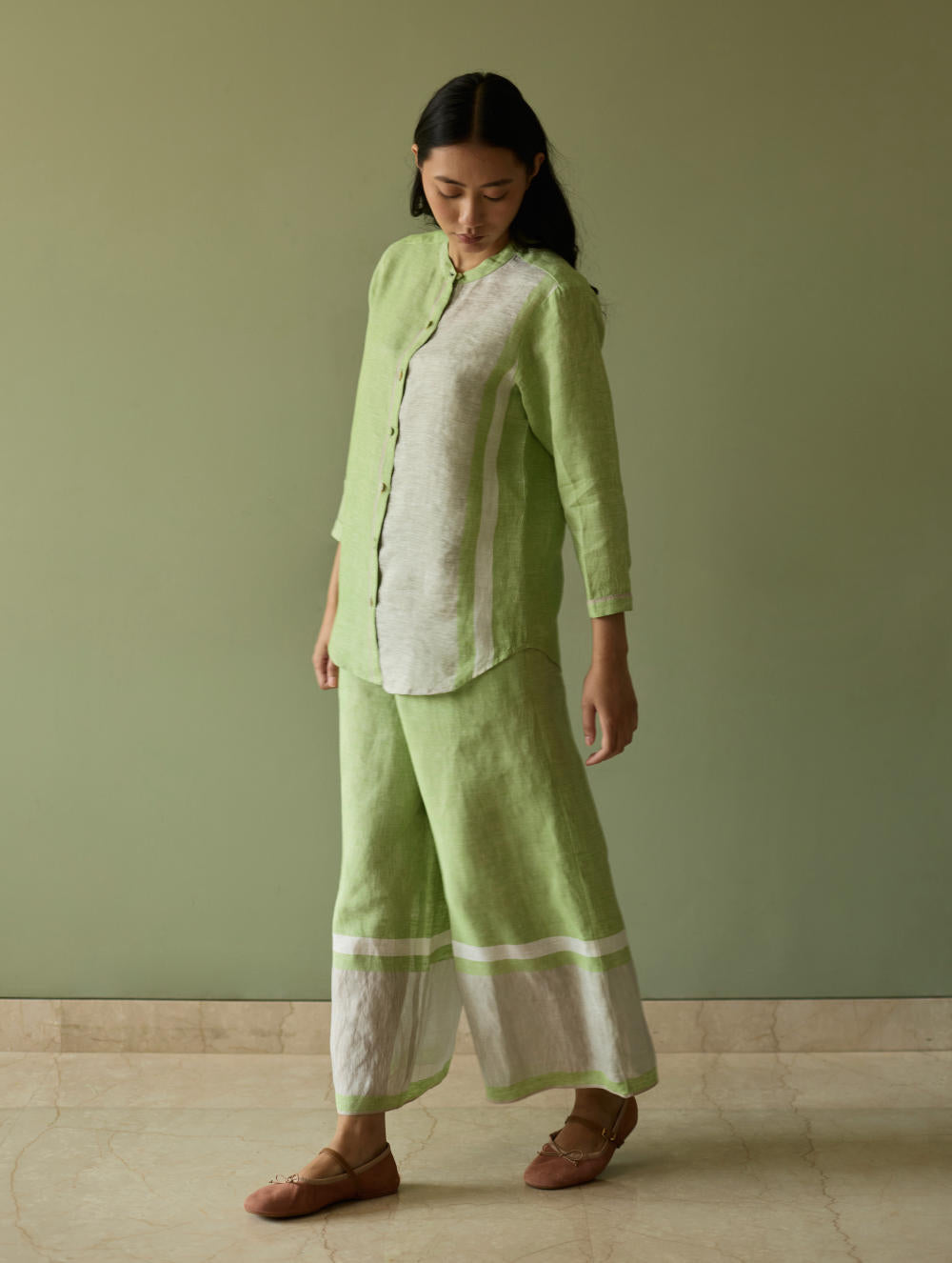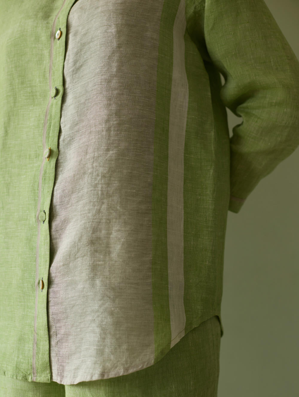 This forever mandarin-collared shirt is crafted from our signature soft handwoven metallic border linen. A subtle grey handwoven selvedge adds a quiet unique detail to the silhouette. The button-down placket is thoughtfully finished with a blend of linen fabric and mother-of-pearl buttons, while the 3/4th sleeves are ideal for an informal or formal look.