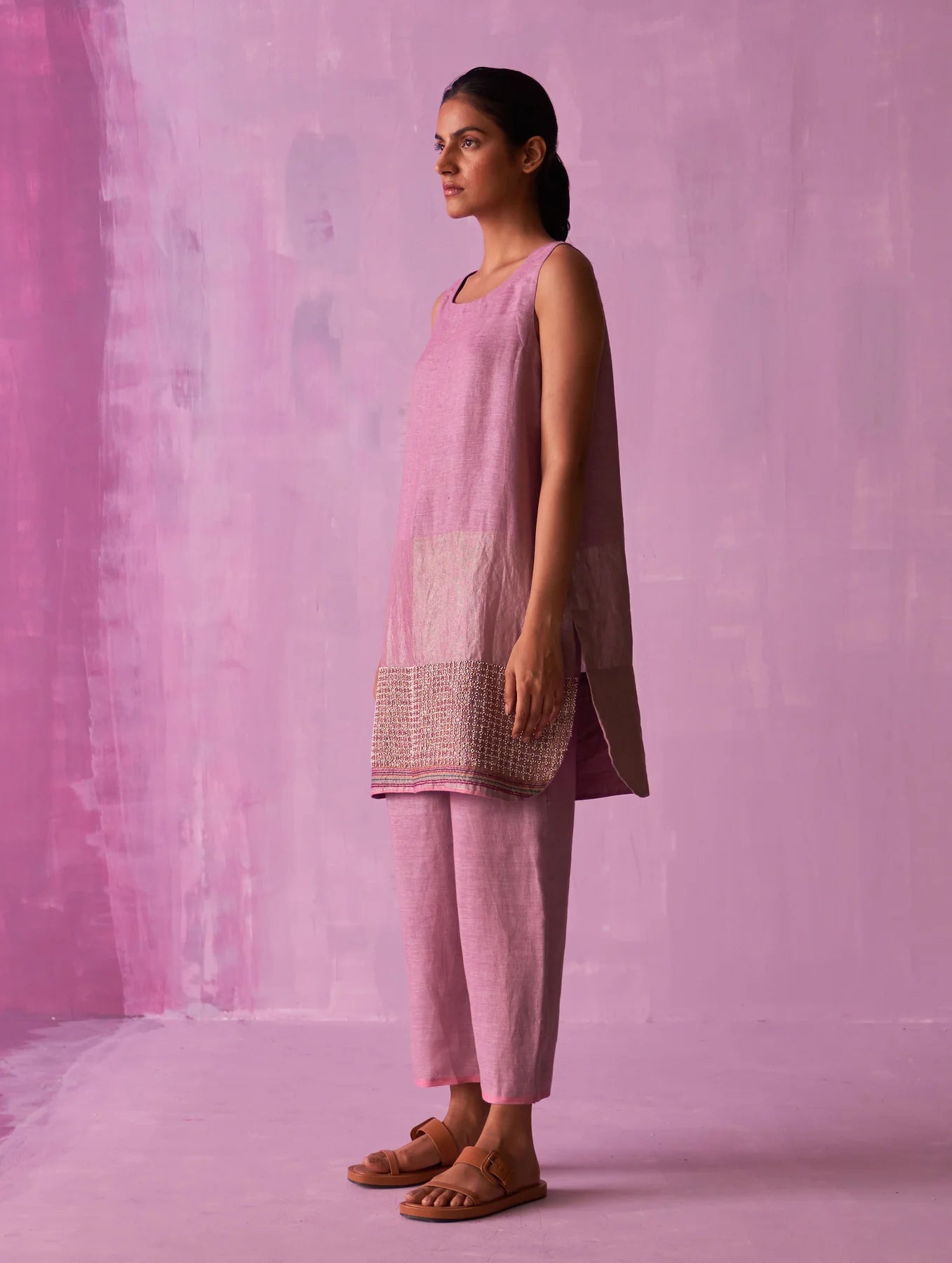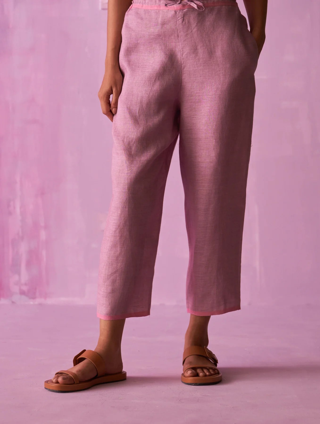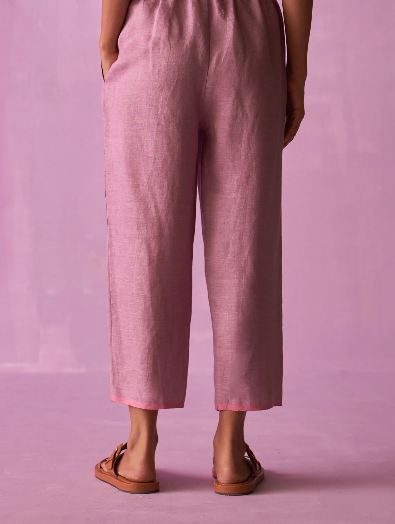 Our forever tapered pants with pockets, elasticated back waistband with drawstring handcrafted in our handwoven linen finished with pop-coloured woven selvedge.