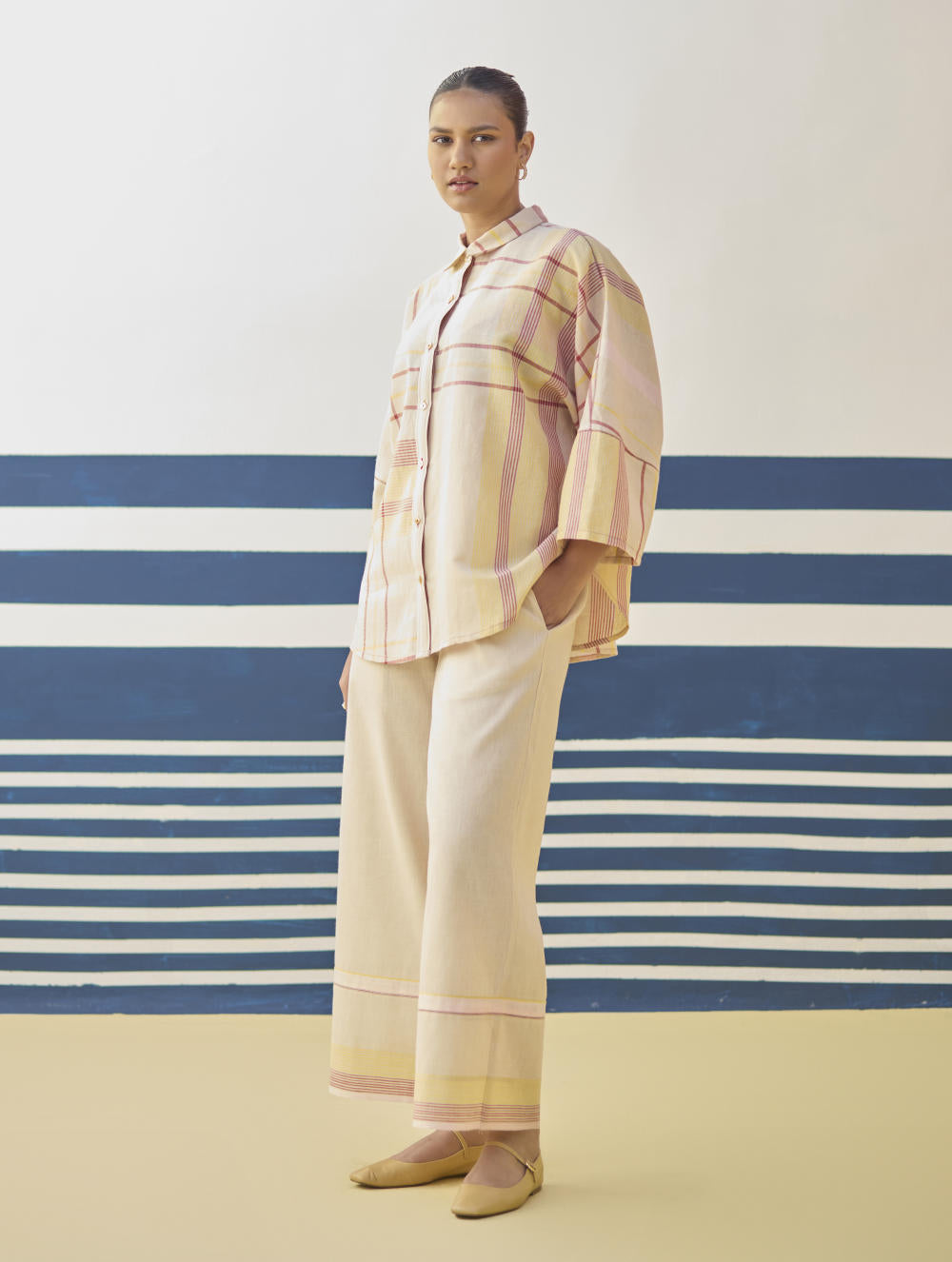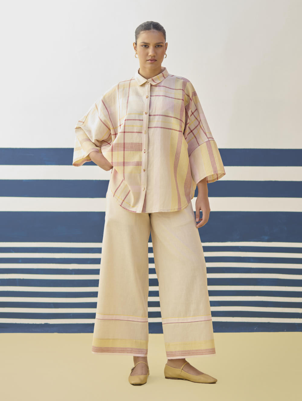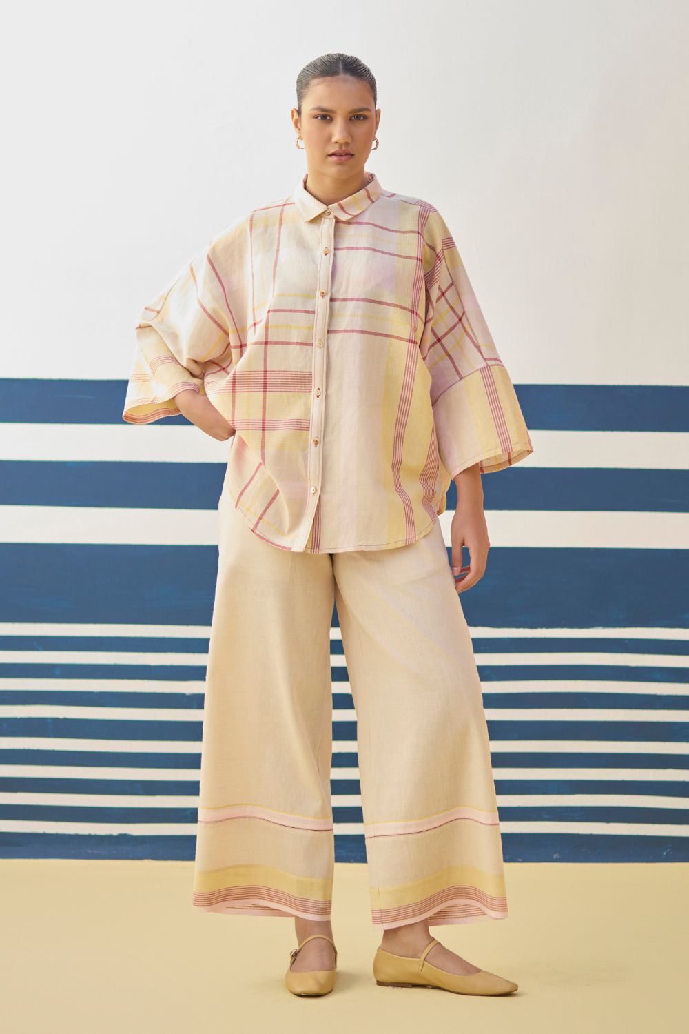 Top- A chic flared shirt with a dolman sleeve in our handloom linen cottoon woven in an contemporary checke stripe pattern, finished with mother of pearl buttons and handmade jaali (mesh) stitch in pop-coloured threads. Pant- Classic palazzo pants handcrafted in our handloom linen cotton with a handwoven stripe border. Lyla has comfortable pockets, handmade jaali (mesh) detailing and an soft elasticated back waistband with a drawstring.