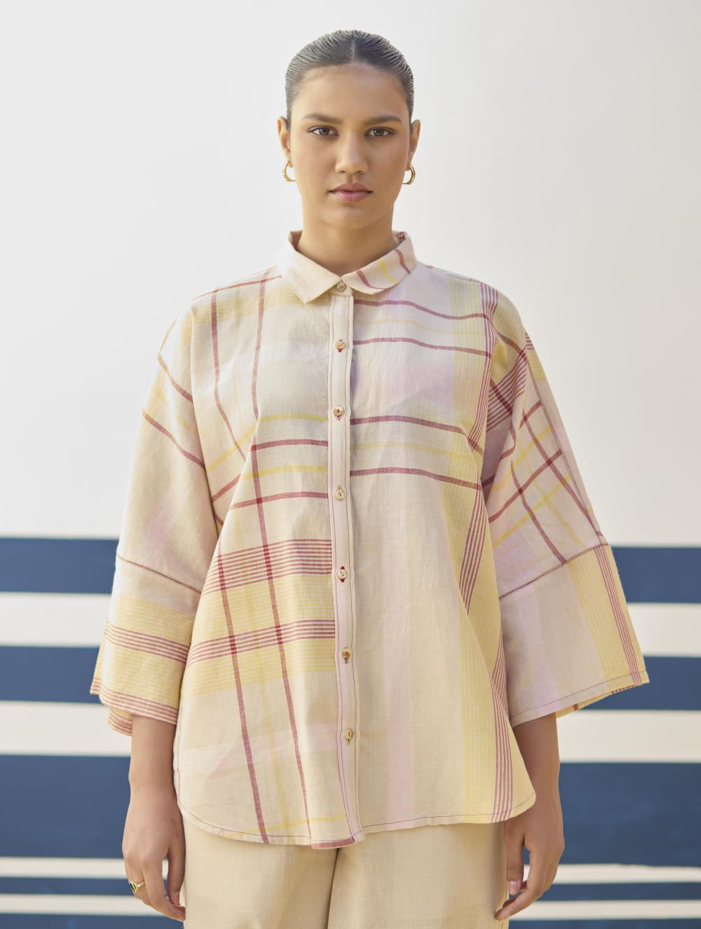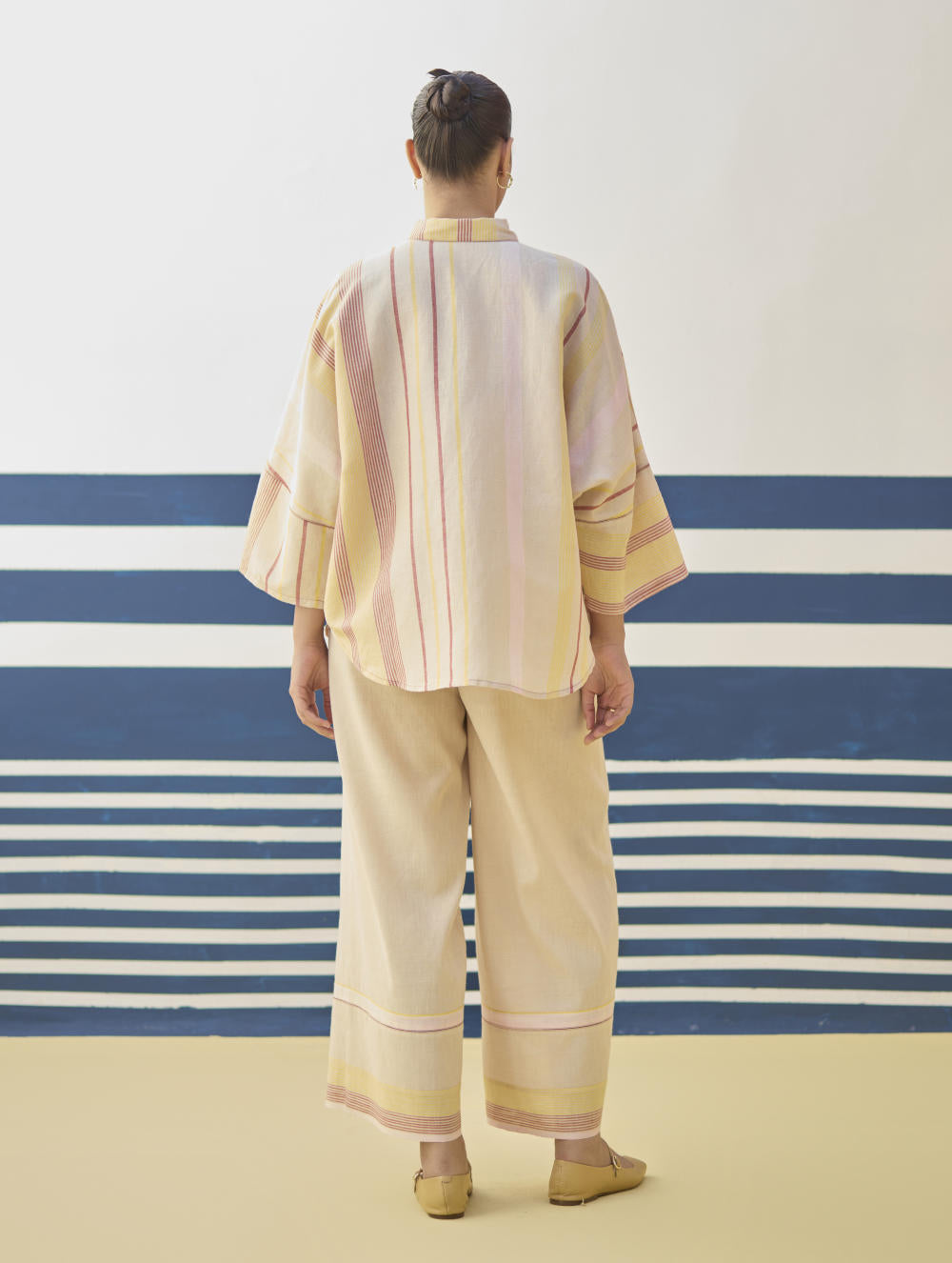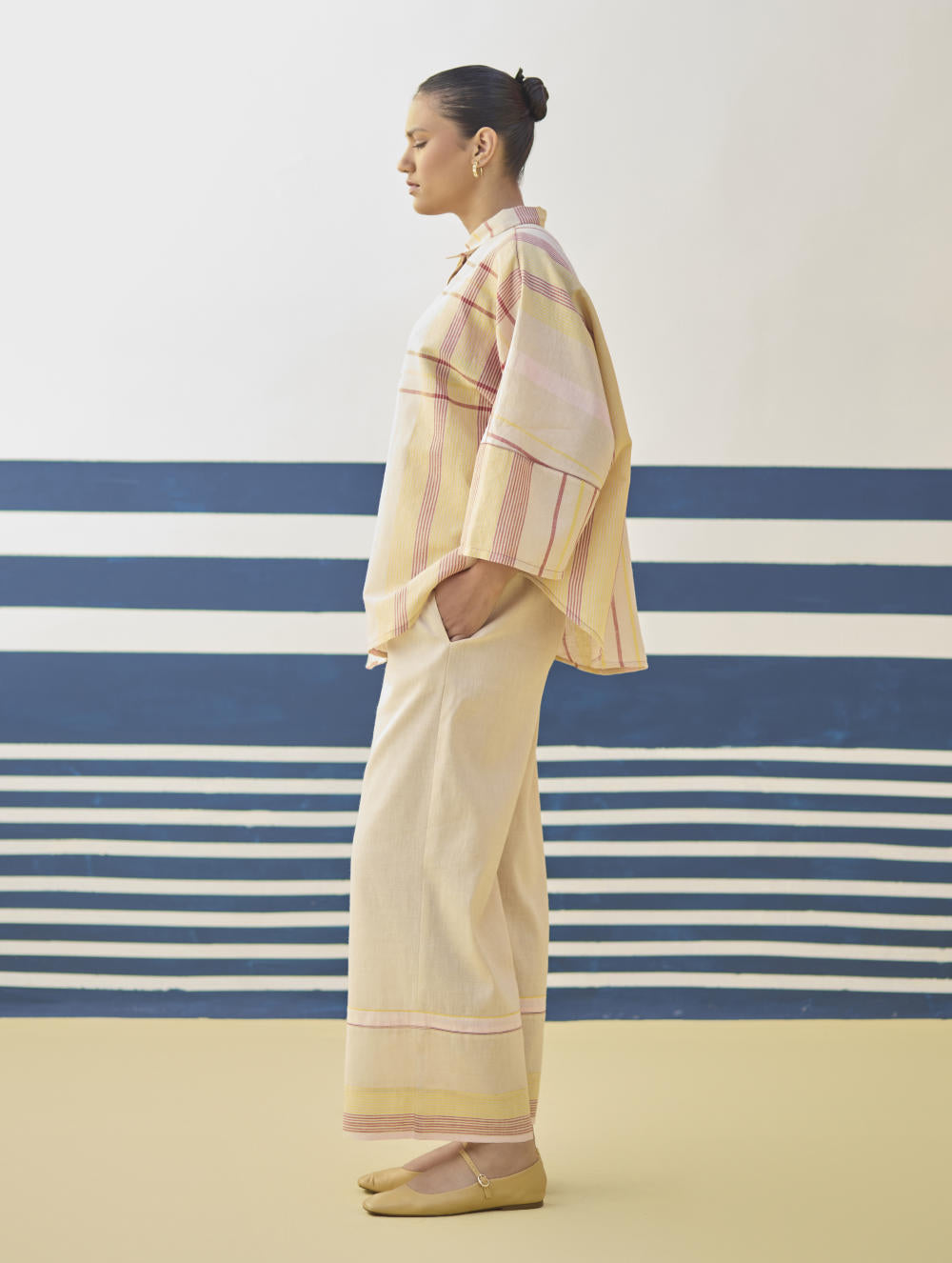 Top- A chic flared shirt with a dolman sleeve in our handloom linen cottoon woven in an contemporary checke stripe pattern, finished with mother of pearl buttons and handmade jaali (mesh) stitch in pop-coloured threads. Pant- Classic palazzo pants handcrafted in our handloom linen cotton with a handwoven stripe border. Lyla has comfortable pockets, handmade jaali (mesh) detailing and an soft elasticated back waistband with a drawstring.