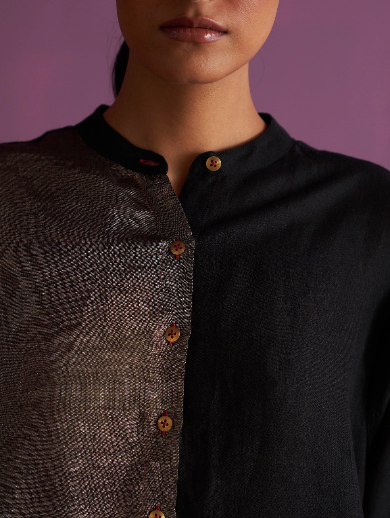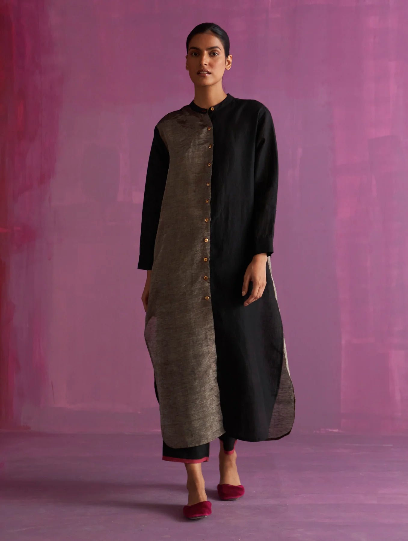 Top - A mandarin collared long button-down shirt kurta with a metallic zari front, pop-coloured woven selvedge, high side-slits and metallic brass buttons. Pant - Our forever tapered pants with pockets, elasticated back waistband with drawstring handcrafted in our handwoven linen finished with pop-coloured woven selvedge.