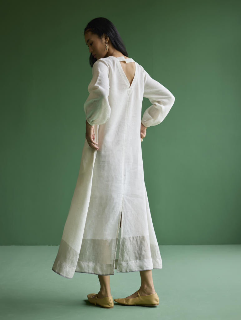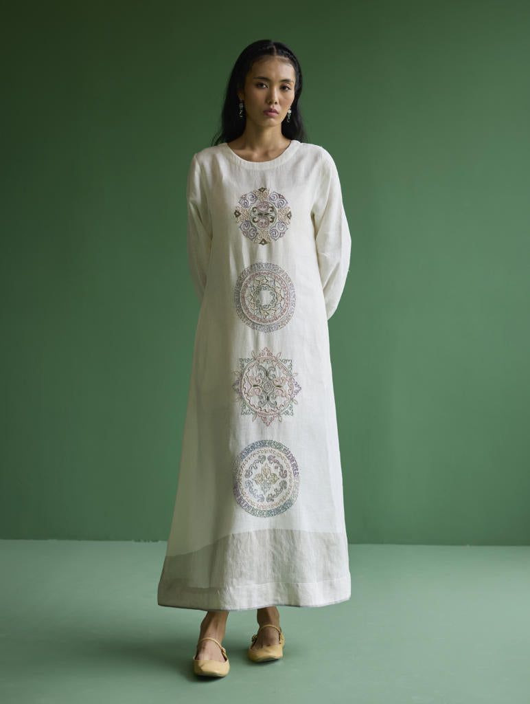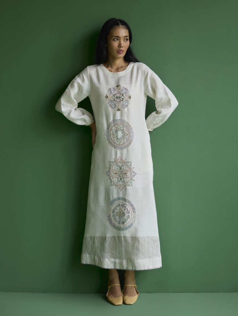 Our favorite Eira dress has intricate hand-embroidered textured suzani motifs in multicolor threads and beads. The boat-neck dress is designed in our signature handloom linen with a metallic solid woven border, ochre-colored selvage, woven stripes along the hemline, full sleeves and pockets.