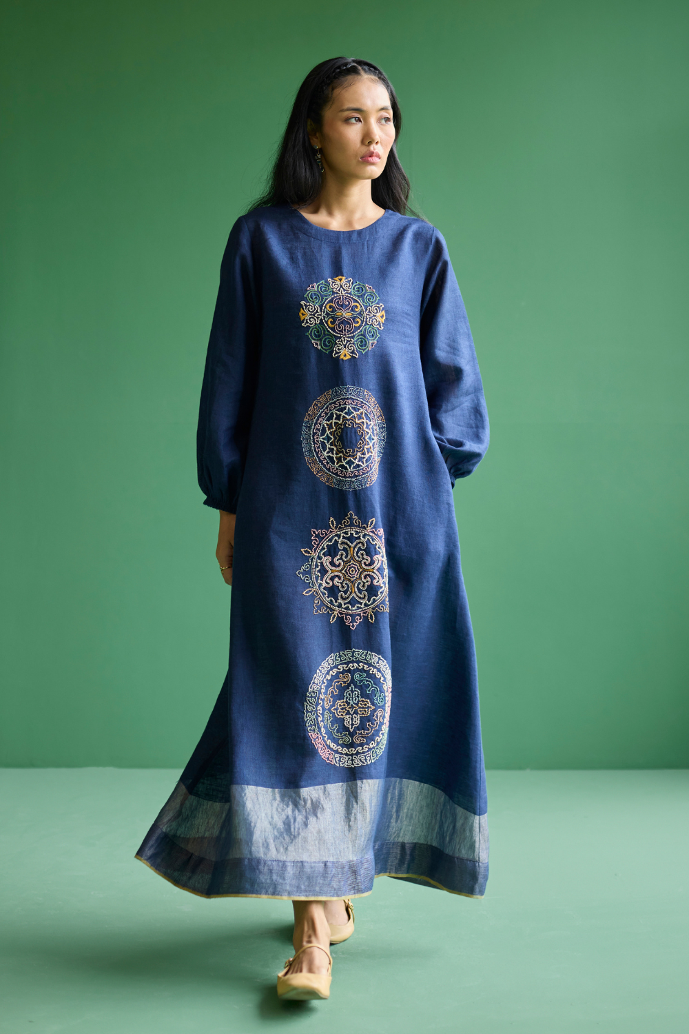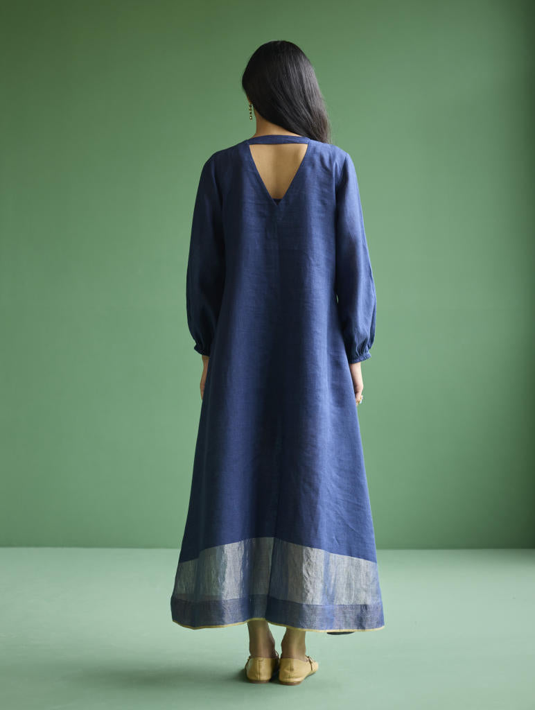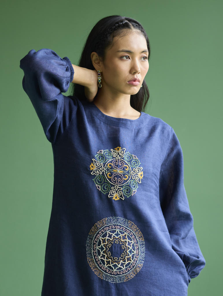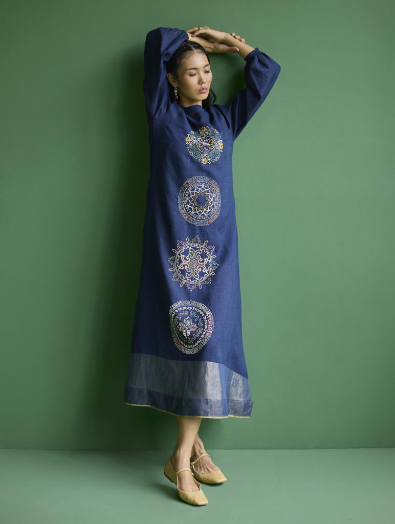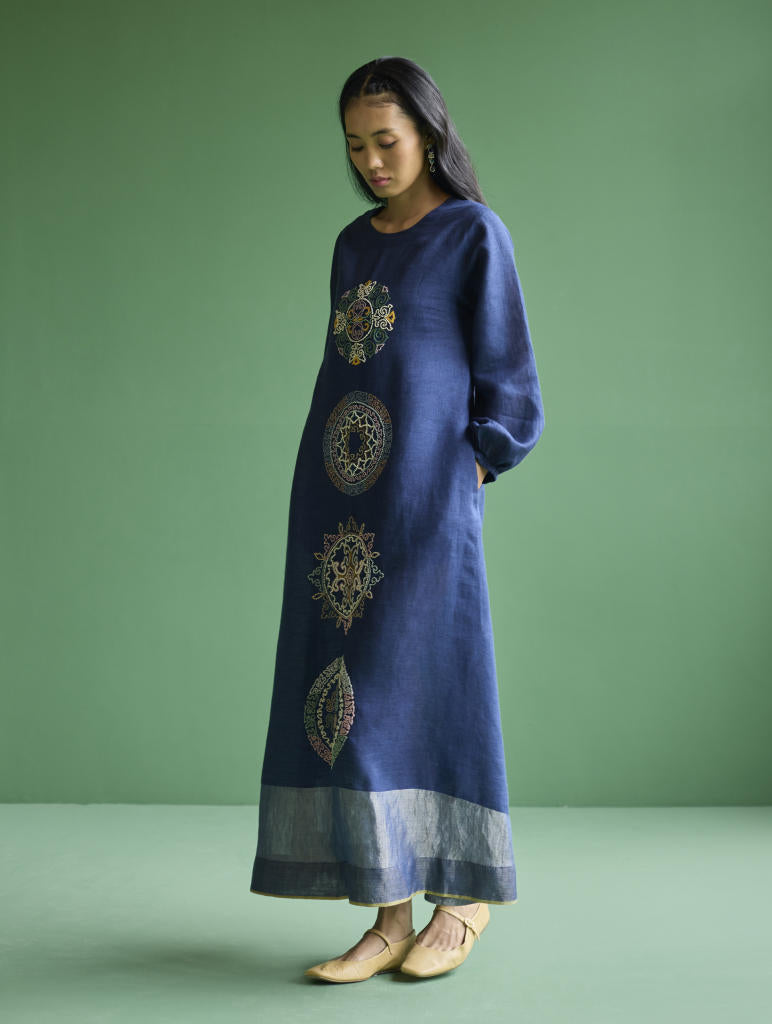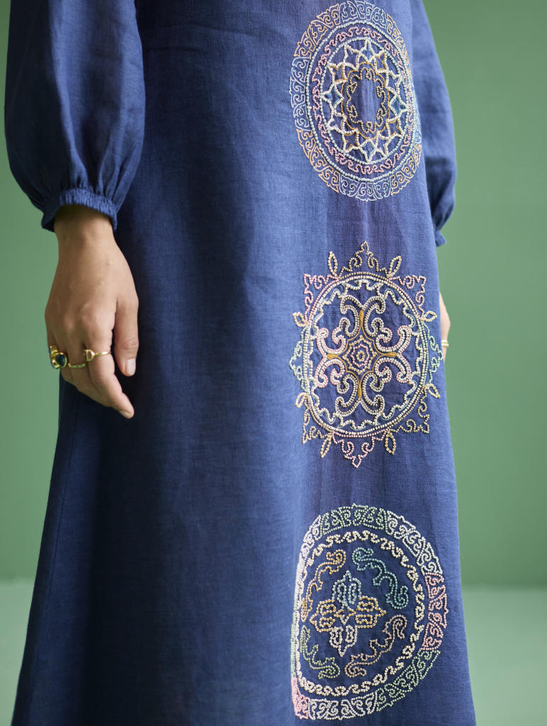 Our favorite Eira dress has intricate hand-embroidered textured suzani motifs in multicolor threads and beads. The boat-neck dress is designed in our signature handloom linen with a metallic solid woven border, ochre-coloured selvedge, woven stripes along the hemline, full sleeves and pockets.