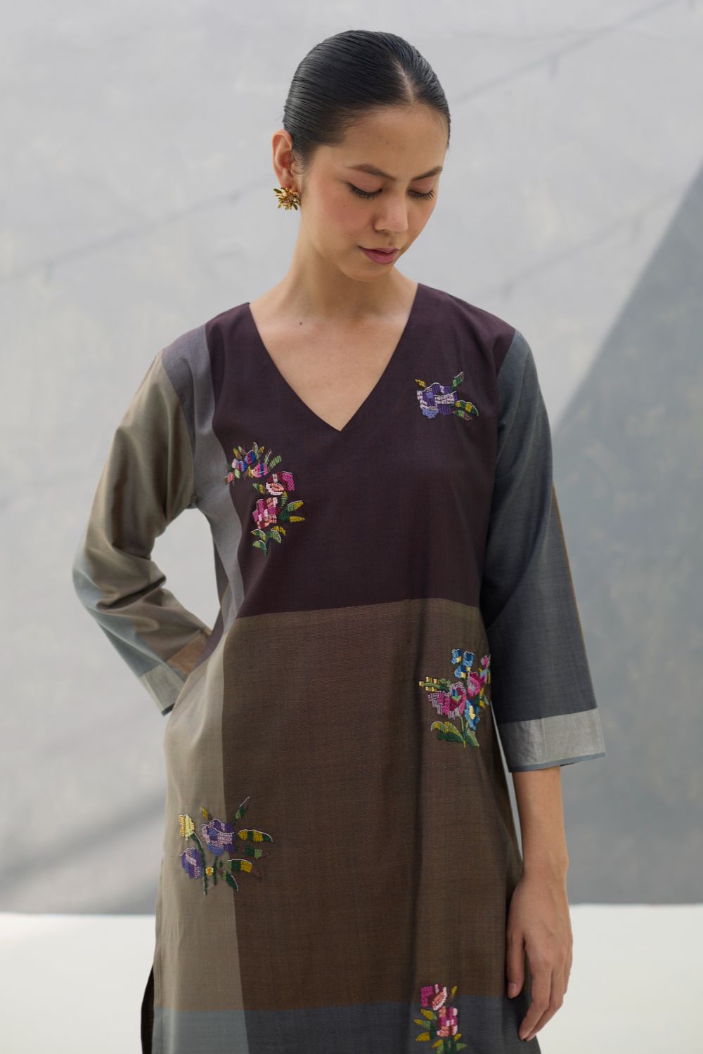 This forever kurta is designed in our handwoven eri (ahimsa) silk featuring, designed with an oversized colour-block check pattern in 4-5 shades. The intricate multi-textural hand embroidery on the kurta is inspired from 18th Century Victorian textiles giving an impact of pixelated floral motifs - a modern take enhanced by varying threadwork and subtle beadwork. Highlighted dabka accents—traditional zari work—lend a soft metallic sheen to the embroidery. Designed with a flattering V-neckline and three-quarter sleeves, the Nira Kurta is finished with a thoughtfully placed metallic border on the cuffs and hem, flawlessly blending timeless craftsmanship with a modern edge.