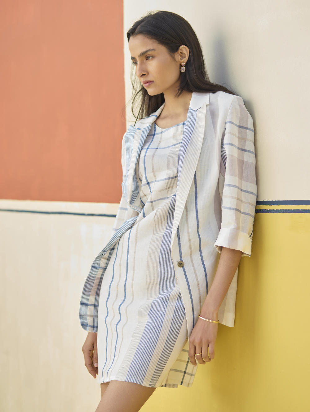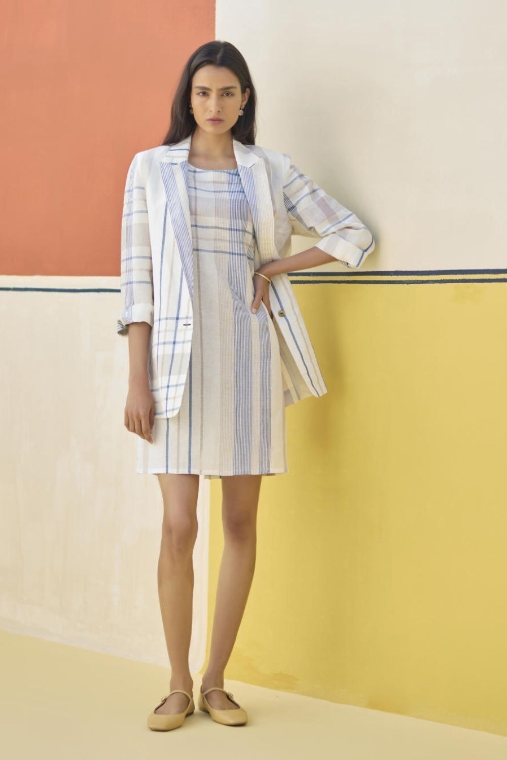 Dress- A sleeveless shift dress in our soft handloom linen cotton check, intricately detailed with a hand-jaali stitch at the centre back ending with a short side slit. An easy timeless shift dress that can be dressed up or down as needed. Blazer-Tailored blazer designed in our soft handloom linen cotton woven with a modern check pattern. Finished with timeless mother-of-pearl buttons, Talia exudes sophistication and timeless style.