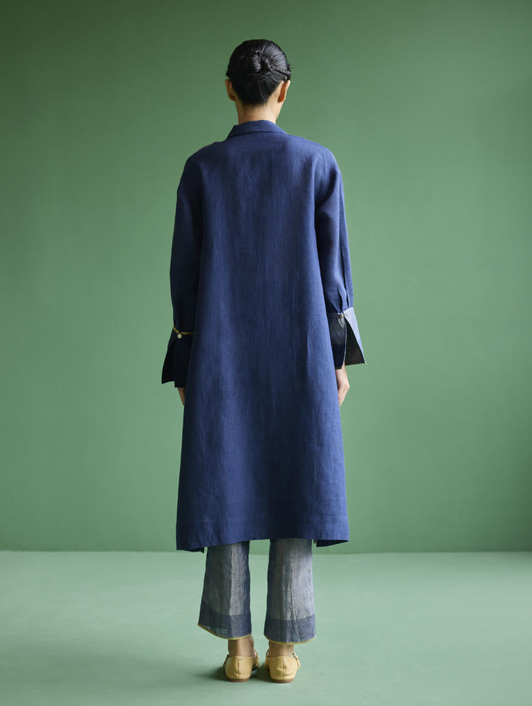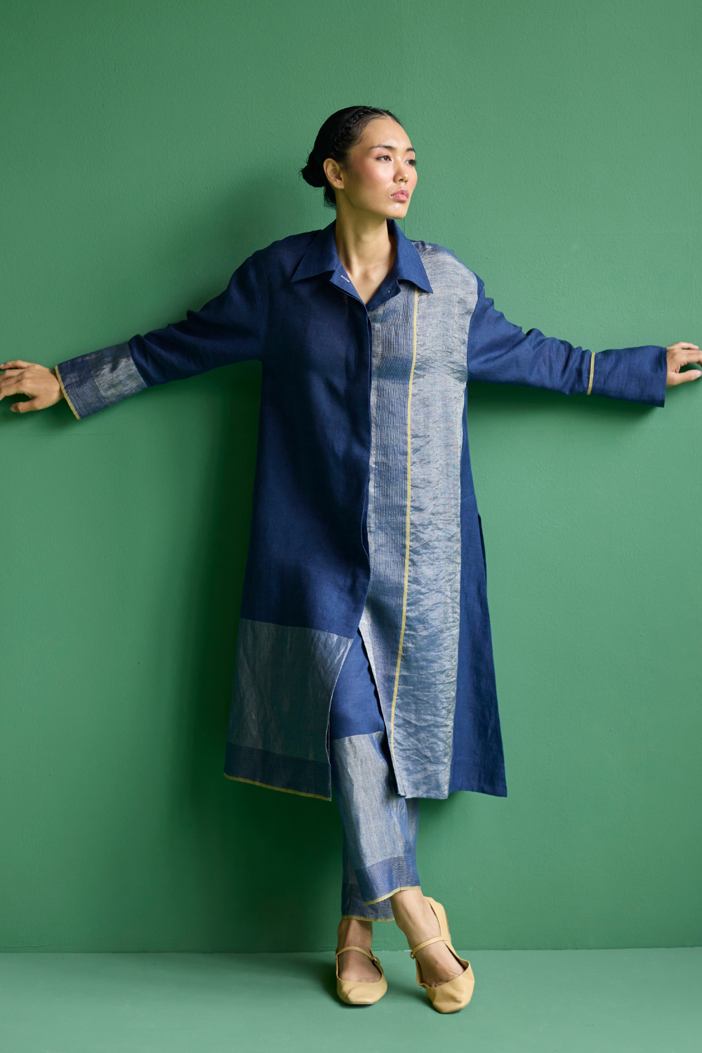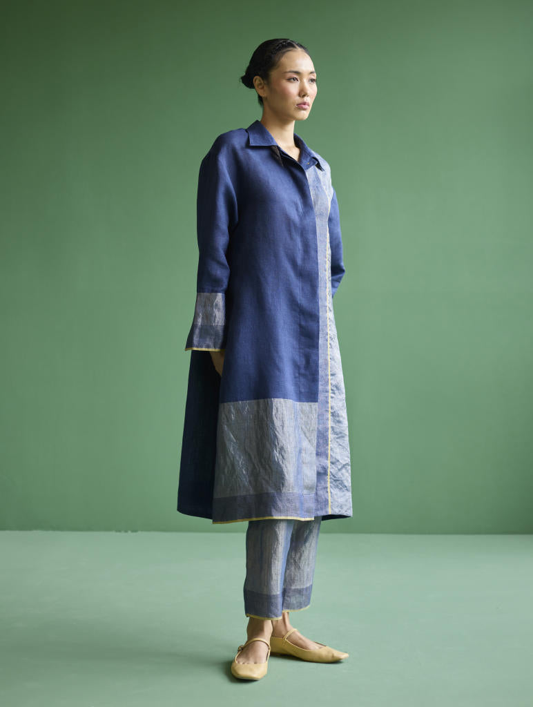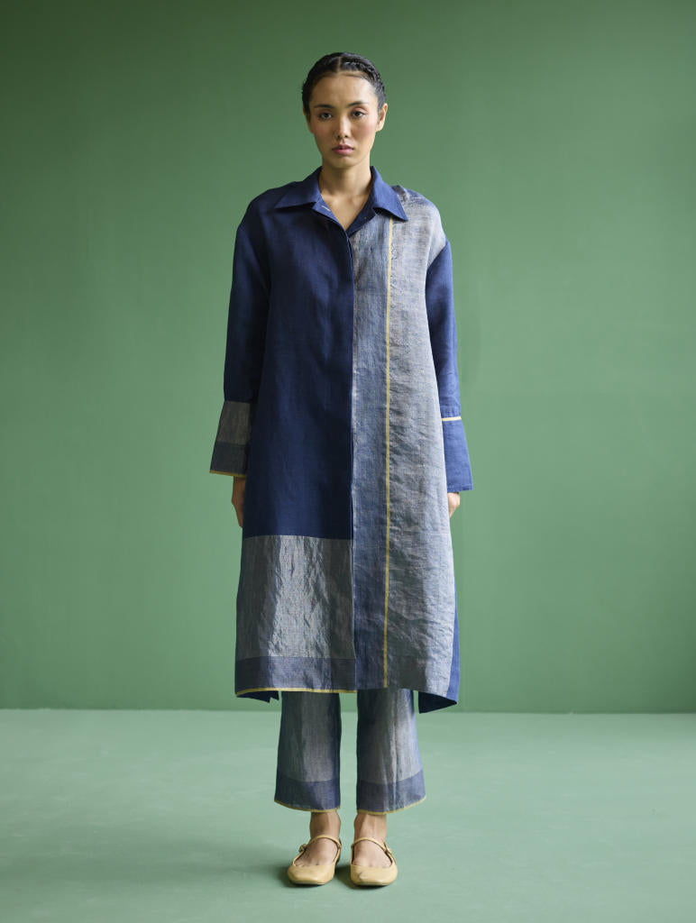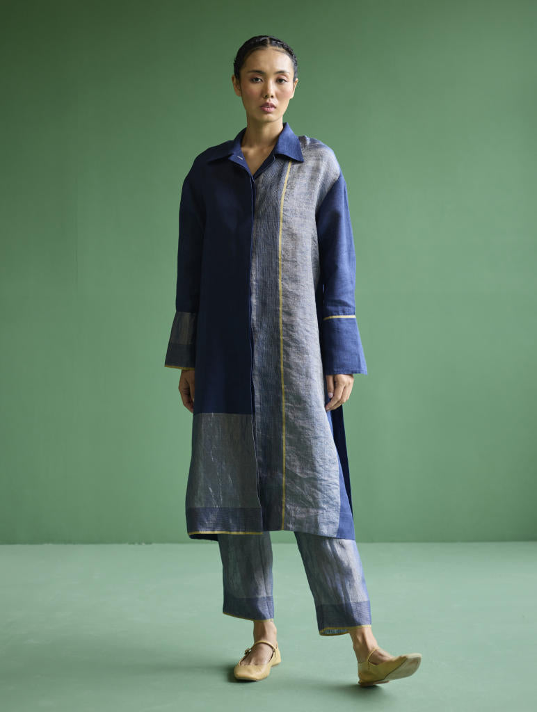 The collared shirt-style kurta is handcrafted from our signature yarn-dyed soft handloom metallic border linen with a stripe border weave placed vertically adjacent to the placket and ochre-colored selvage. It has a statement shirt collar, a button-down front, high side-slits and metallic brass buttons.