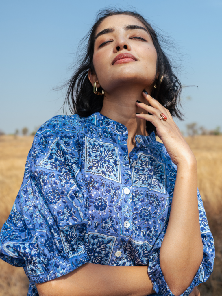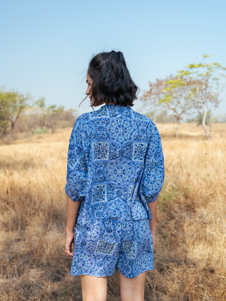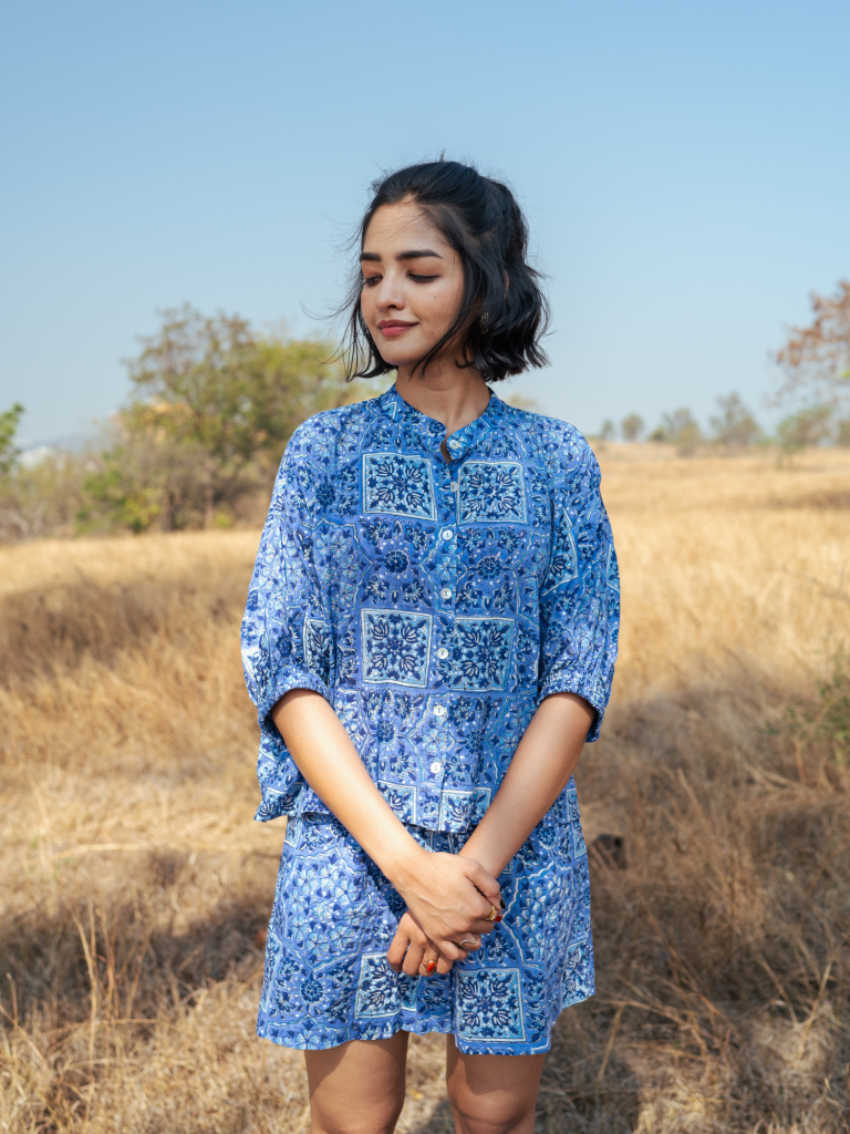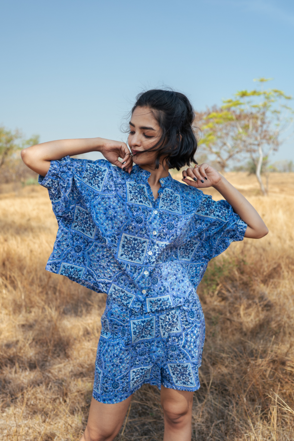 Wanderlust : A collection inspired by the free-spirited wanderlust in us and the adventures that we undertake. A collection of easy, ready-to-wear pieces hand block printed in fresh prints and colour palettes on summer-friendly cotton and mul. Kaftan sleeve top paired with high-rise shorts are what our summer uniform consists of. It loves all body types and we love it for all that it is. Cotton, handblock printed in brightest hues.