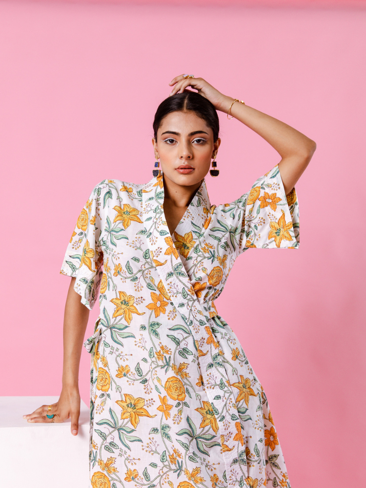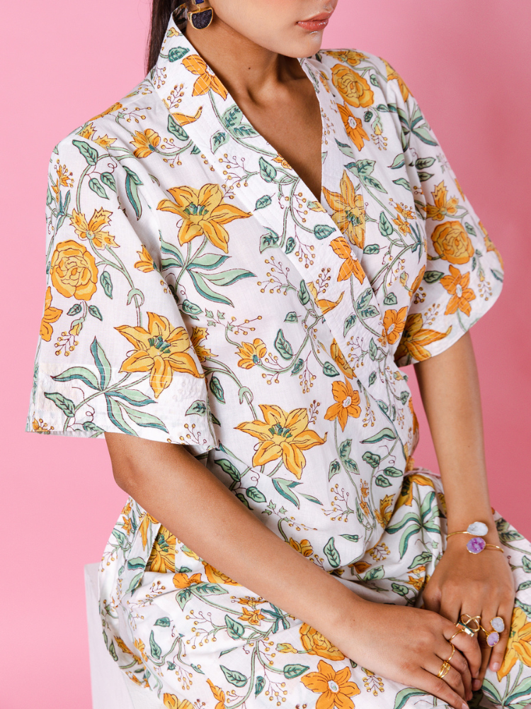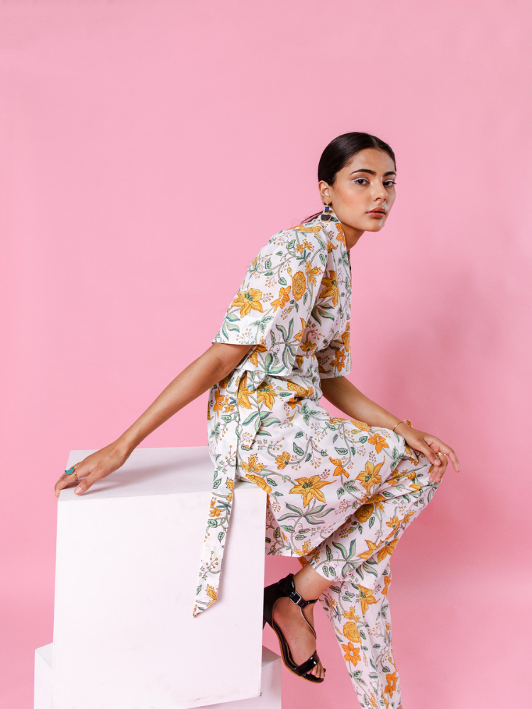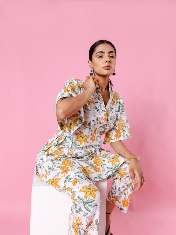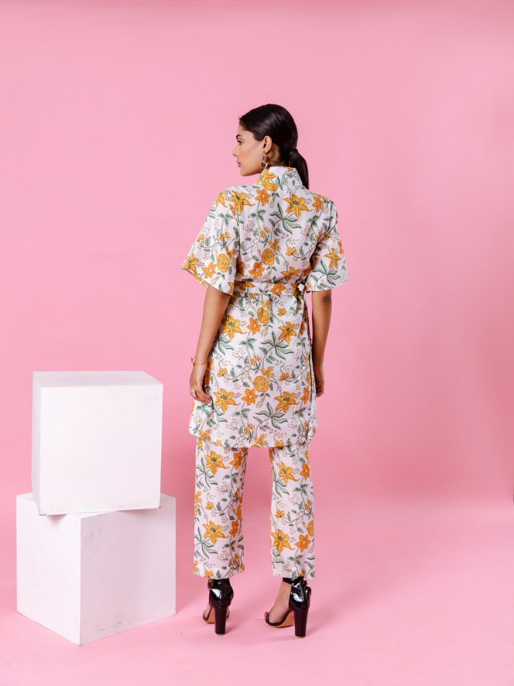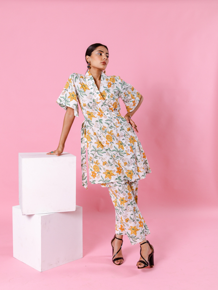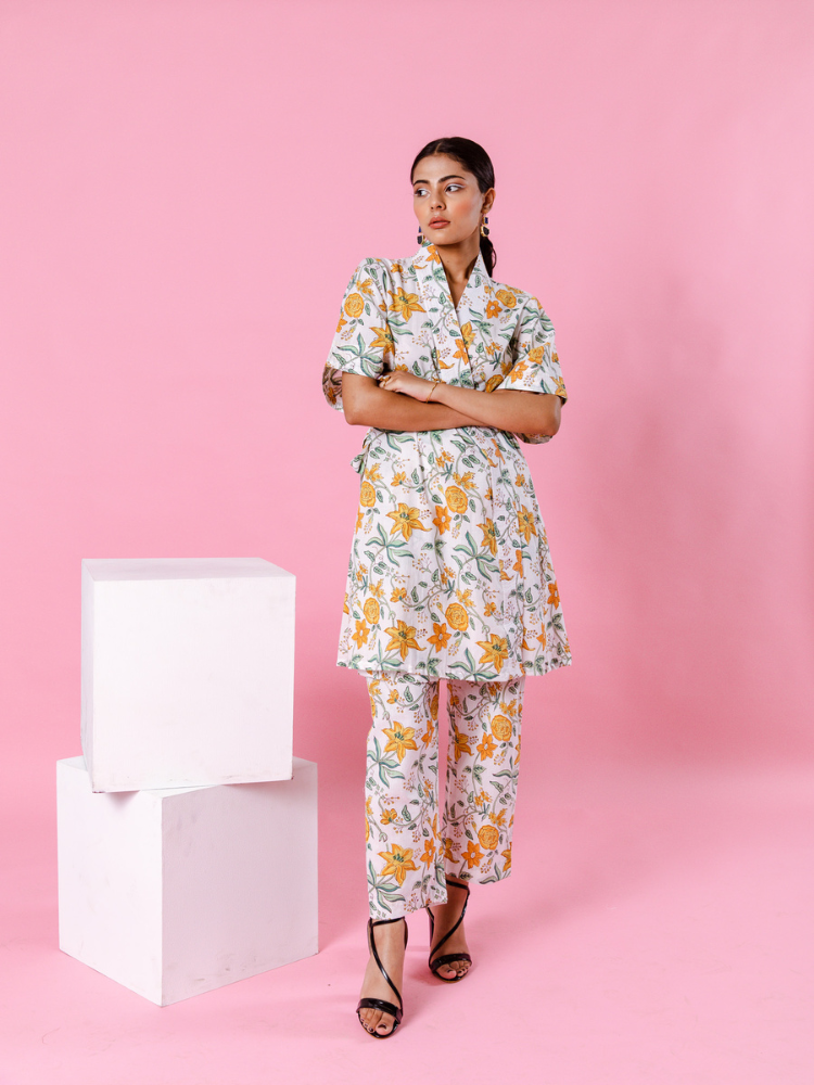 Product Type: Co-ord Set Delilah - Bright like the summer sun and beautiful like the first dawn of spring. Our forever essential kimono co-ords for summer. Florals on ivory remind us of English summers. This set consists of a hand-block printed kimono paired with matching trousers.
