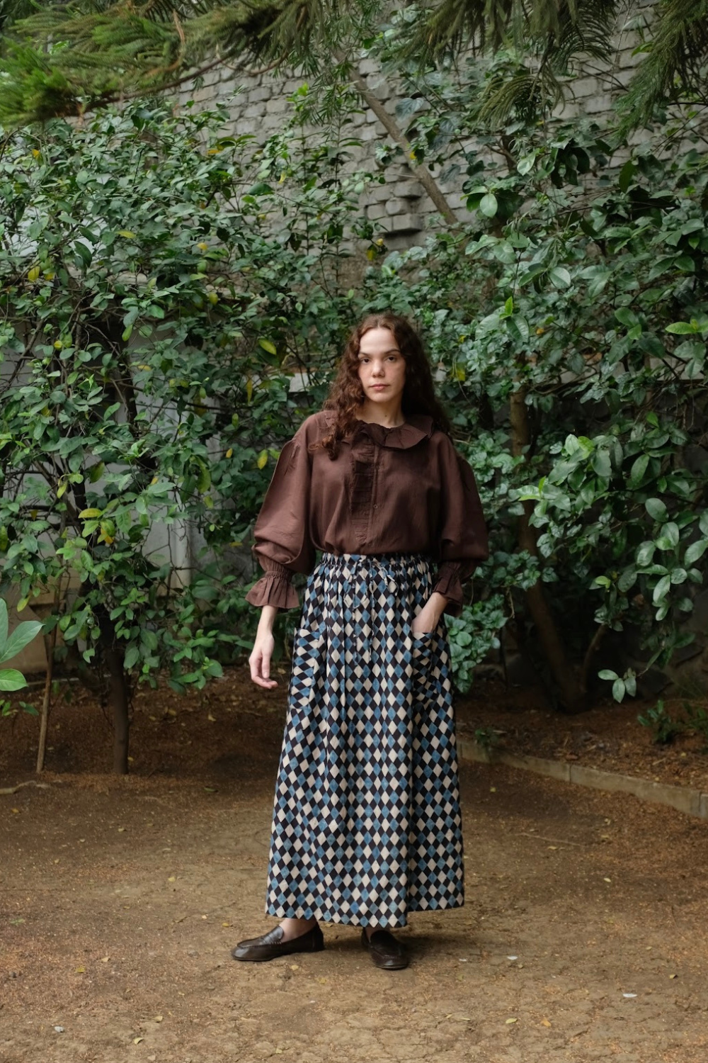A skirt cut from handwoven cotton silk, hand block printed using natural dyes and 'Ajrakh' technique. Designed with an elasticated waist and adjustable drawstrings, that hold together a bunch of textile that gathers to form our favourite skirt. Finished with functional patch pockets at the front, the piece balances craft, comfort, and quiet character.