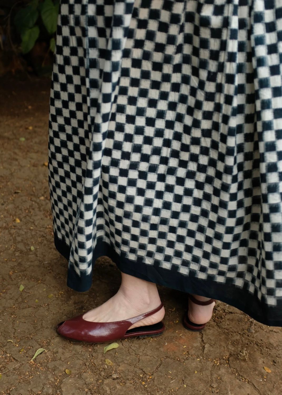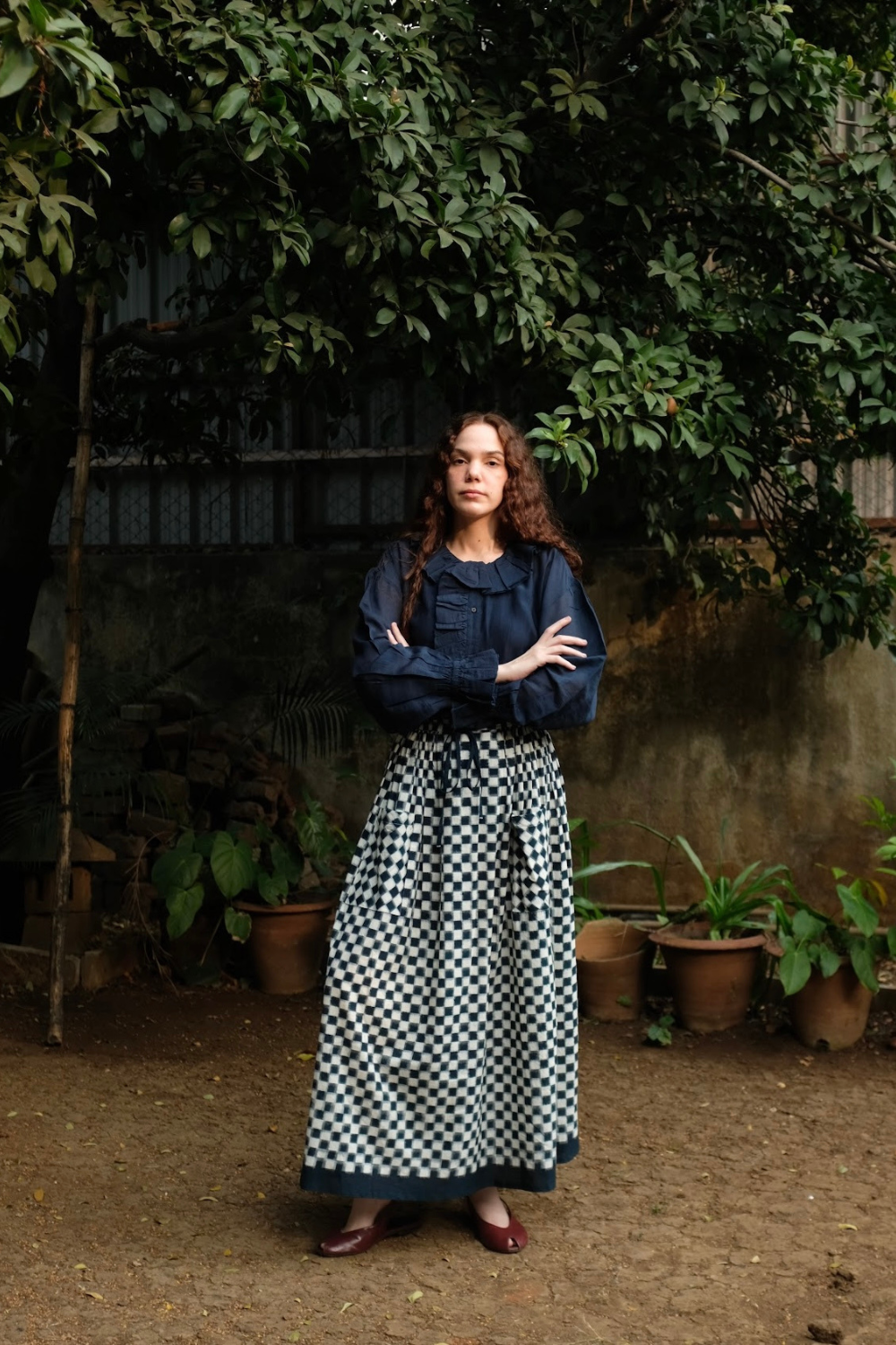 A skirt cut from handwoven Double Ikat, hand dyed using organic indigo dye. Designed with an elasticated waist and adjustable drawstrings, that hold together a bunch of textile that gathers to form our favourite skirt. Finished with functional patch pockets at the front, the piece balances craft, comfort, and quiet character.