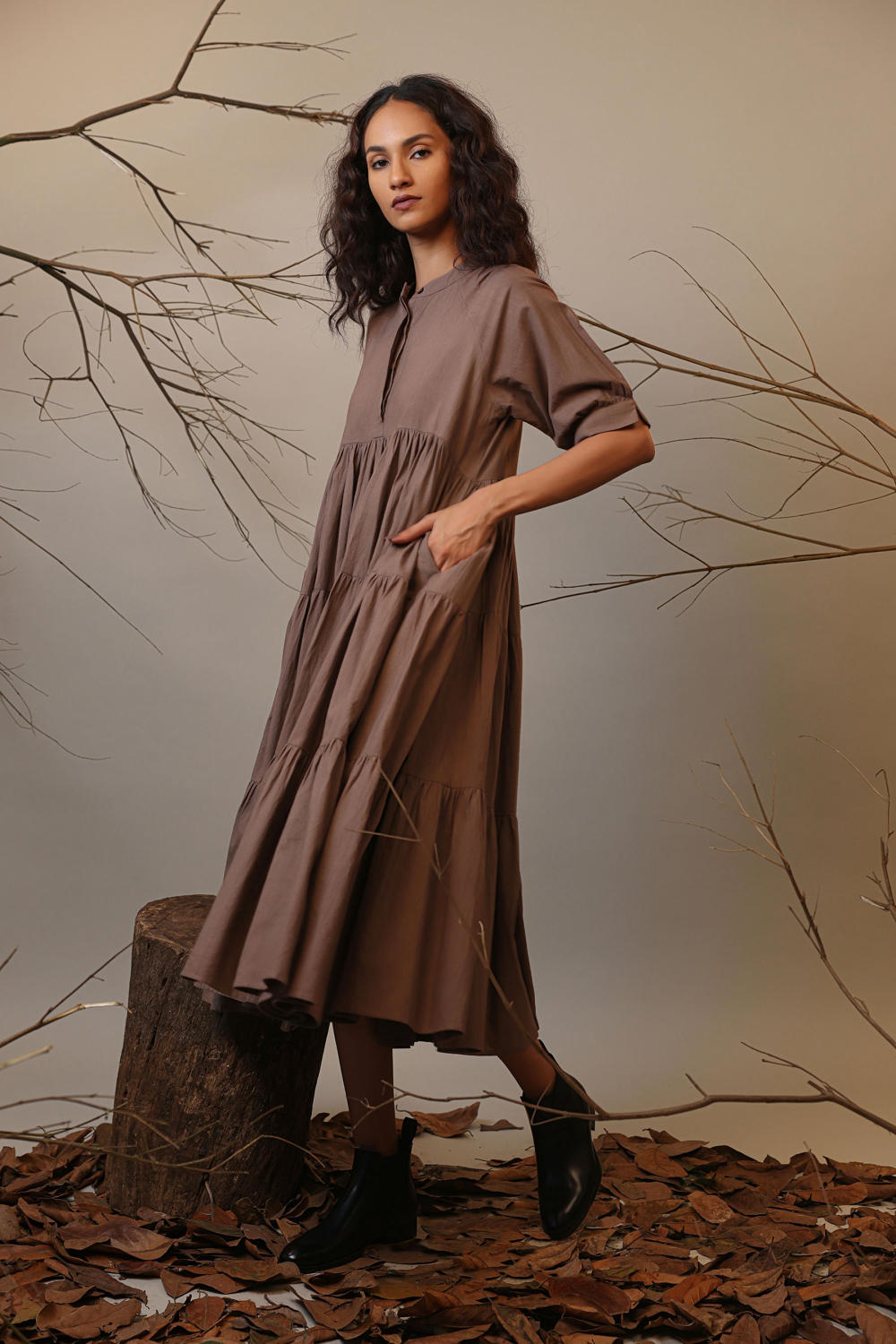 Tiered raglan dress made in handspun cotton with side pockets
