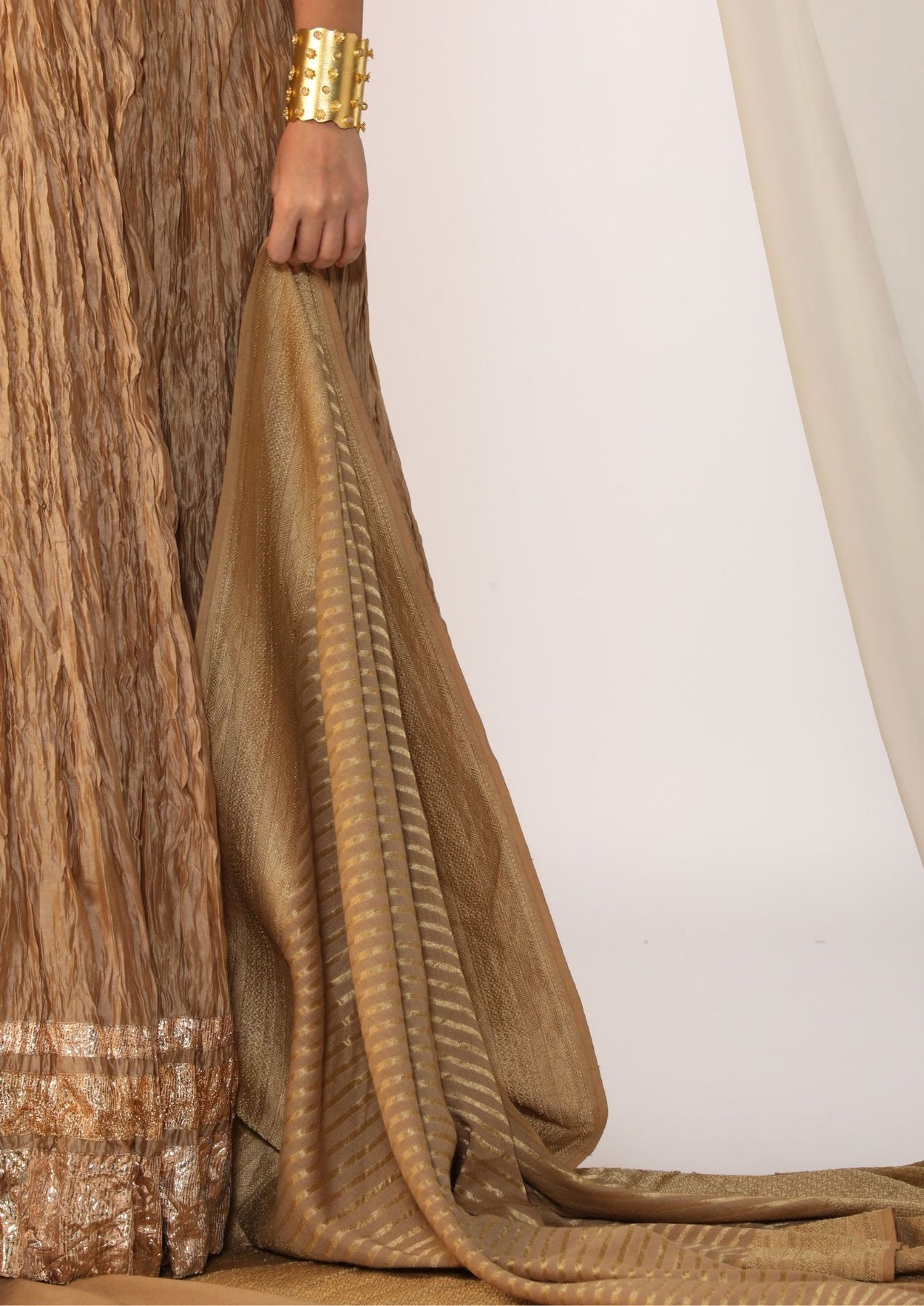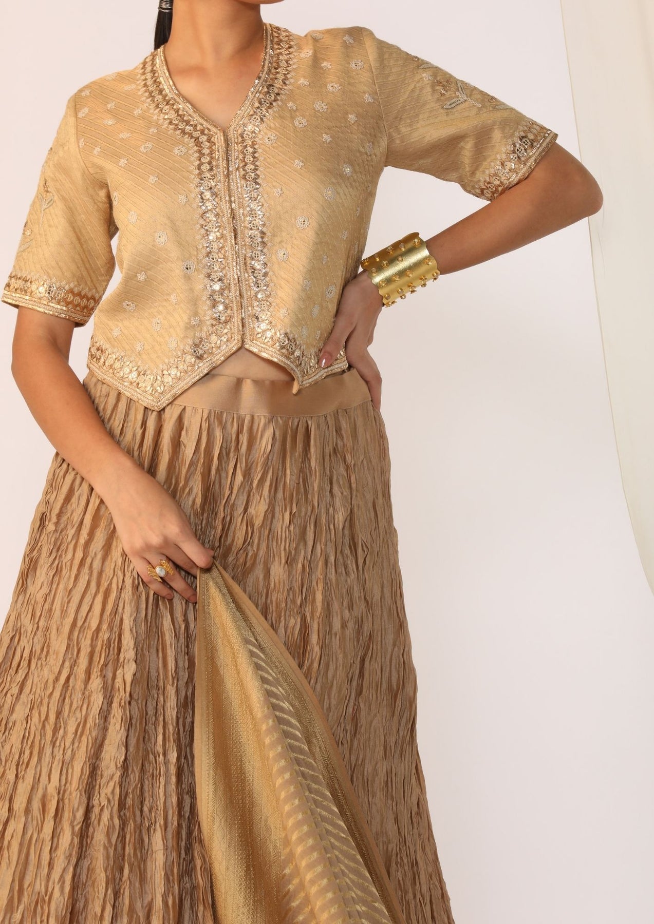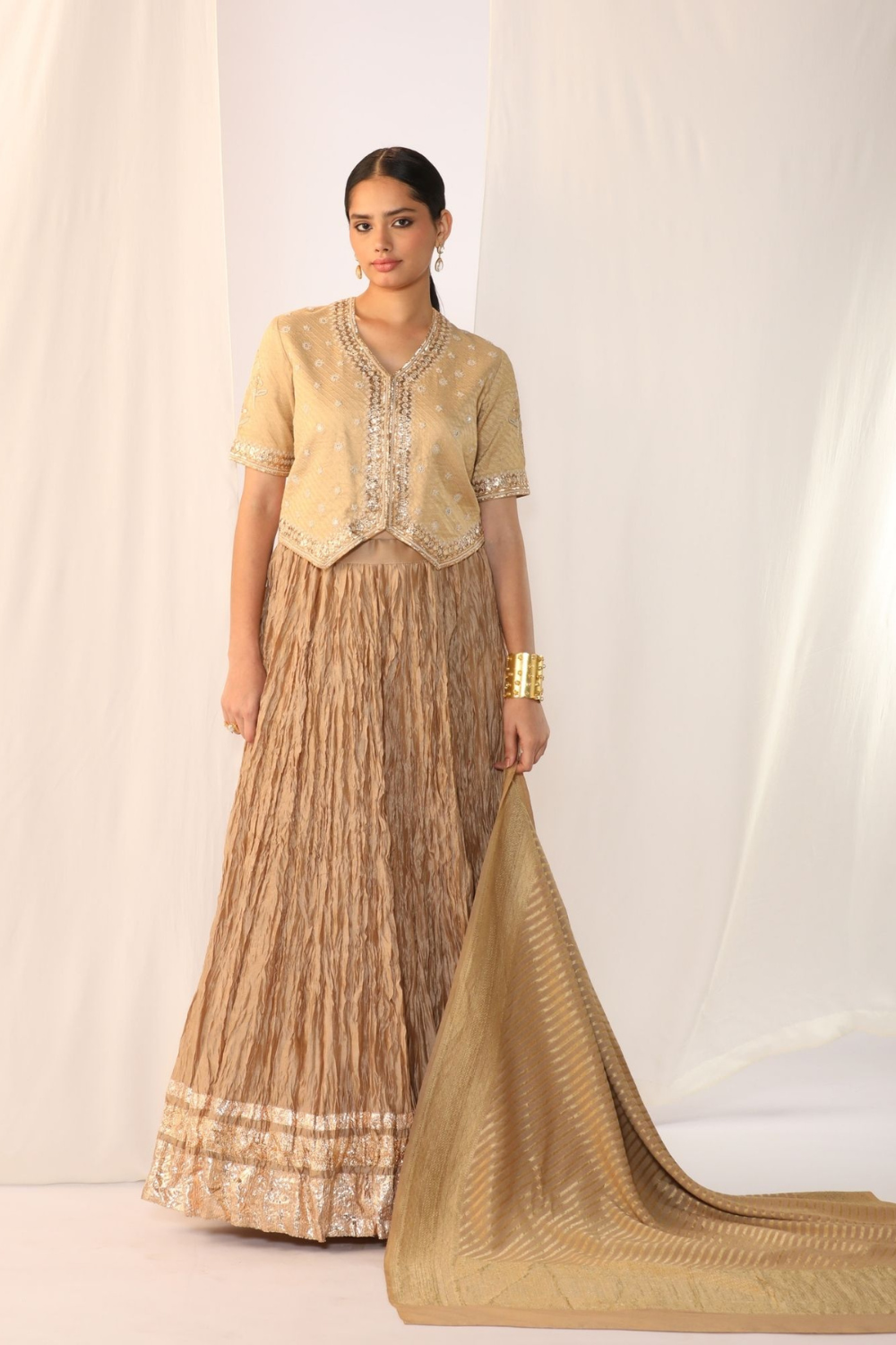Jacquard waistcoat top paired with a crushed skirt adorned with gota lace, complemented by a rich Banarasi dupatta