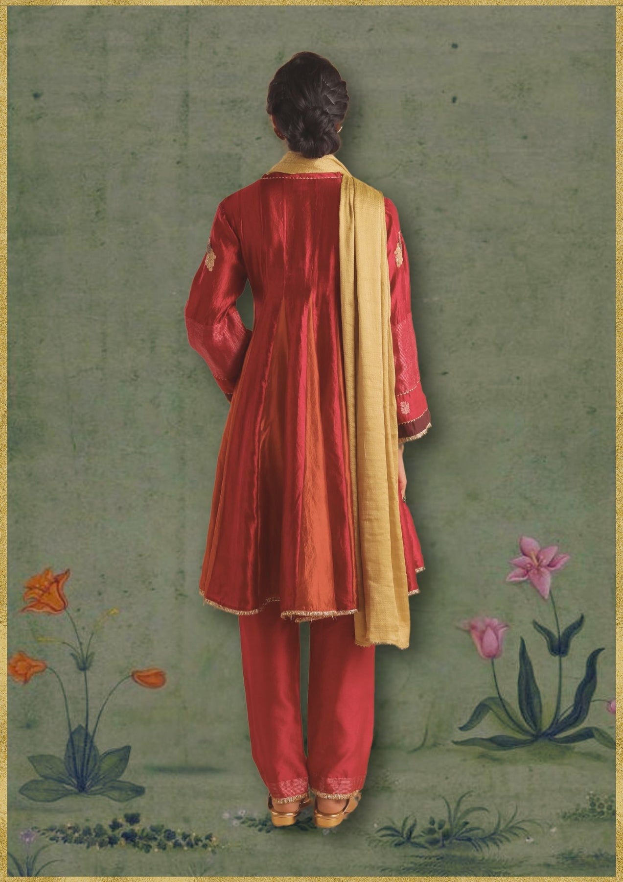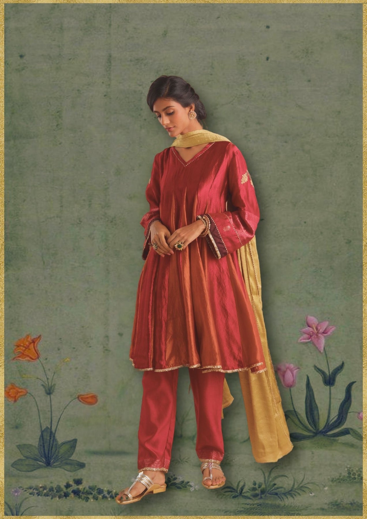DUPION SILK MULTI COLOR GODET KURTA WITH SLEEVE EMB SET