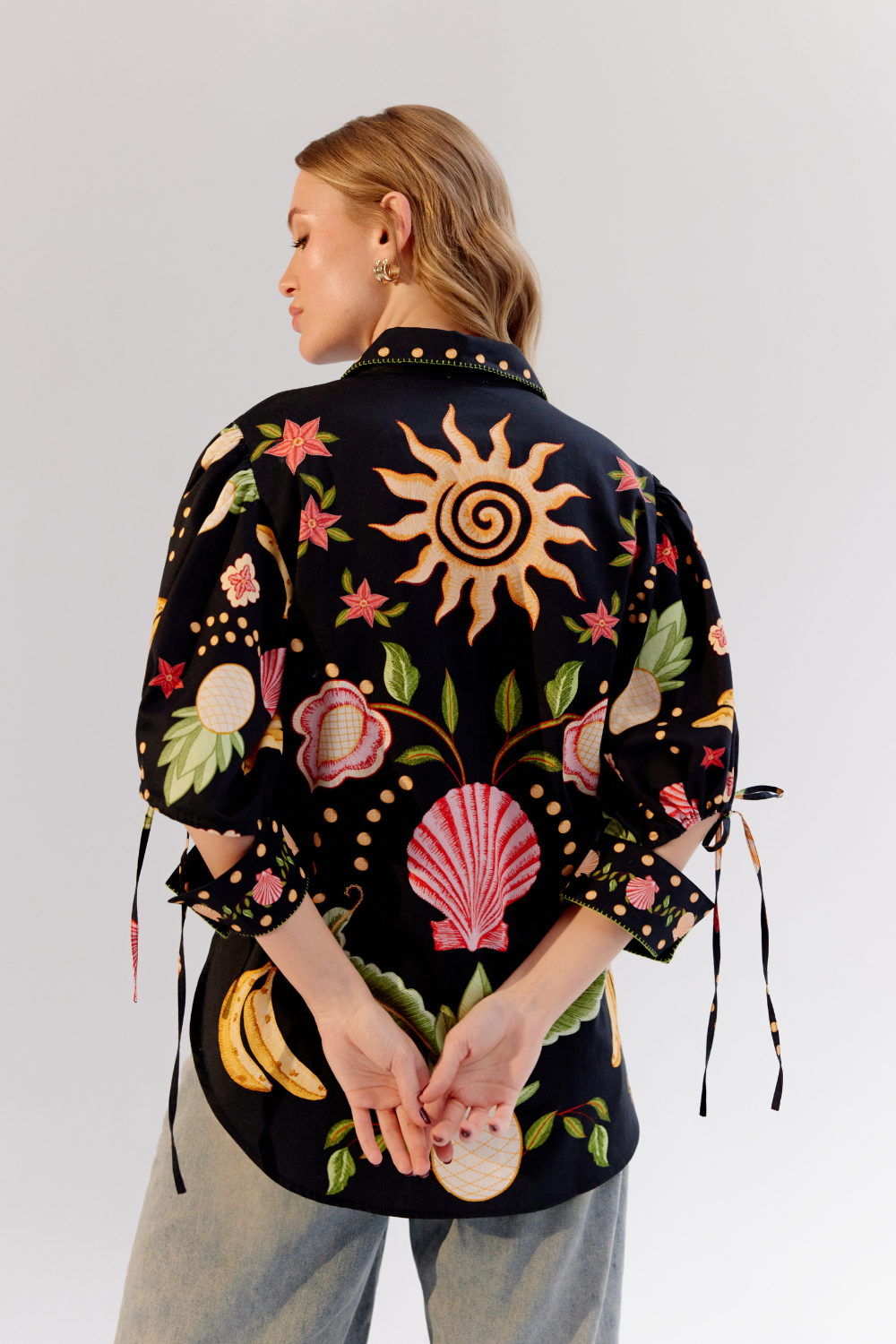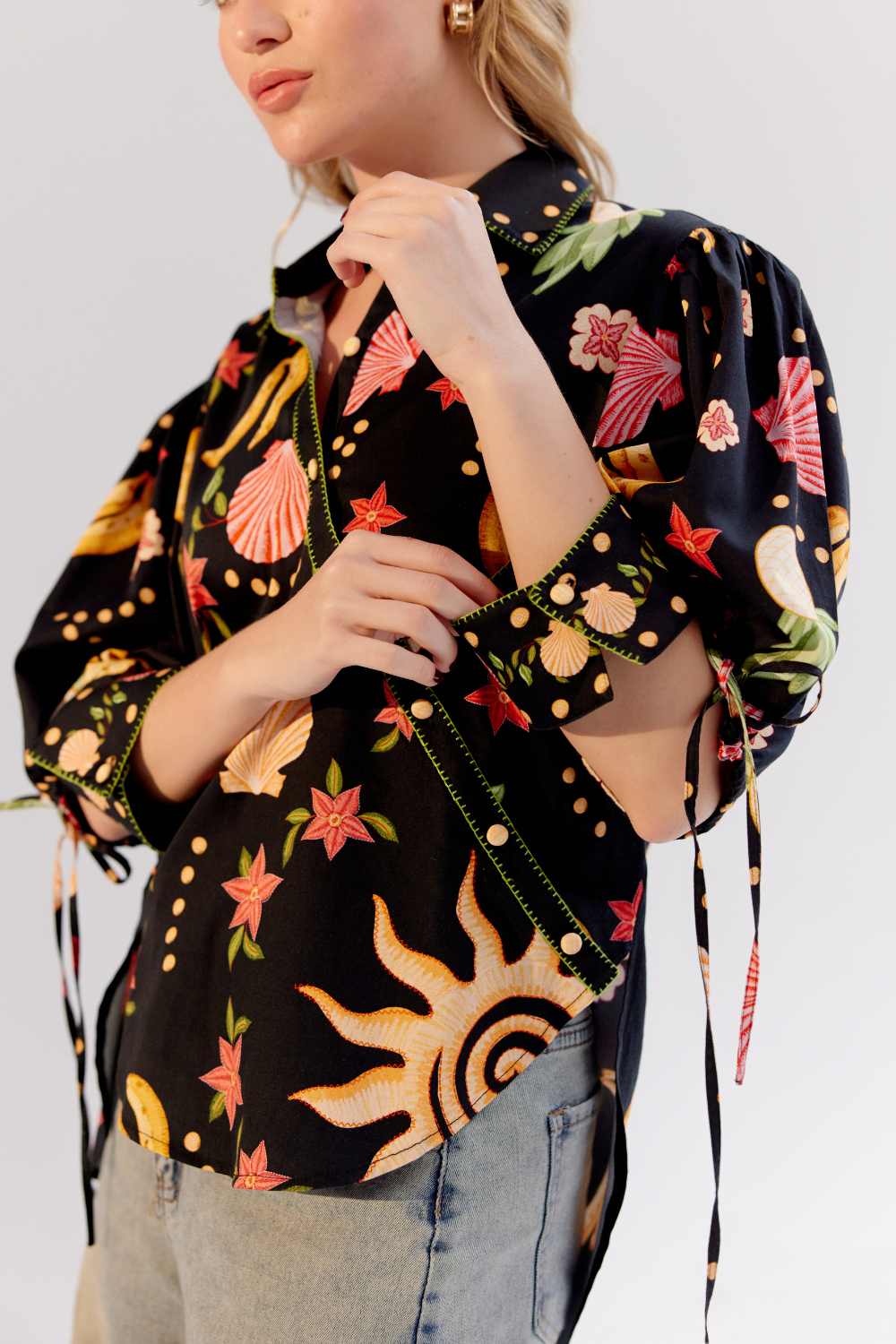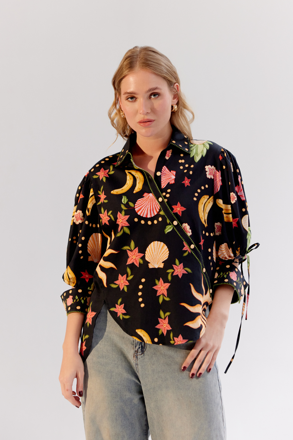 The Brie Shirt from NOIB's Spring/Summer 25 collection is a statement piece that combines bold design with intricate detailing. Crafted from luxurious cotton satin, it features the striking Seashell placement print on a sleek black base. Elevating its elegance, the shirt boasts hand embroidery on the collar, placket, and dori, complemented by intricate beading work on the collar for added finesse. Perfect for making a statement, the Brie Shirt pairs beautifully with tailored pants or skirts for an elevated ensemble or denim for a more relaxed yet sophisticated look.