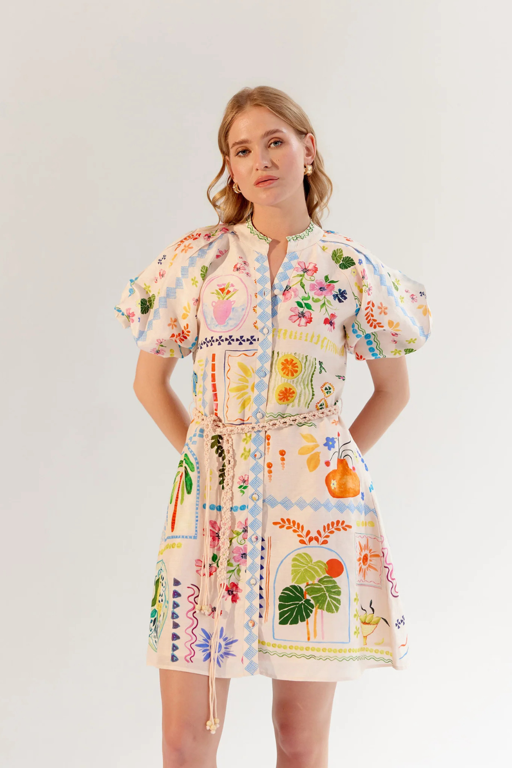 Introducing the Florence Mini that comes in two enchanting variations: Postcard, a placement print on airy viscose linen, and Schiffli Embroidery on premium Giza poplin. Both styles feature a pleated stand-up collar, playful puffed sleeves, and a beautifully crafted crochet belt that cinches the waist for a flattering silhouette.