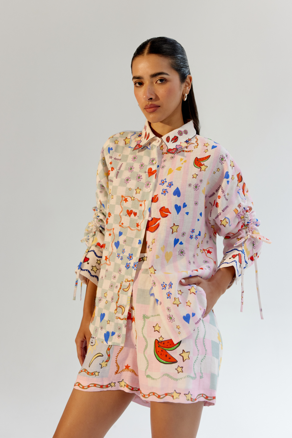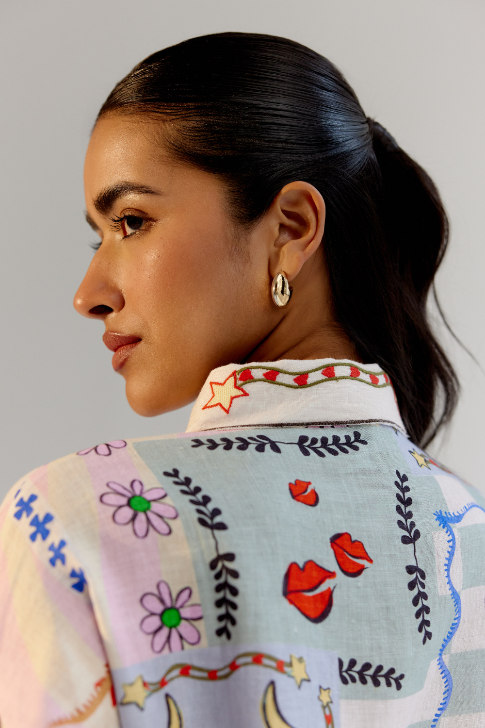 The Thais Shirt, a beloved bestseller from our previous collection, makes its return in two stunning new variations. Crafted for versatility and charm, it is available in Boardgame, featuring vibrant placement printing on linen lyocell with intricate collar and cuff embroidery, and a timeless All-Over Embroidery design on breathable giza poplin. Both styles feature adjustable drawstrings on the sleeves, creating a chic ruching effect that adds a touch of playfulness to its classic silhouette.