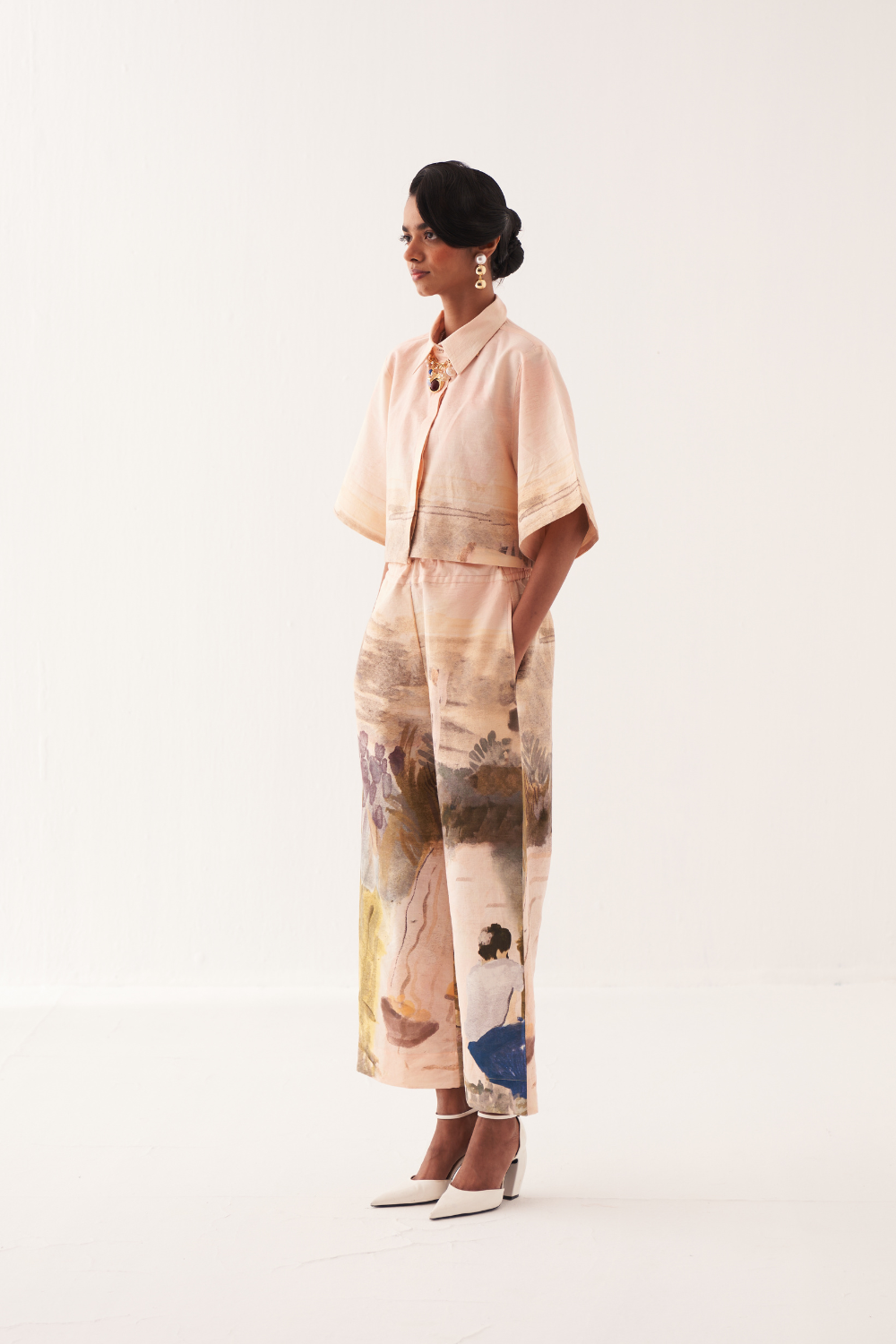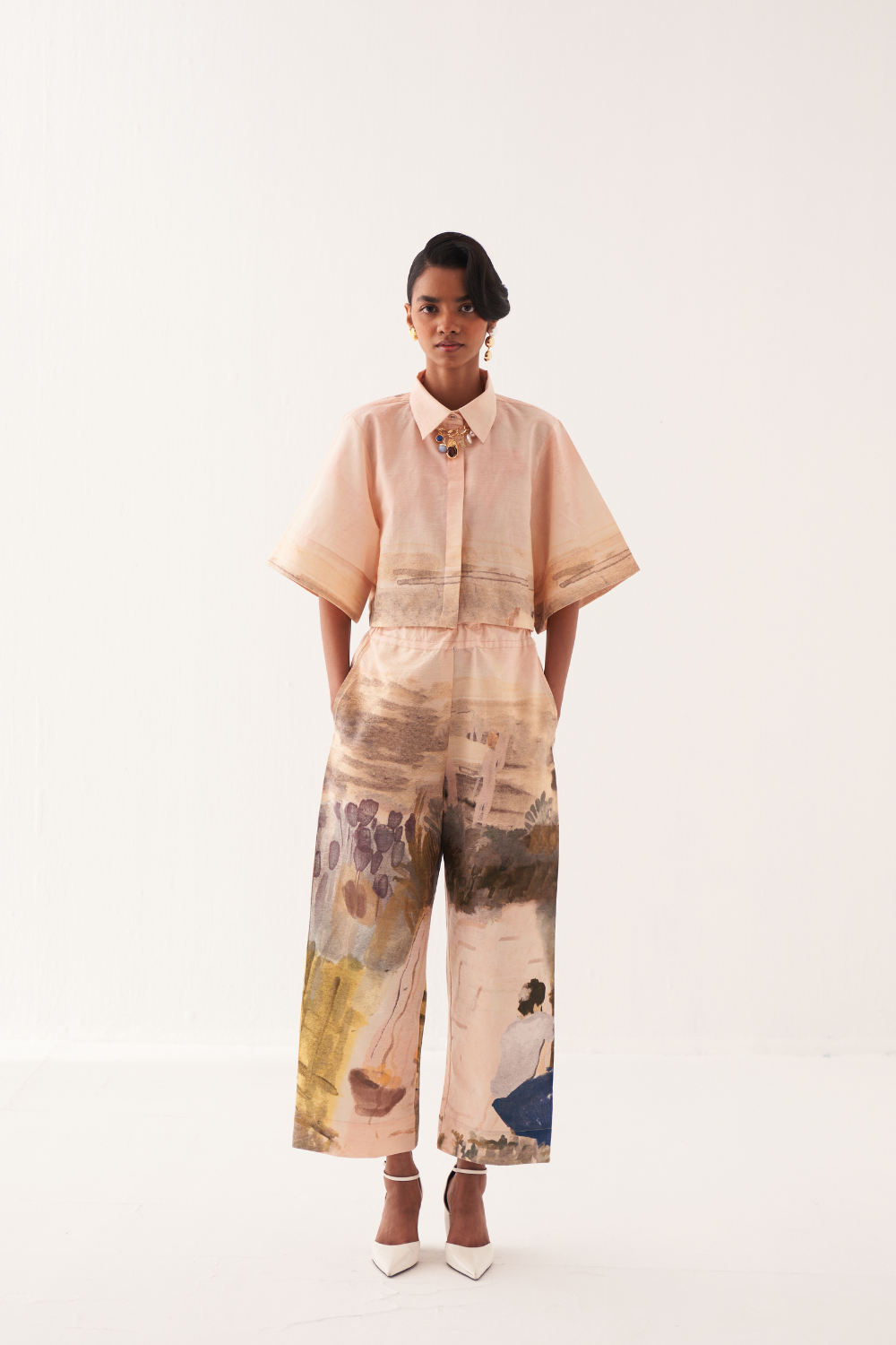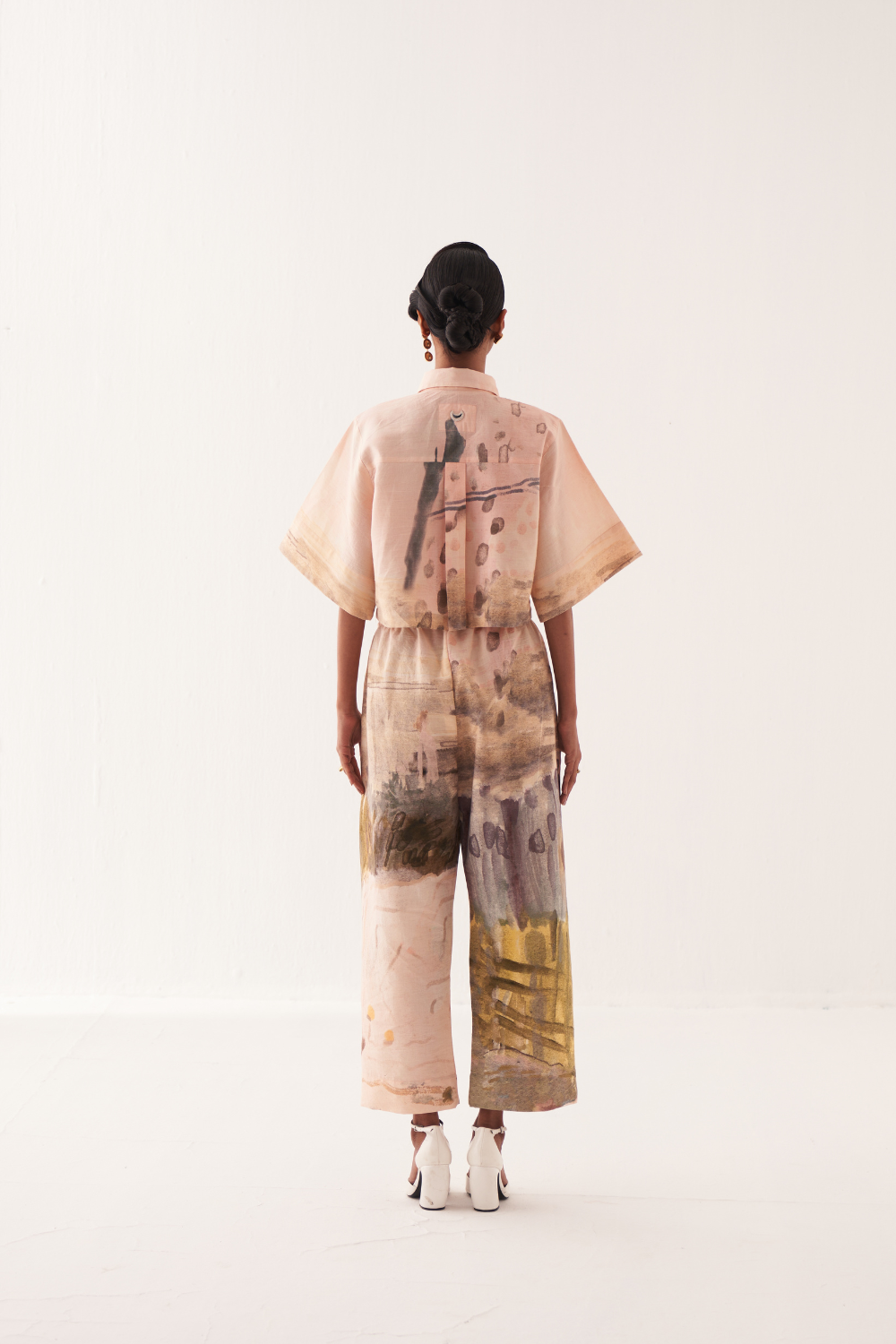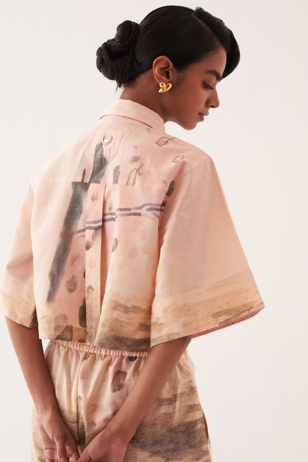 Anti-Fit cropped shirt, hand-painted abstract expressionist digitally transferred print, with back yoke and box pleat. Print placements will vary—single Piece. Model is wearing - XS/S