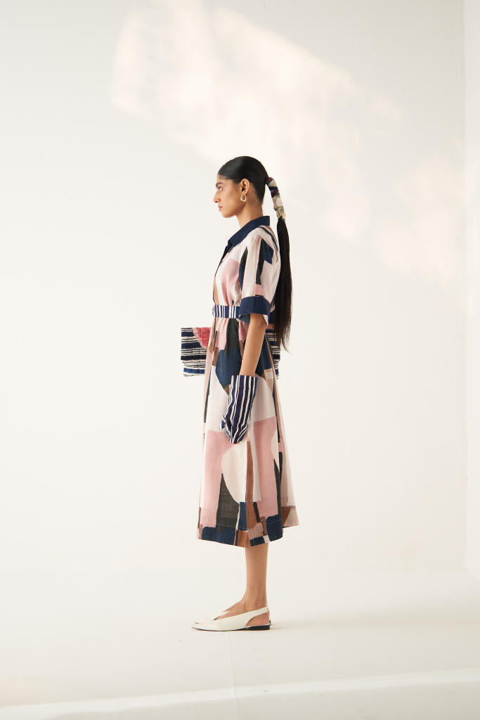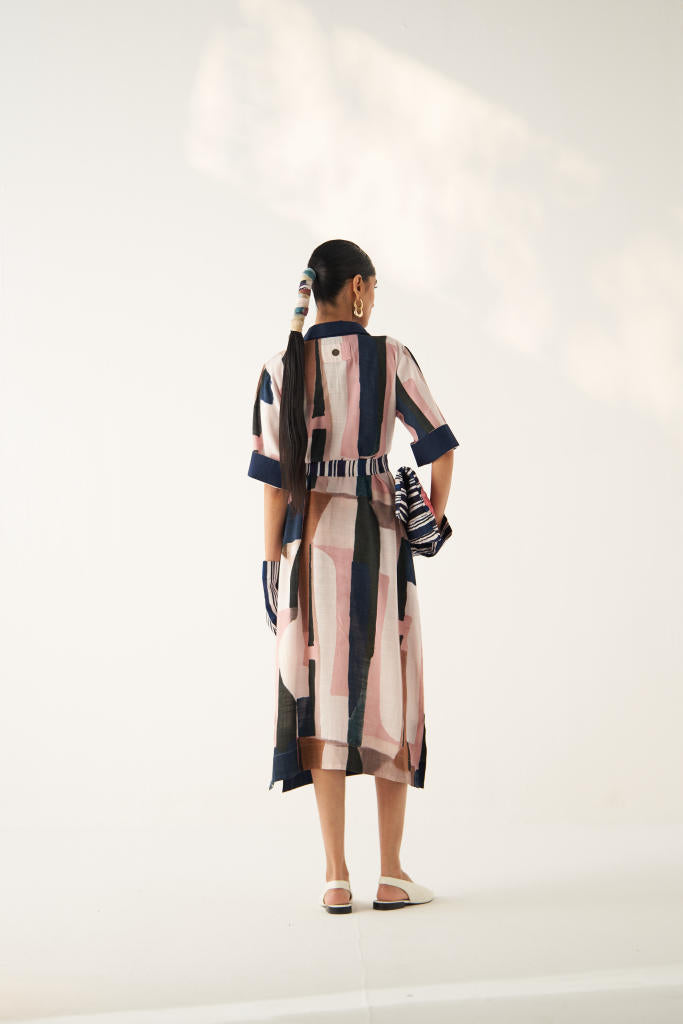 GOT Certified Azo-free dyes, Anti-Fit, Hand-painted abstract expressionist digitally transferred print, Navy solid sleeves roll-ups and collar, Side Slits, Hand - embossed vintage indian coin detail.