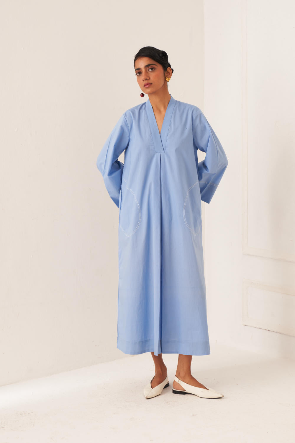 Dress/Kurta: Anti fit Short A- line, with top stitch detailing, V- Neck, Side Inseam pockets, Kimono Sleeves, vintage coin detailing at back. Variations in color and texture are inherent due to the hand made nature of the garment. Model is wearing size M