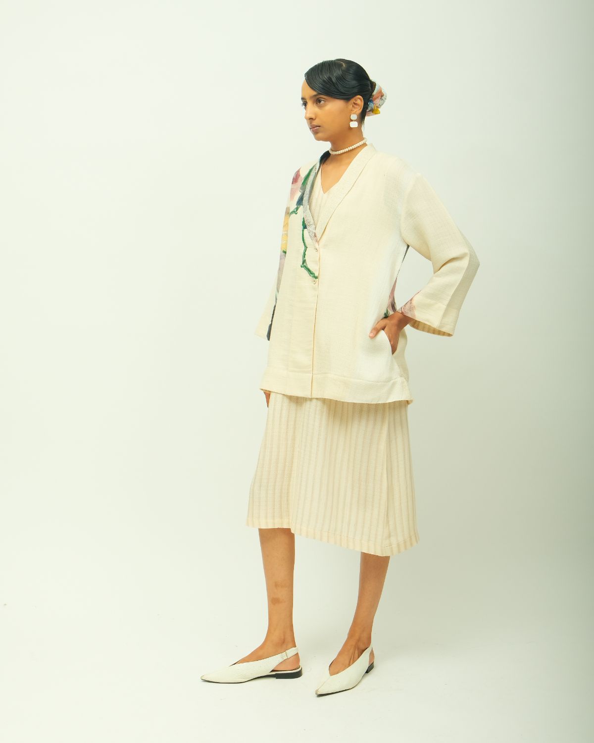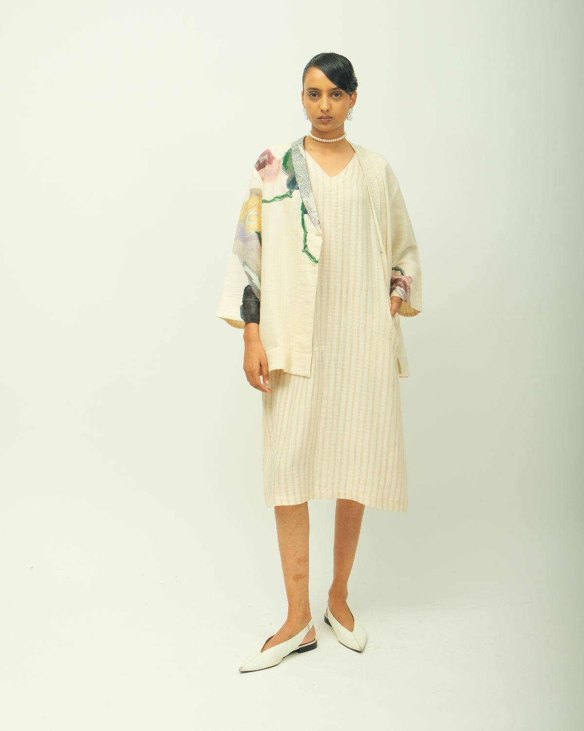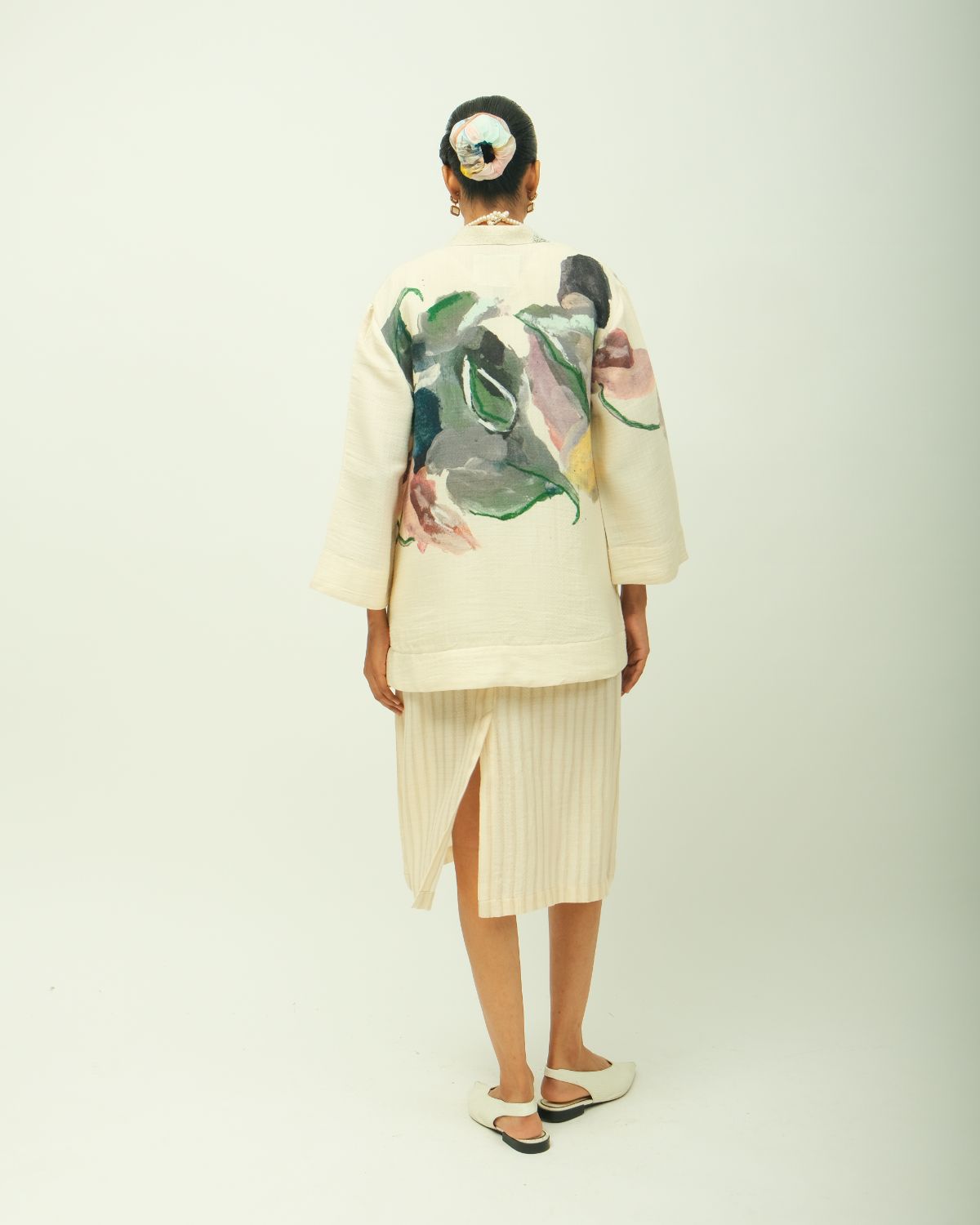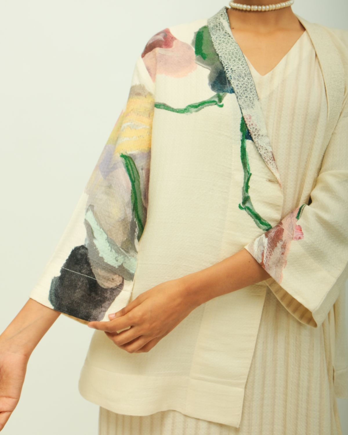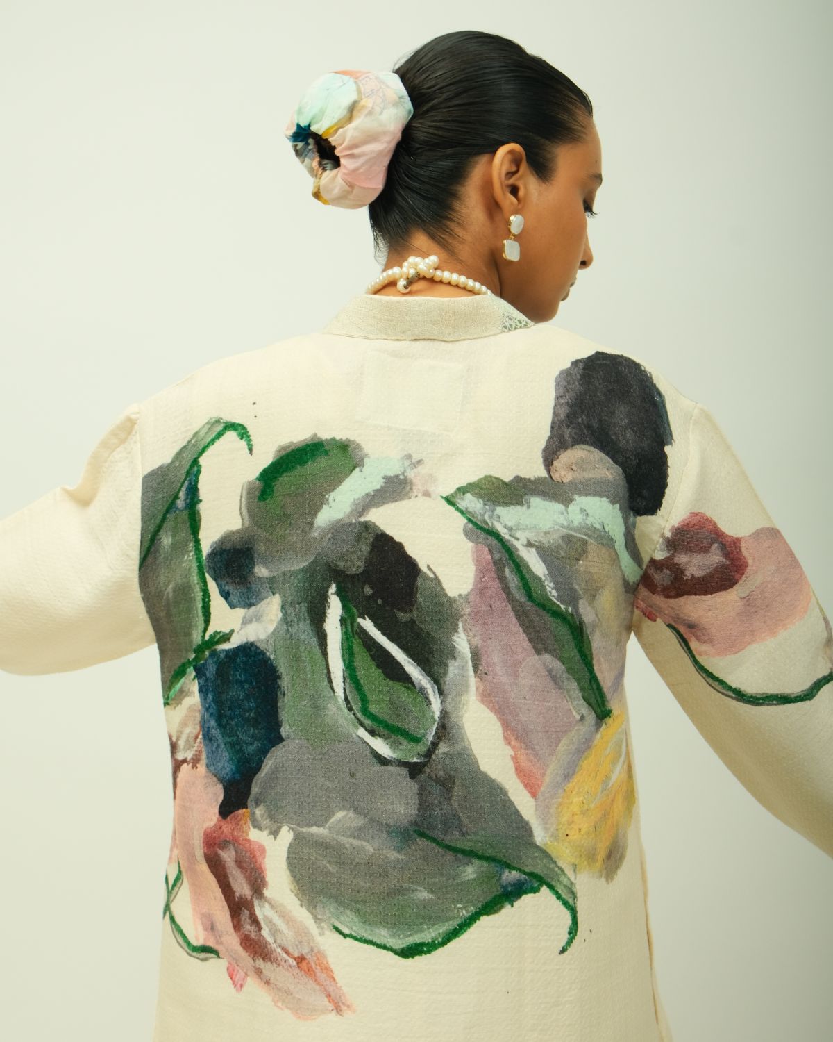 Anti-Fit Jacket, shawl collar, V-neck and three-quarter sleeves, hand-painted abstract expressionist digitally transferred print, embroidery detailing on lapel, hidden placket and a relaxed fit. Print placement may vary - single piece. Garment Length - 30"