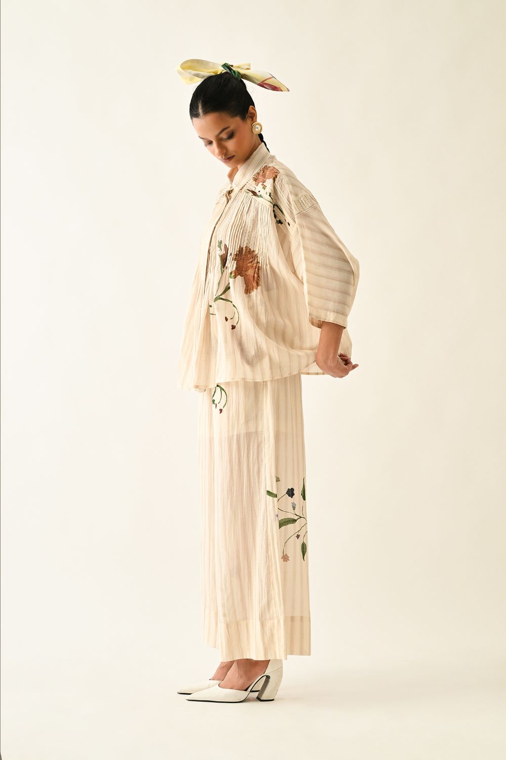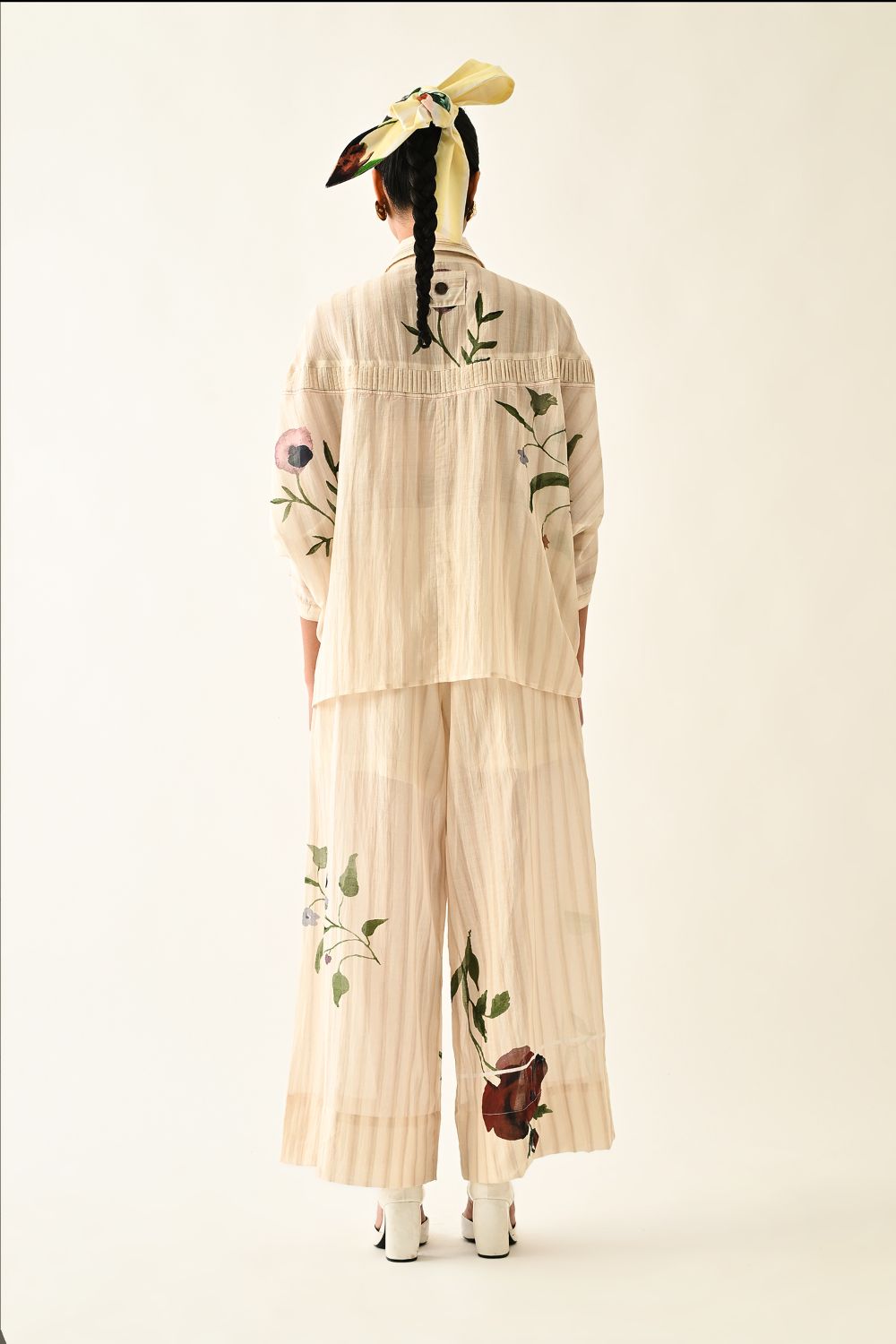 Lower: Anti fit, drawstring Pleated pants, back elasticated, hand-painted abstract expressionist digitally transferred print, side pockets. Print placement may vary—single Piece.
