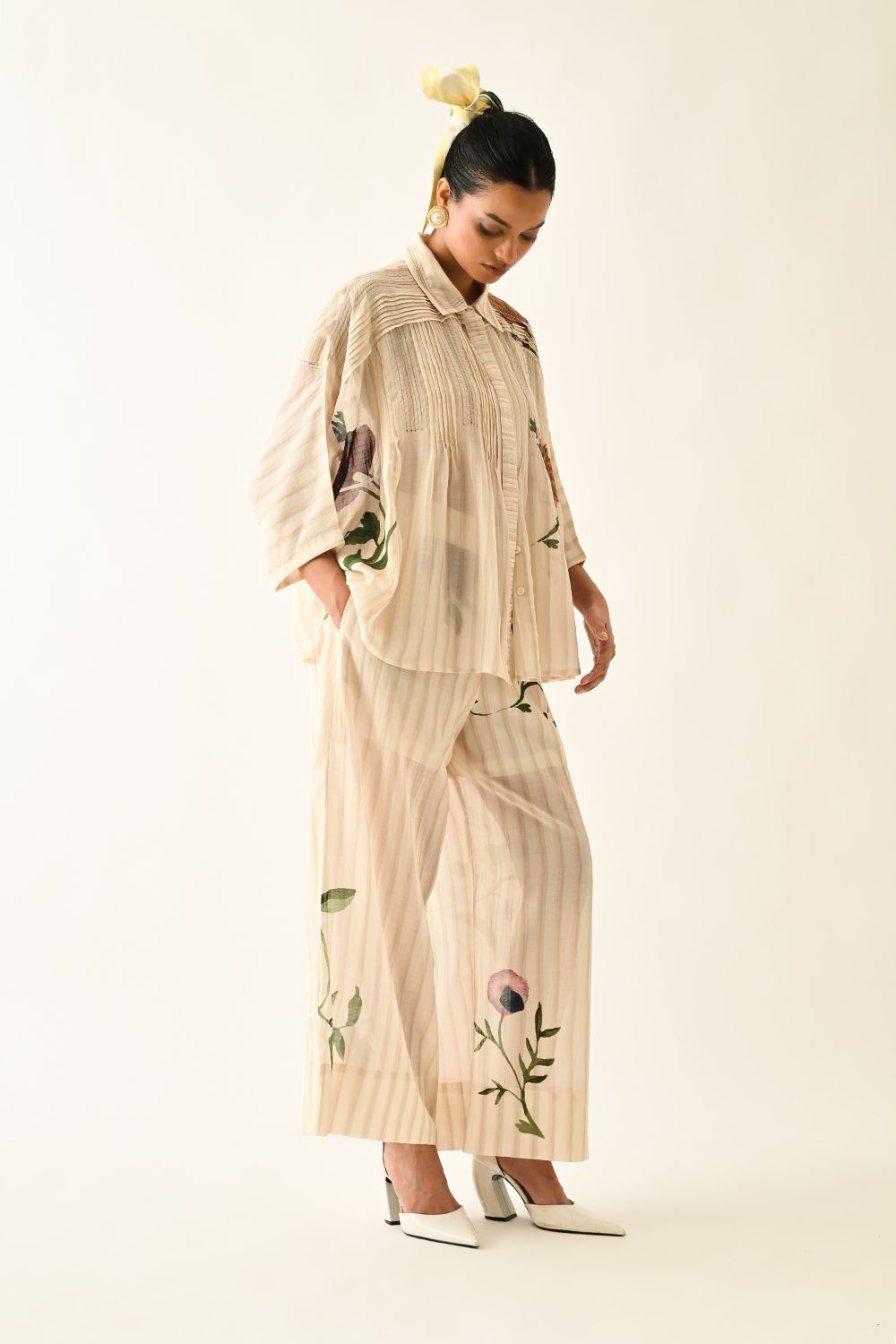 Top: Anti fit, short sleeved top, relaxed fit, vertical pin tucks on front, hand-painted abstract expressionist digitally transferred print, crafted from lightweight textiles. this piece offers both comfort and understated elegance. Print may vary- Single piece.