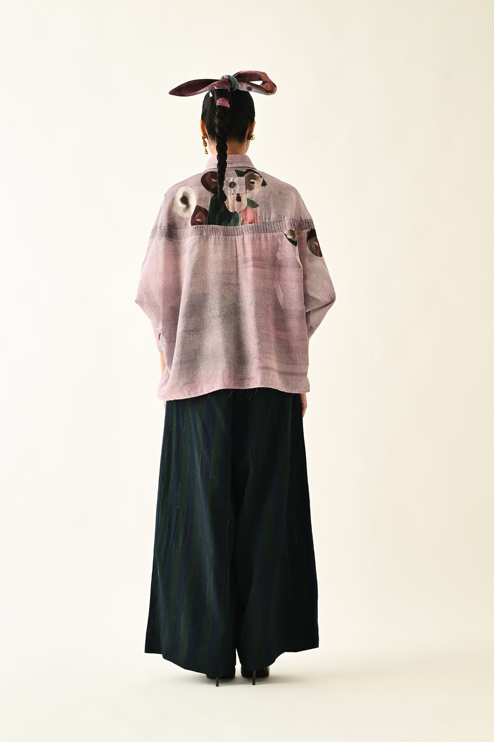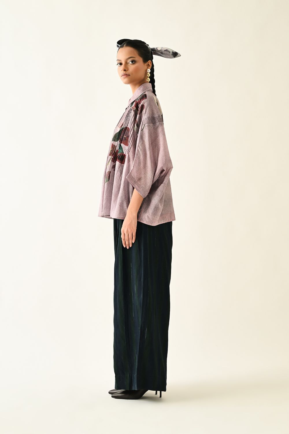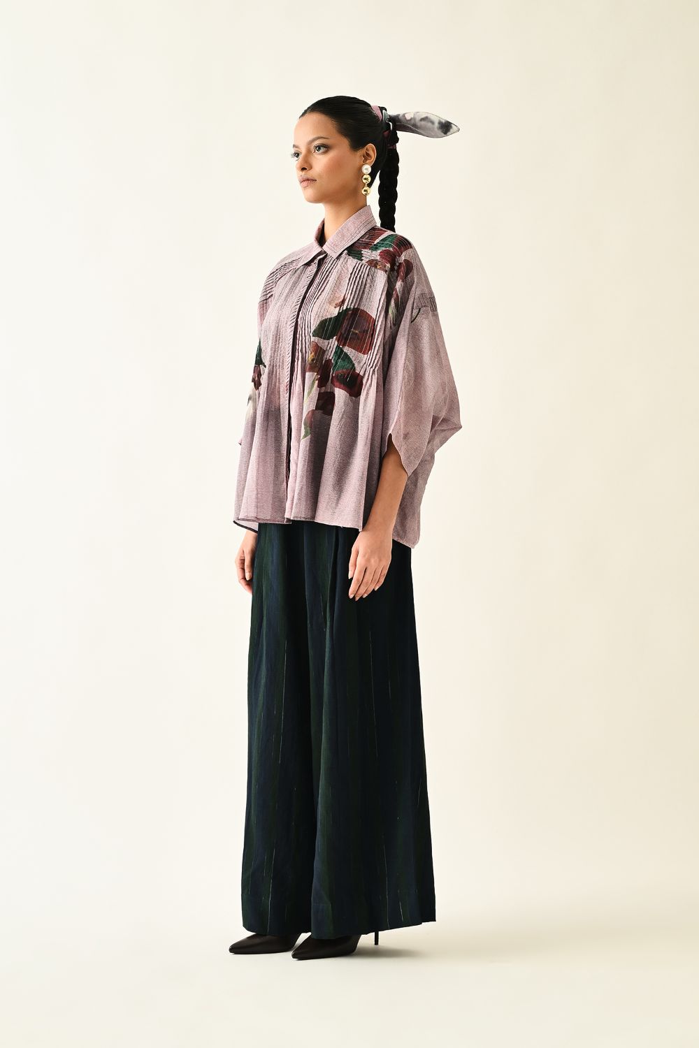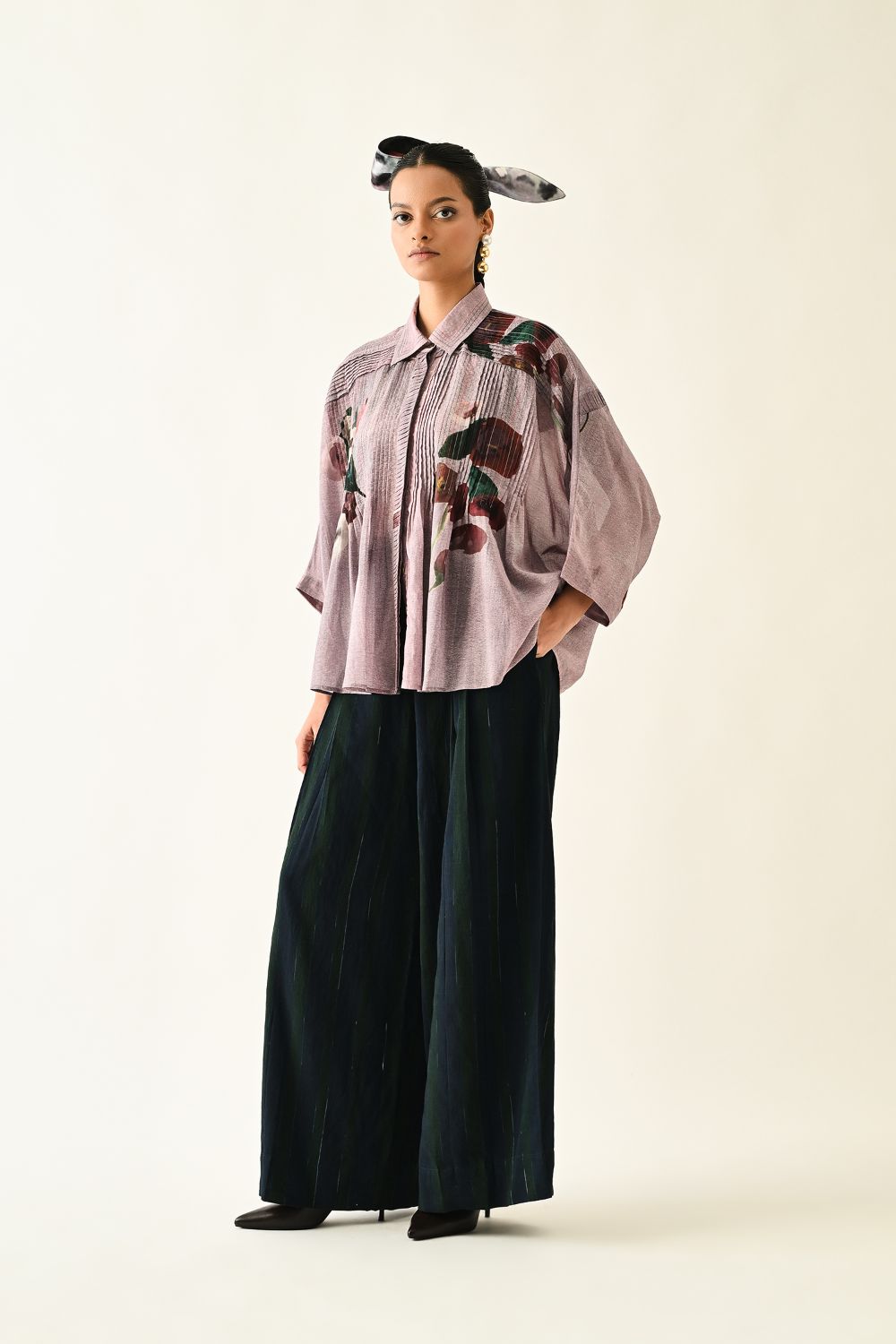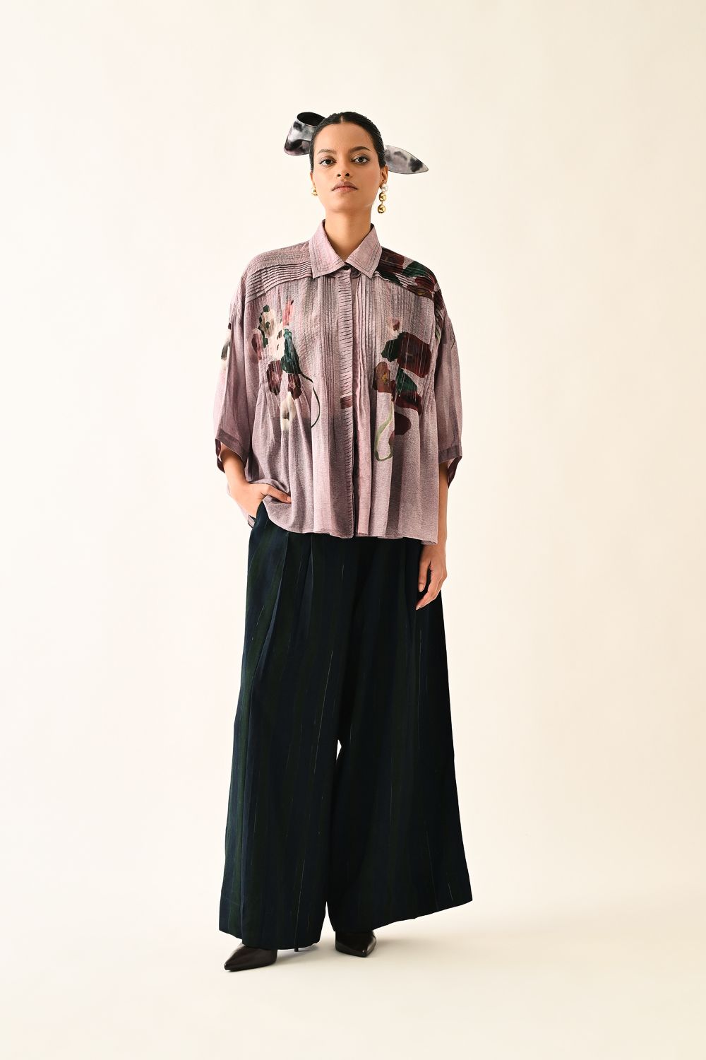 Top: Anti fit, short sleeved top, relaxed fit, vertical pin tucks on front, hand-painted abstract expressionist digitally transferred print, crafted from lightweight textiles. this piece offers both comfort and understated elegance. Print may vary- Single piece.