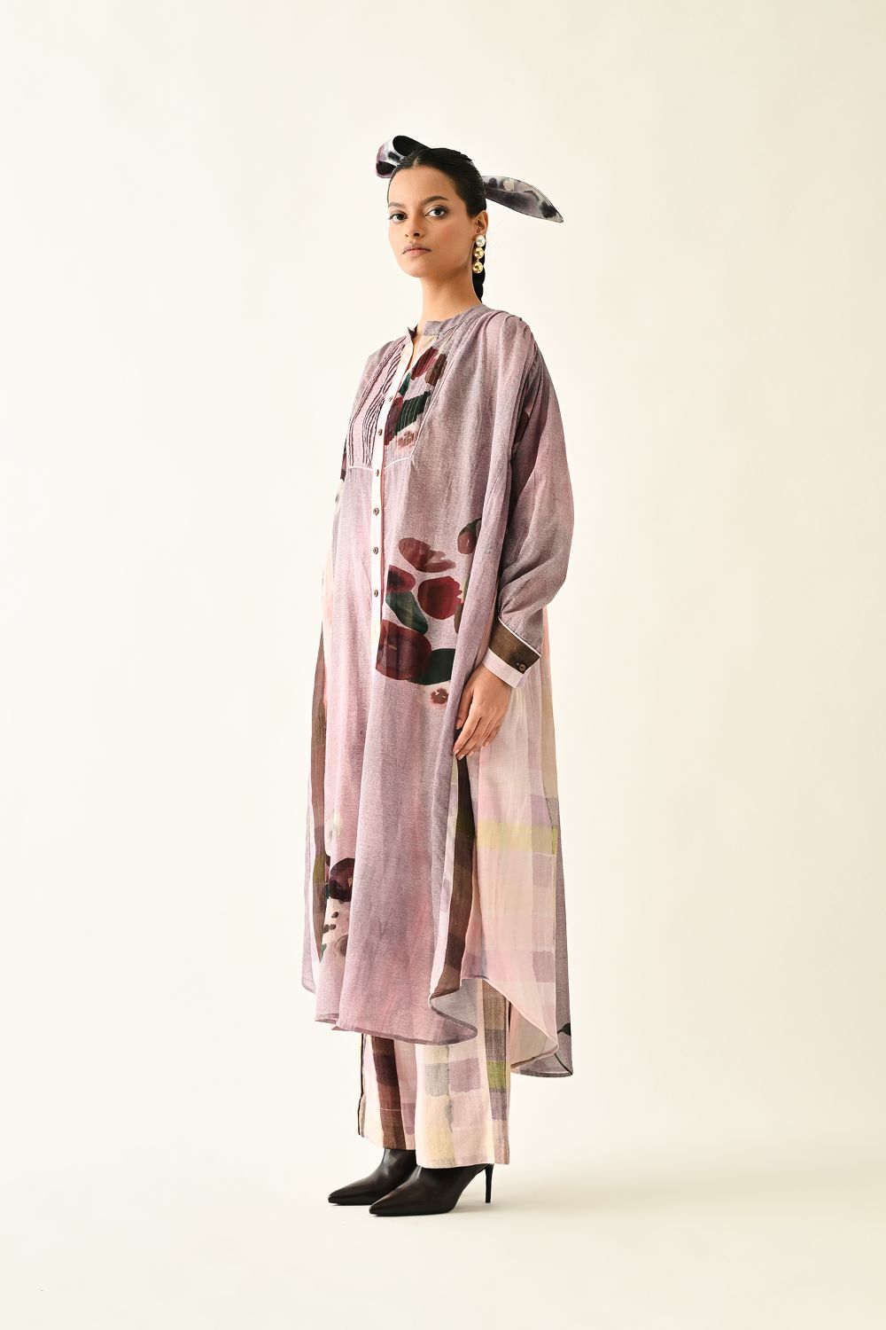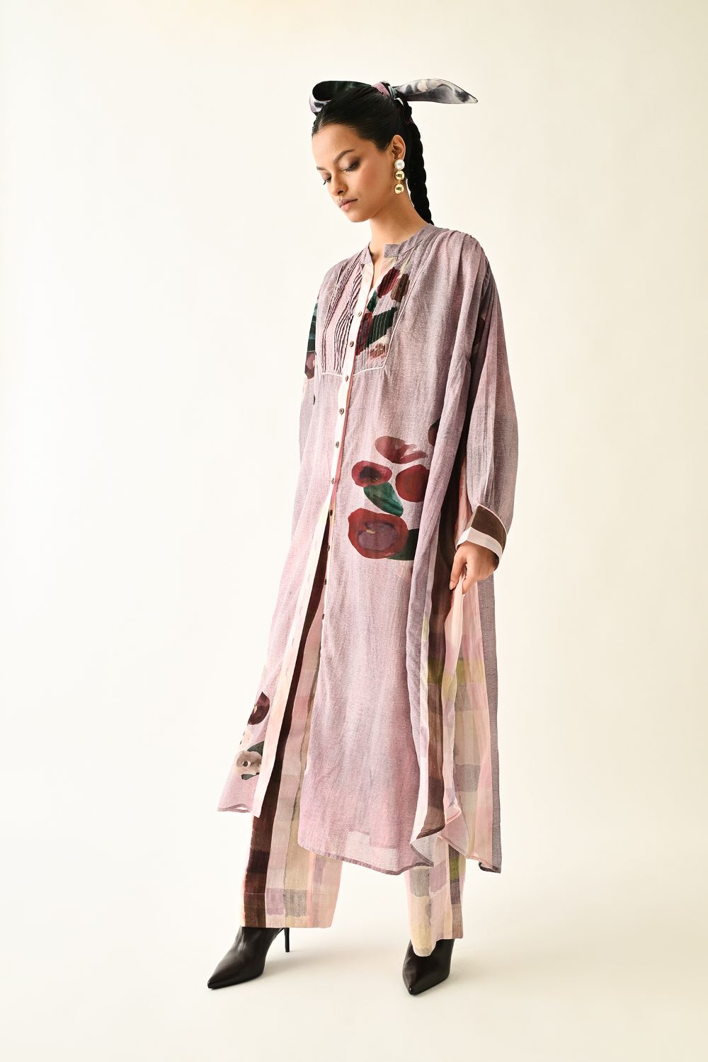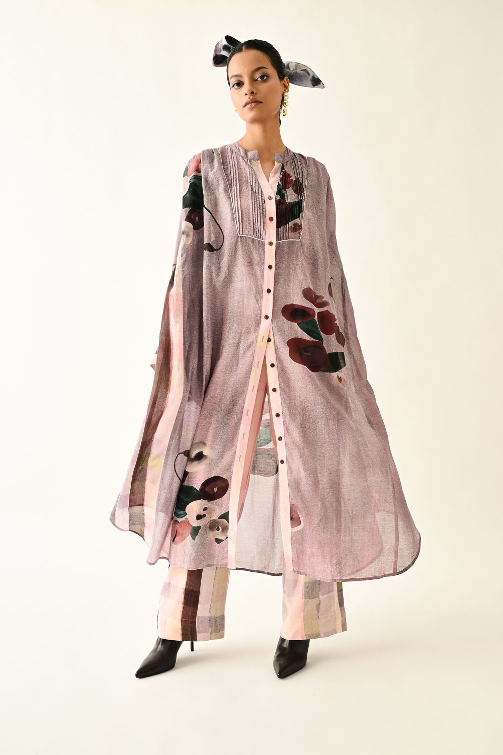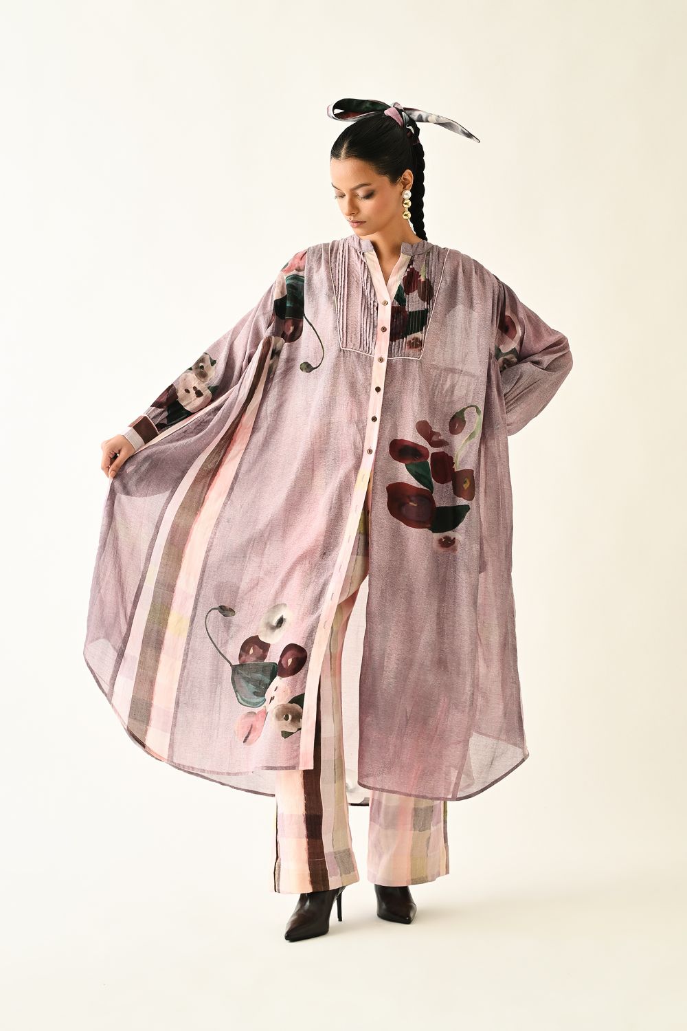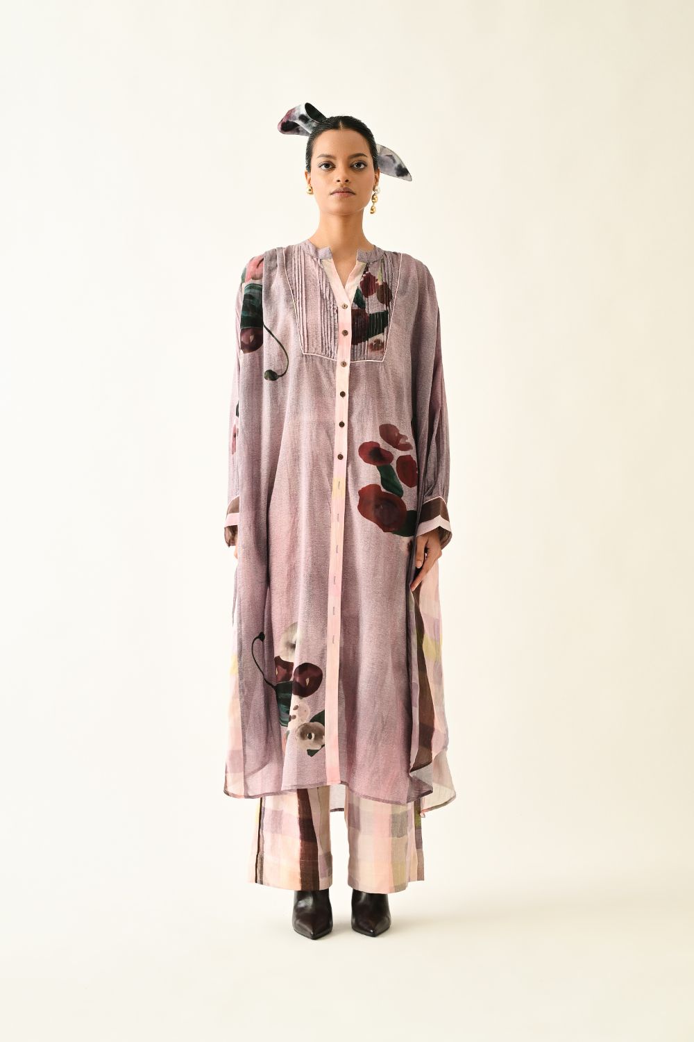 Dress: Relaxed-fit anti-fit dress featuring a mandarin collar, full button-down placket, and long sleeves with buttoned cuffs. Enhanced with delicate cording details and soft gathers along the side panels for added movement. Showcasing hand-painted abstract expressionist florals, digitally transferred. Finished with functional side pockets. Print placement may vary—each piece is uniquely crafted. Model is wearing XS/S
