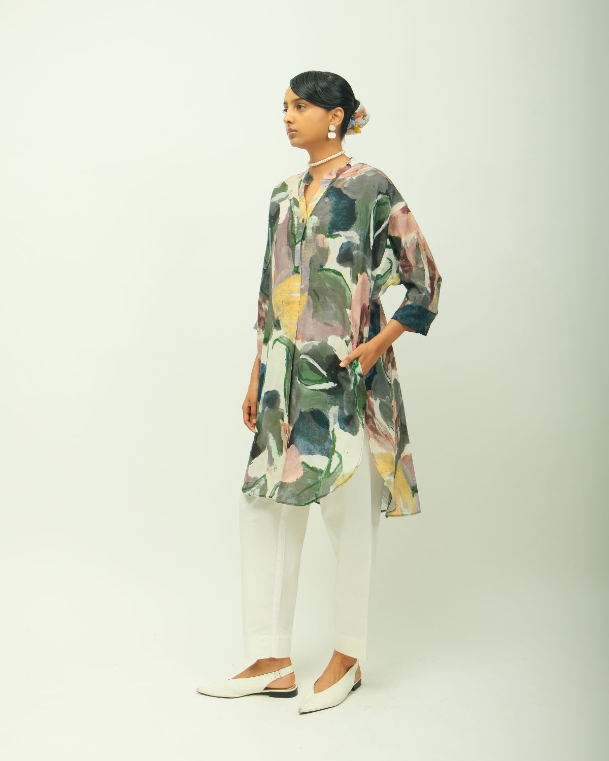 Top: Anti fit, band collar, V-neckline, full sleeves, hand-painted abstract expressionist digitally transferred print, relaxed fit, perfect for effortless style, side pockets. Ideal for casual outings, lunch. Print placement may vary- Single piece.