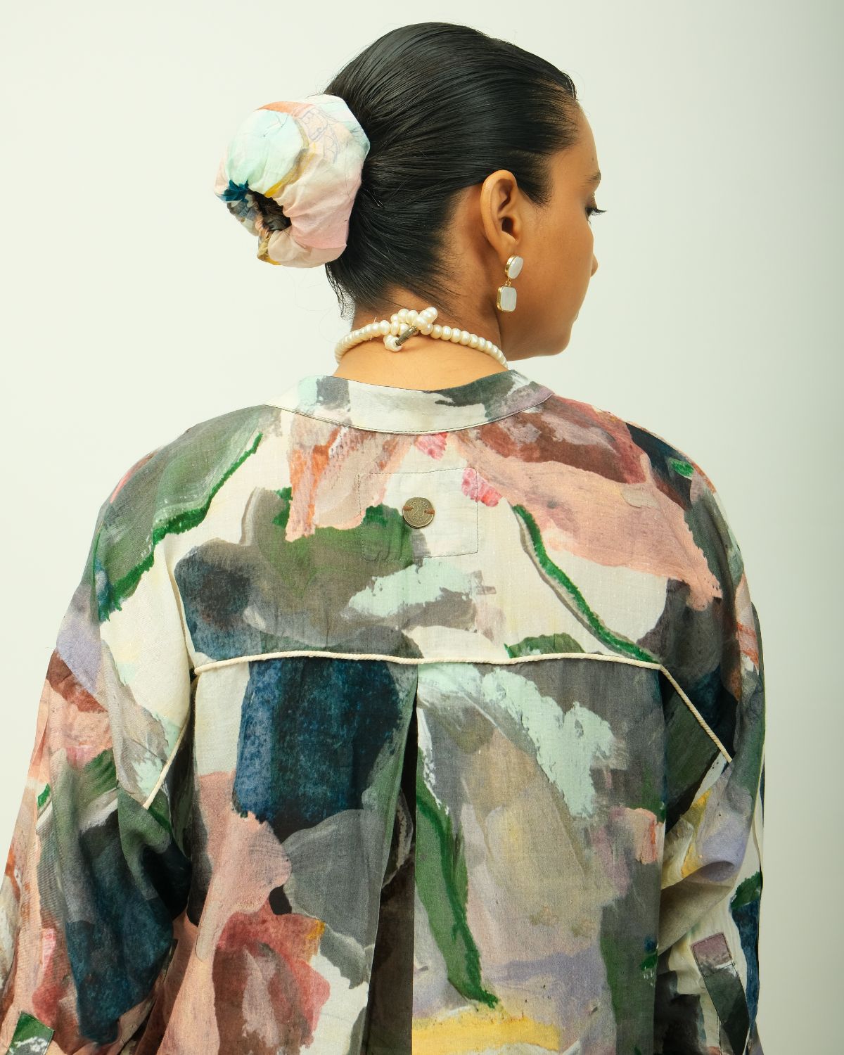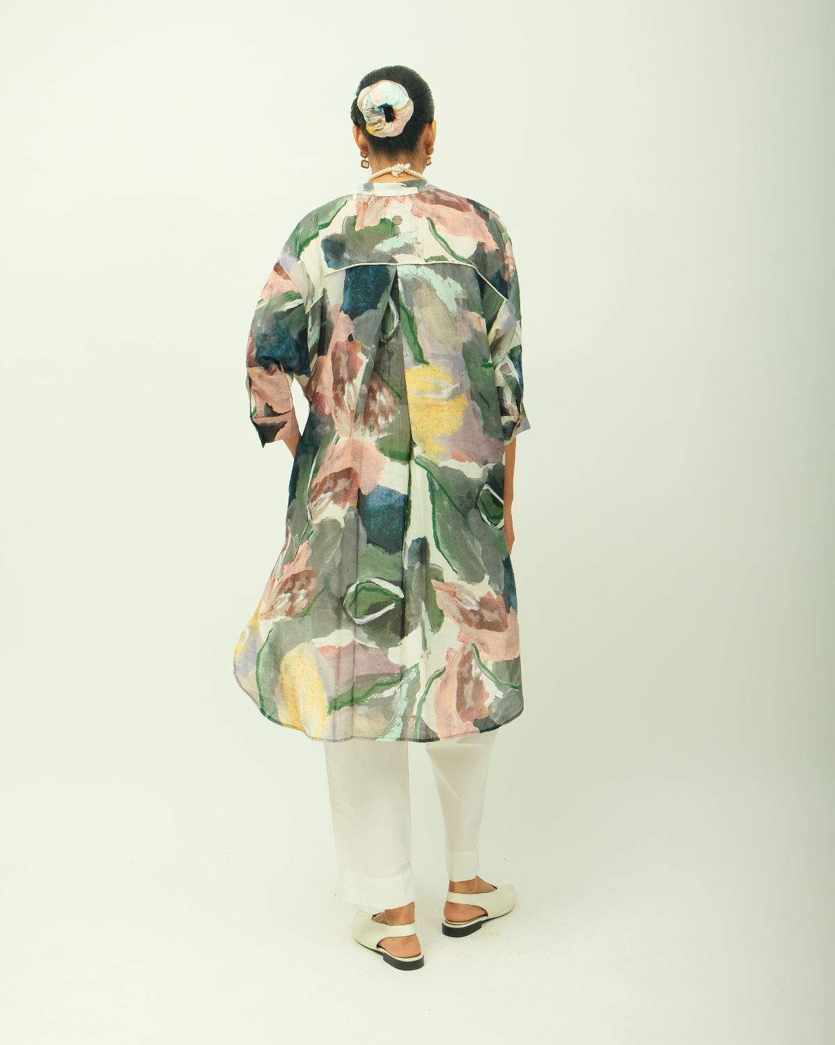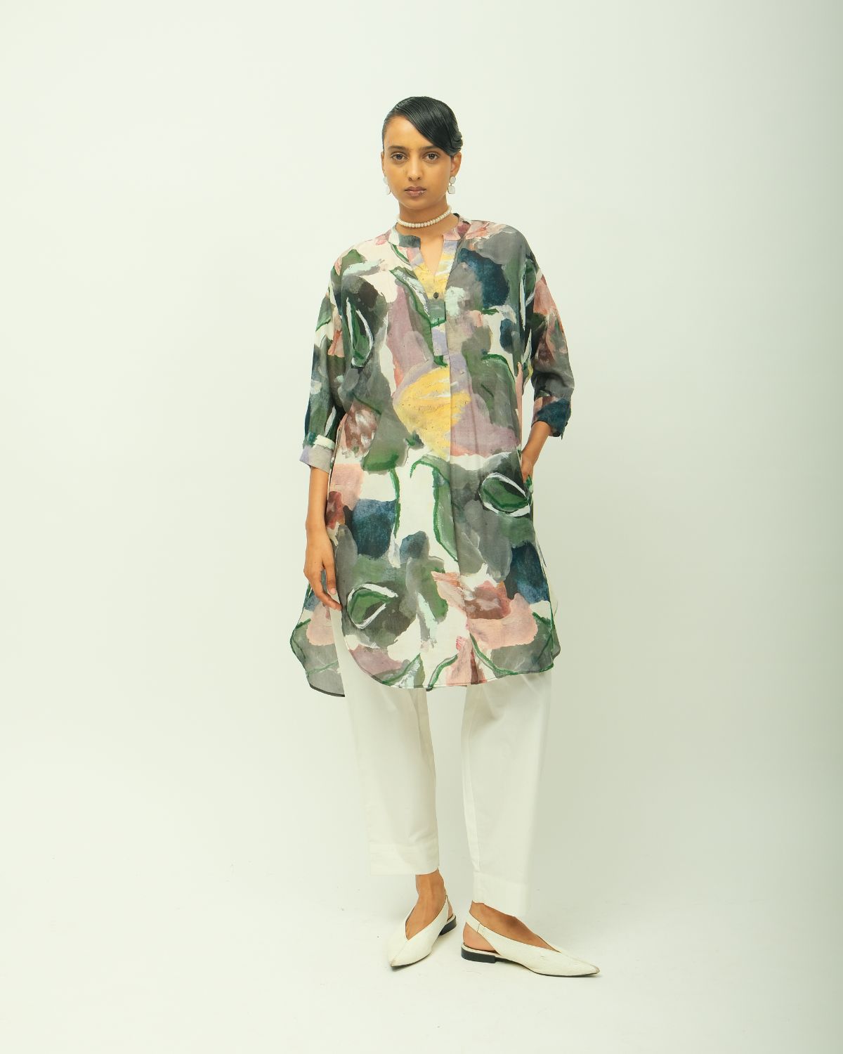 Anti-fit dress with a relaxed silhouette, featuring a band collar with a soft V-neckline and full-length sleeves. Showcasing a digitally transferred hand-painted abstract expressionist print for a contemporary edge. Designed for effortless styling with functional side pockets. Print placement may vary—each piece is one of a kind. Garment Length : Front - 38", Back - 41"