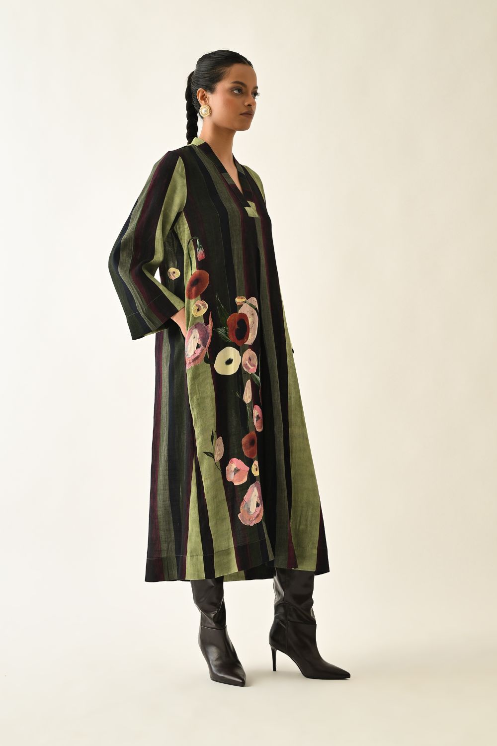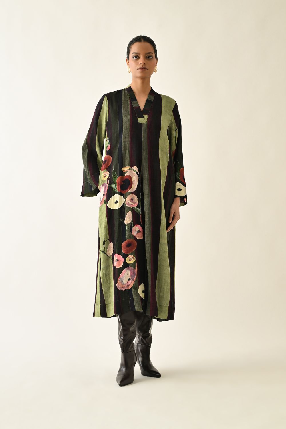 Dress: Relaxed anti-fit dress featuring a soft V-neckline and full-length sleeves. Adorned with a hand-painted abstract expressionist print, digitally transferred for precision and vibrancy. It has side pockets for added utility. Print placement may vary—each piece is uniquely crafted. Model is wearing XS/S