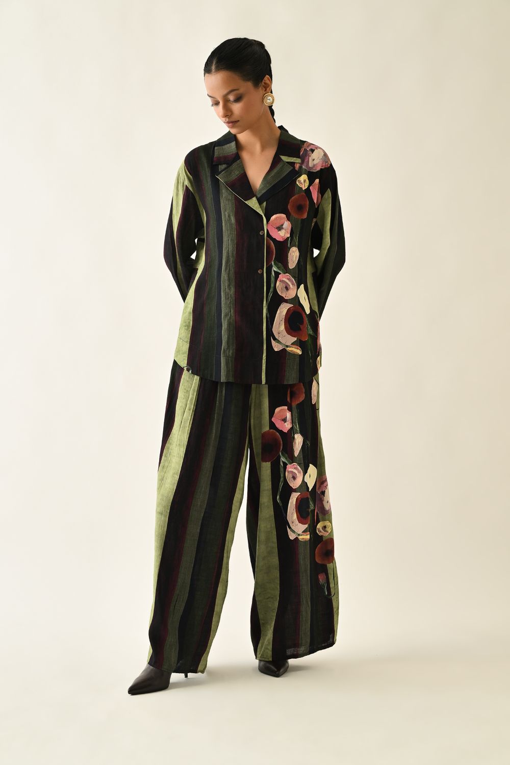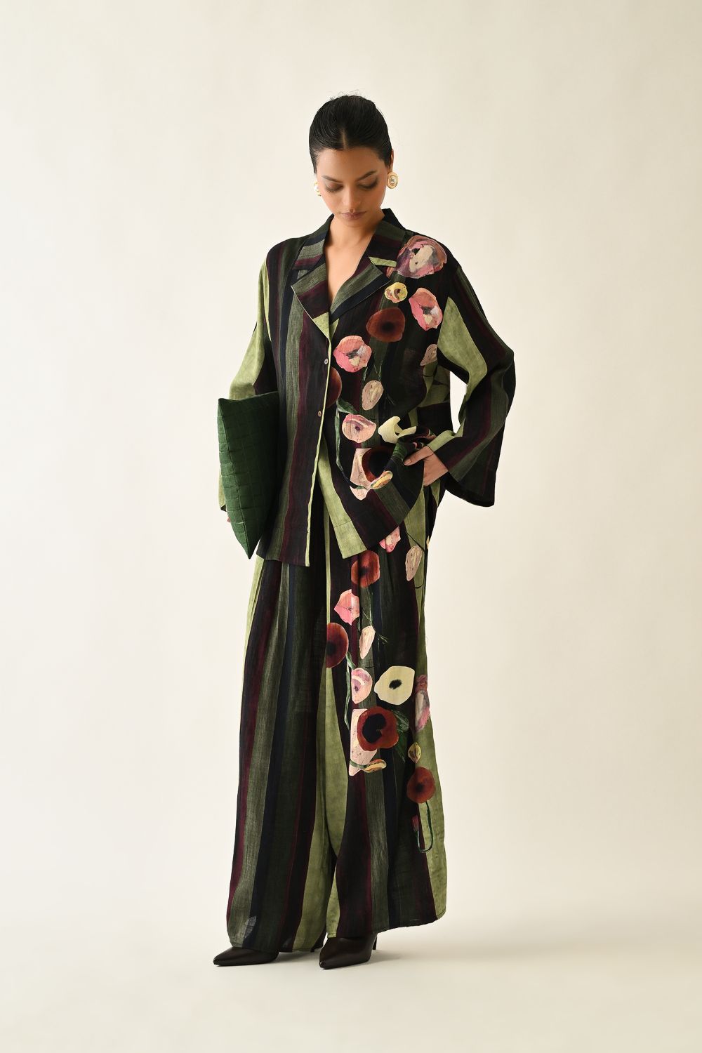 Jacket: Anti-fit jacket shirt is hand-painted abstract expressionist print, digitally transferred. The shirt features a lapel collar, Kimono sleeves. Print placements will vary—single piece. Model is wearing - XS/S.
