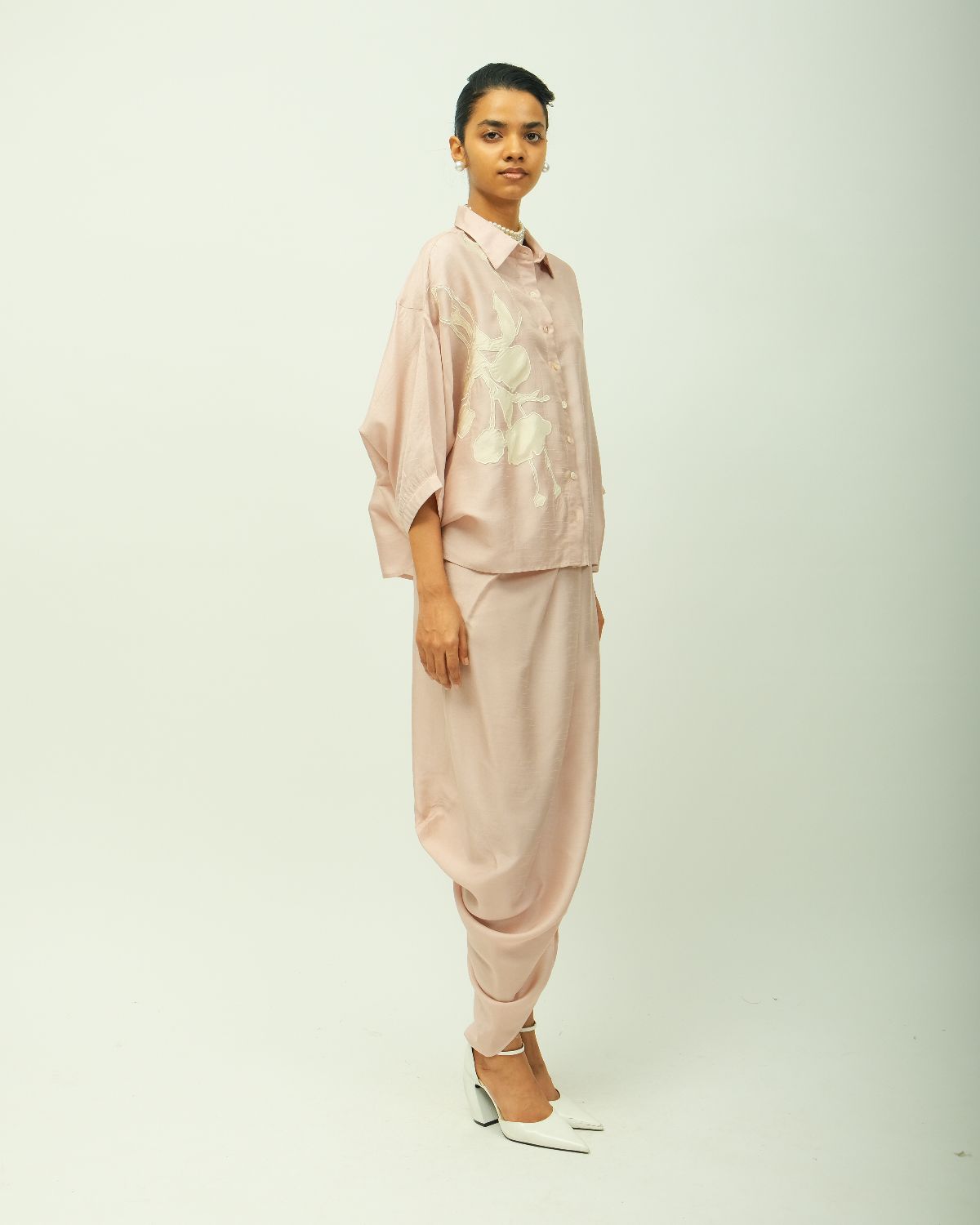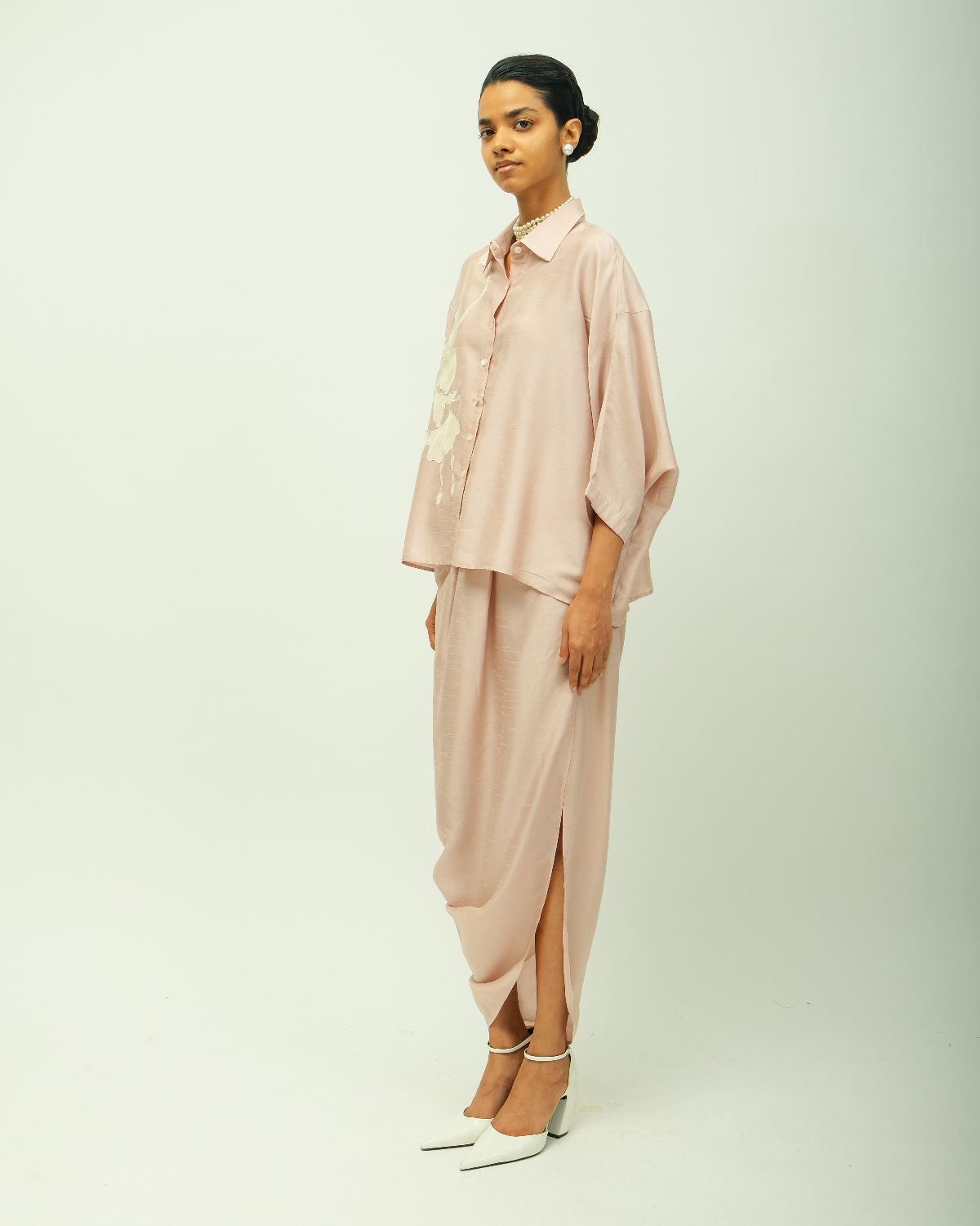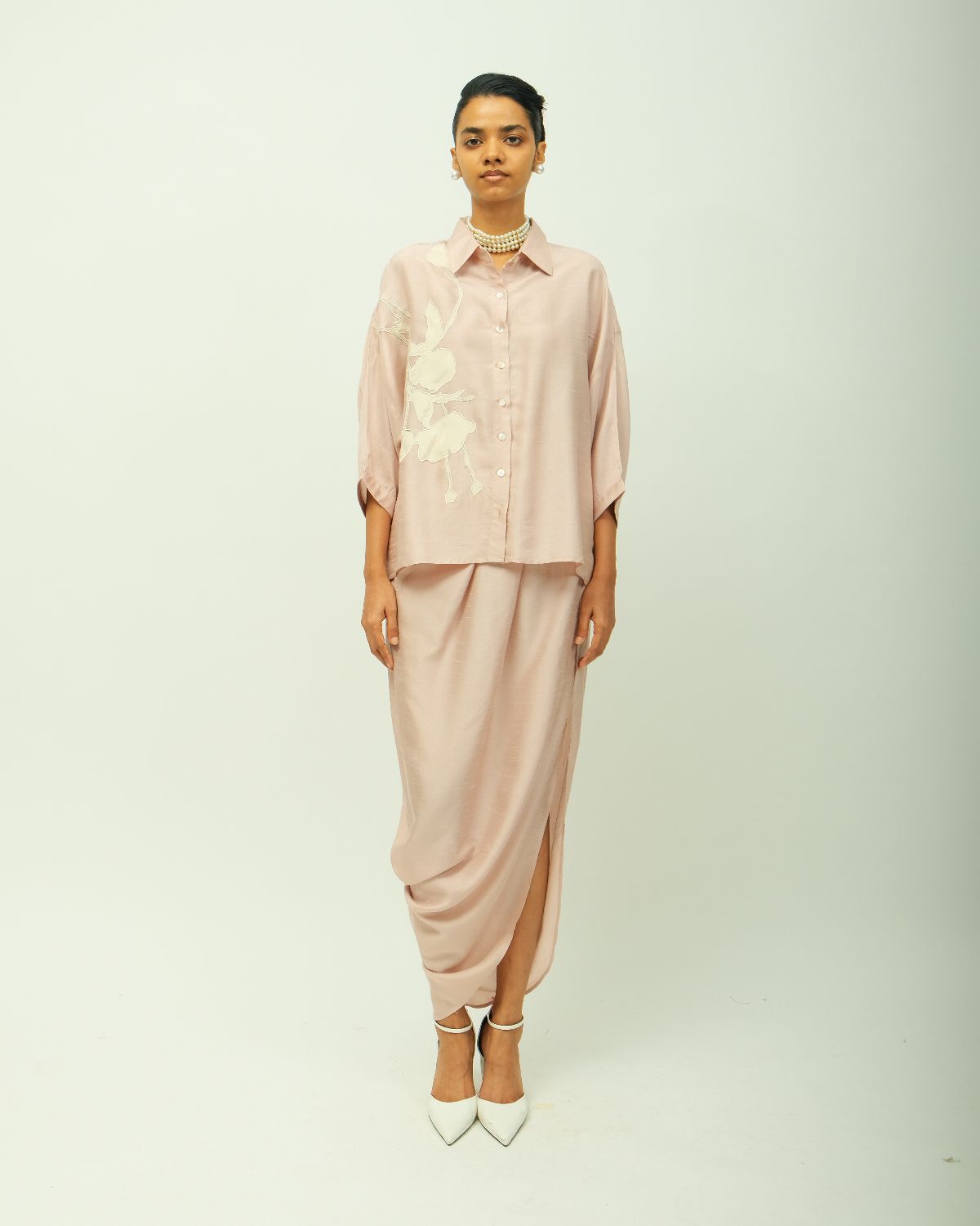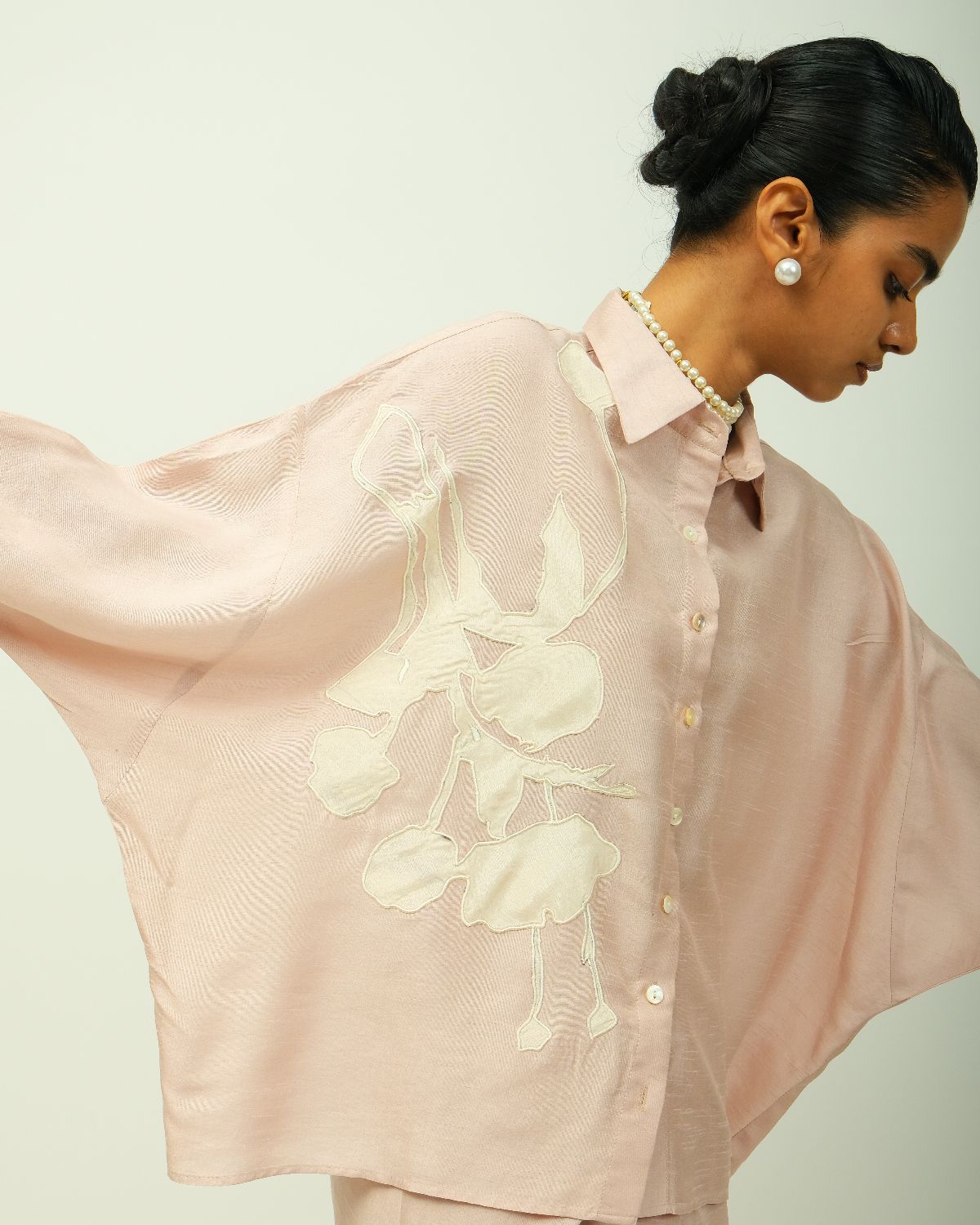 classic shirt collar, front button placket, and elbow-length sleeves seamlessly. adorned with ivory botanical appliqué on one side, adding depth and artisanal texture. single peice. .-Single Piece