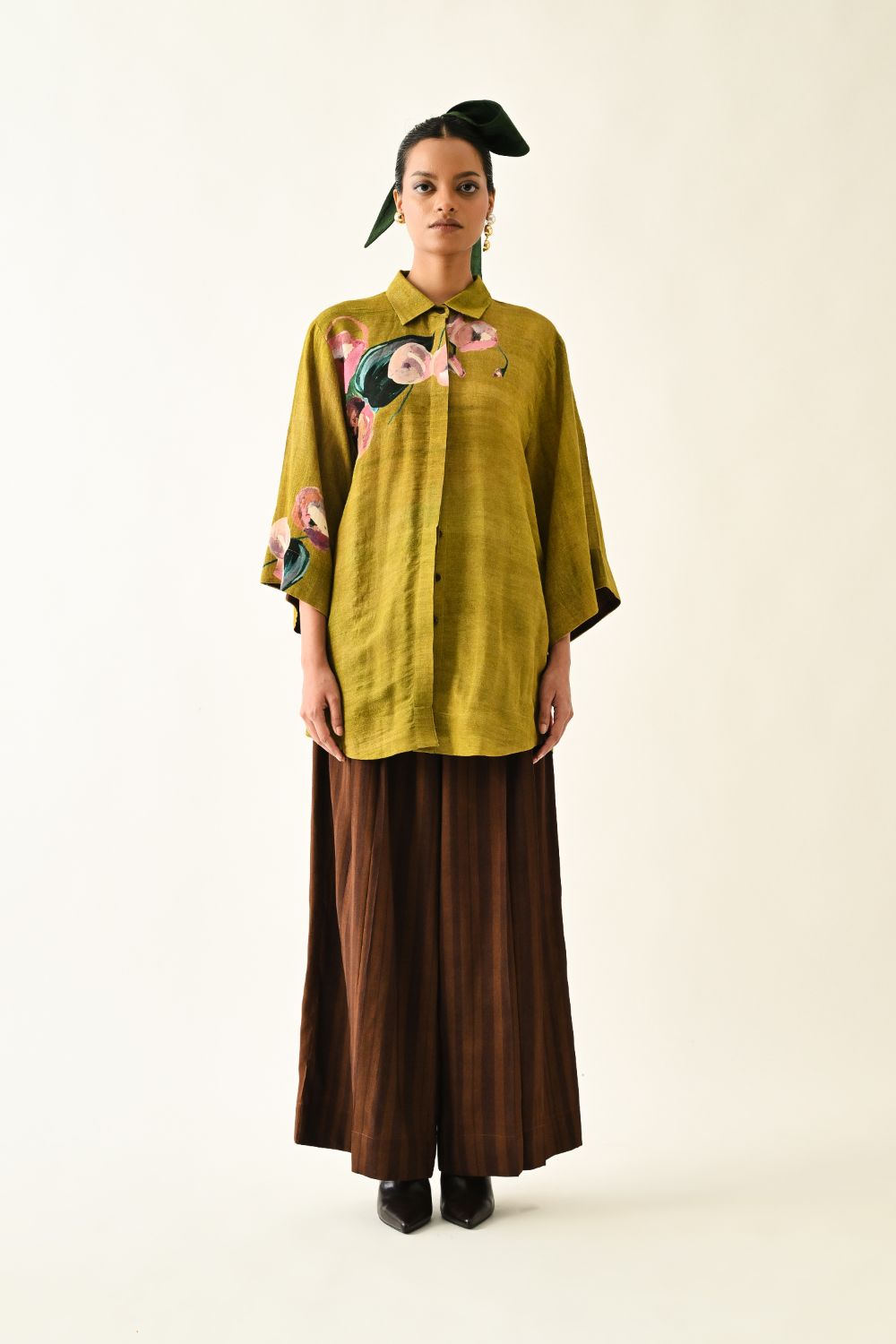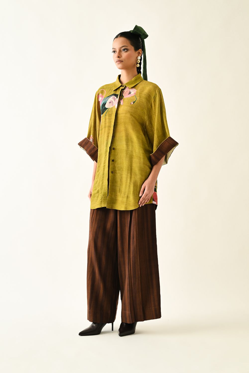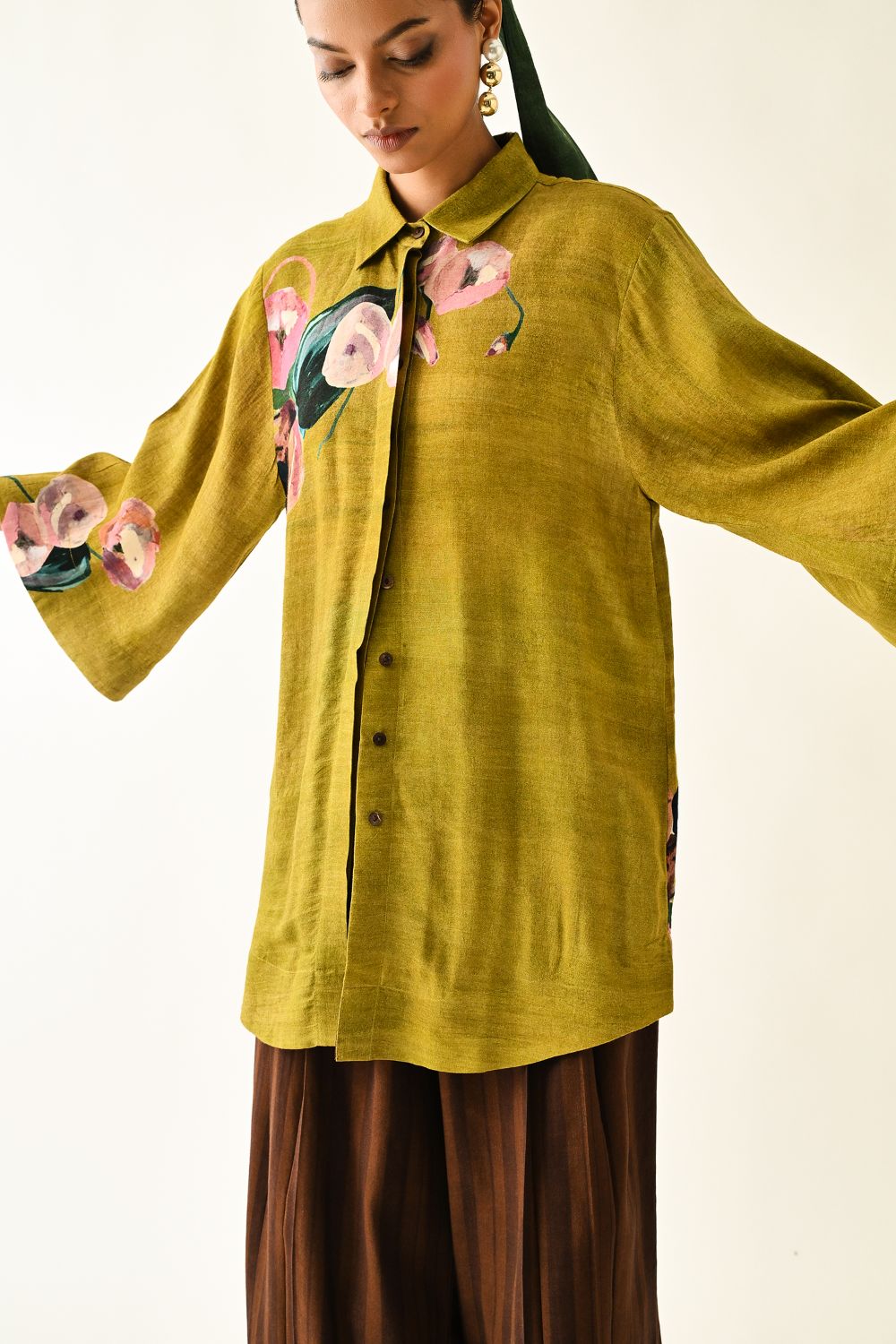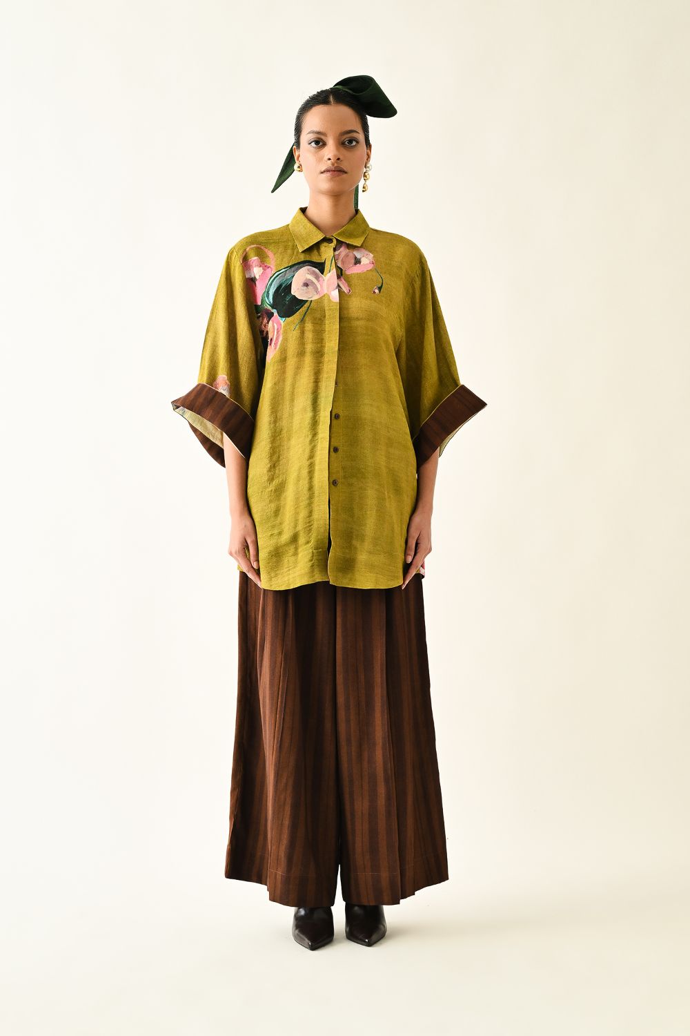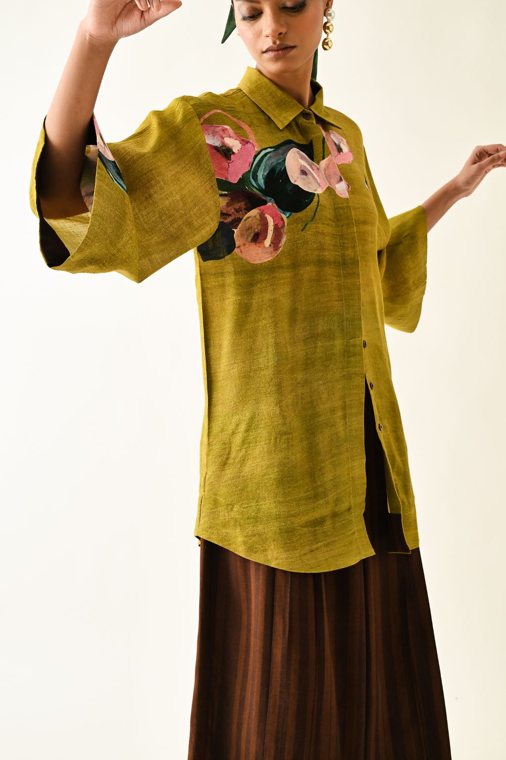 Top : Anti-Fit, Hand-painted abstract expressionist digitally transferred print, Shirt collar, front hidden placket. Print placements will vary—single Piece. Model is wearing XS/S