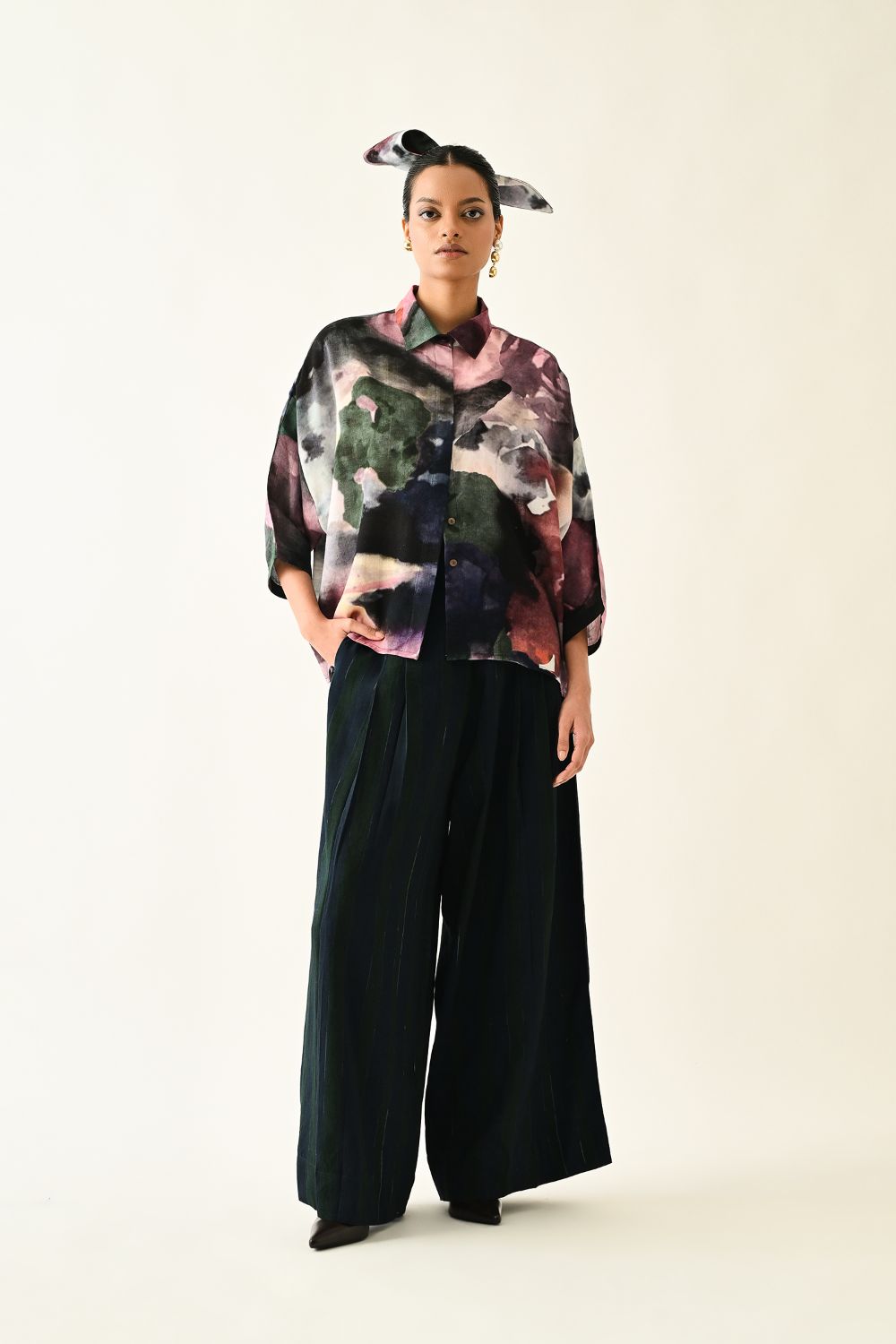 Lower: Anti fit, Pleated pants, Front zipper with button, hand-painted abstract expressionist digitally transferred print, side pockets.
