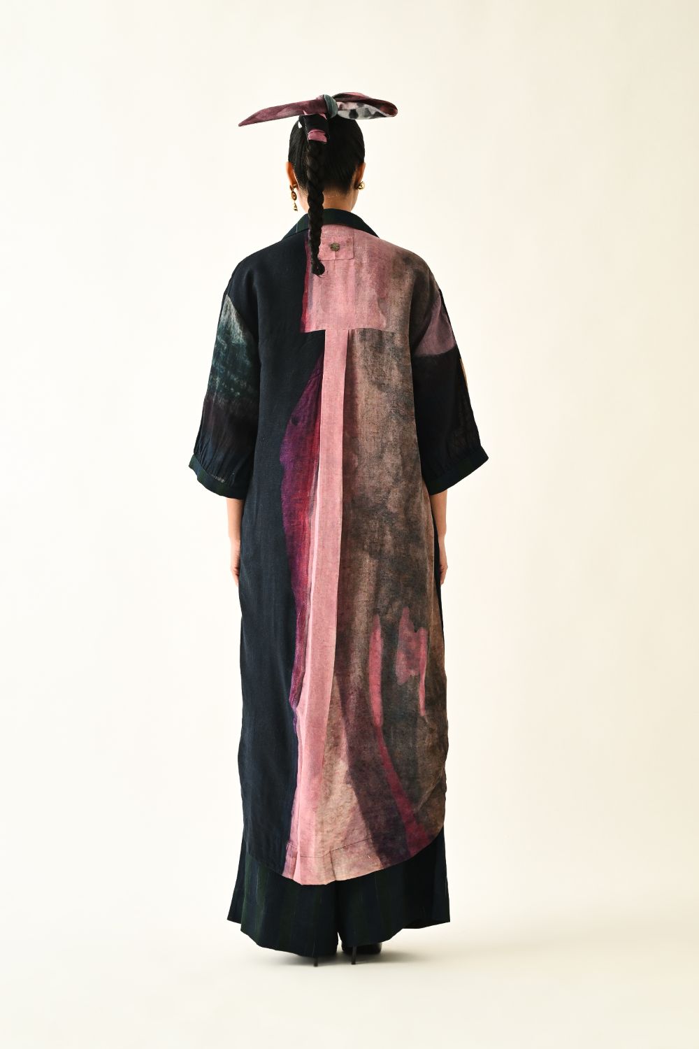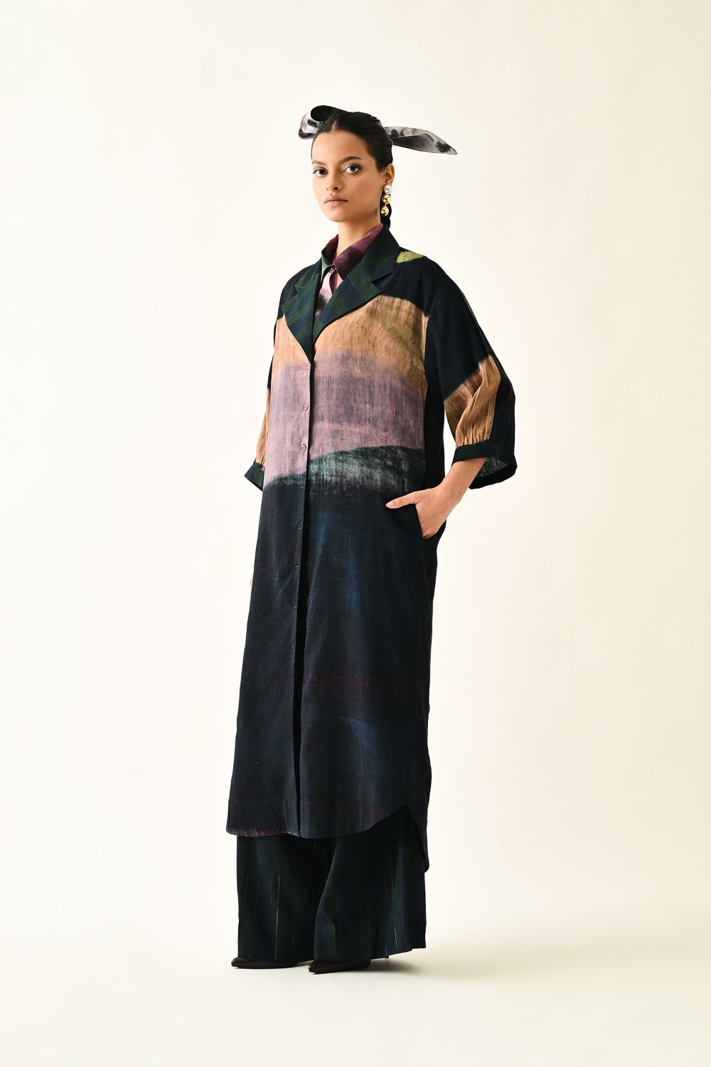 Dress: An Anti fit trench with Hand-painted abstract expressionist digitally transferred print, gathered sleeves, back yoke, box pleat at the back. Print placement will vary - single piece. Model is wearing - XS/S