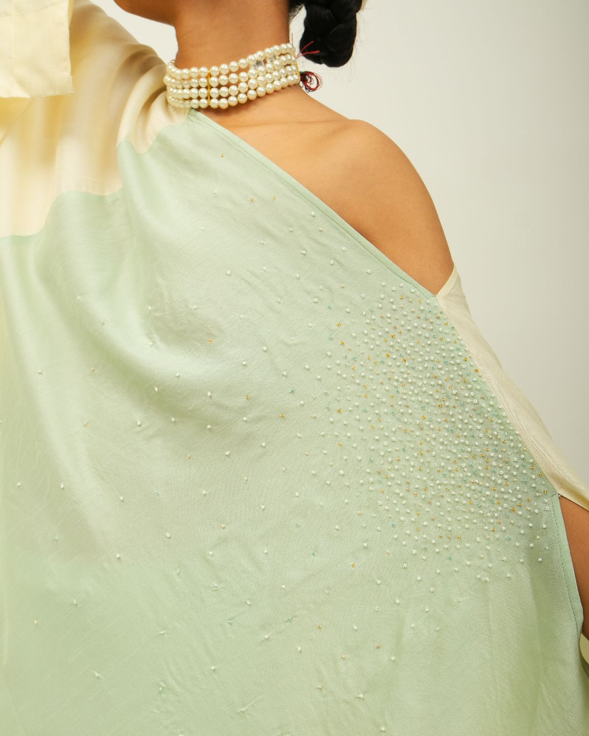 Asymmetrical Anti-Fit Dress, color-blocked design, bead work, one-shoulder neckline, asymmetrical silhouette, —single piece.