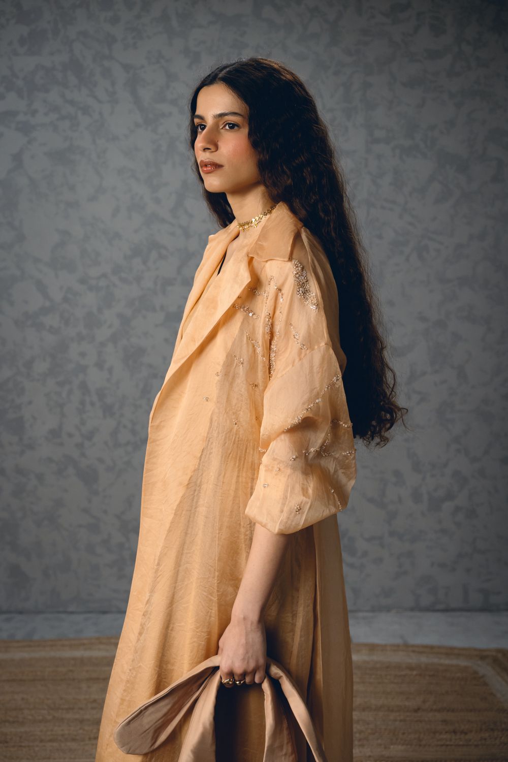 A nude dress complemented by a sheer organza jacket.