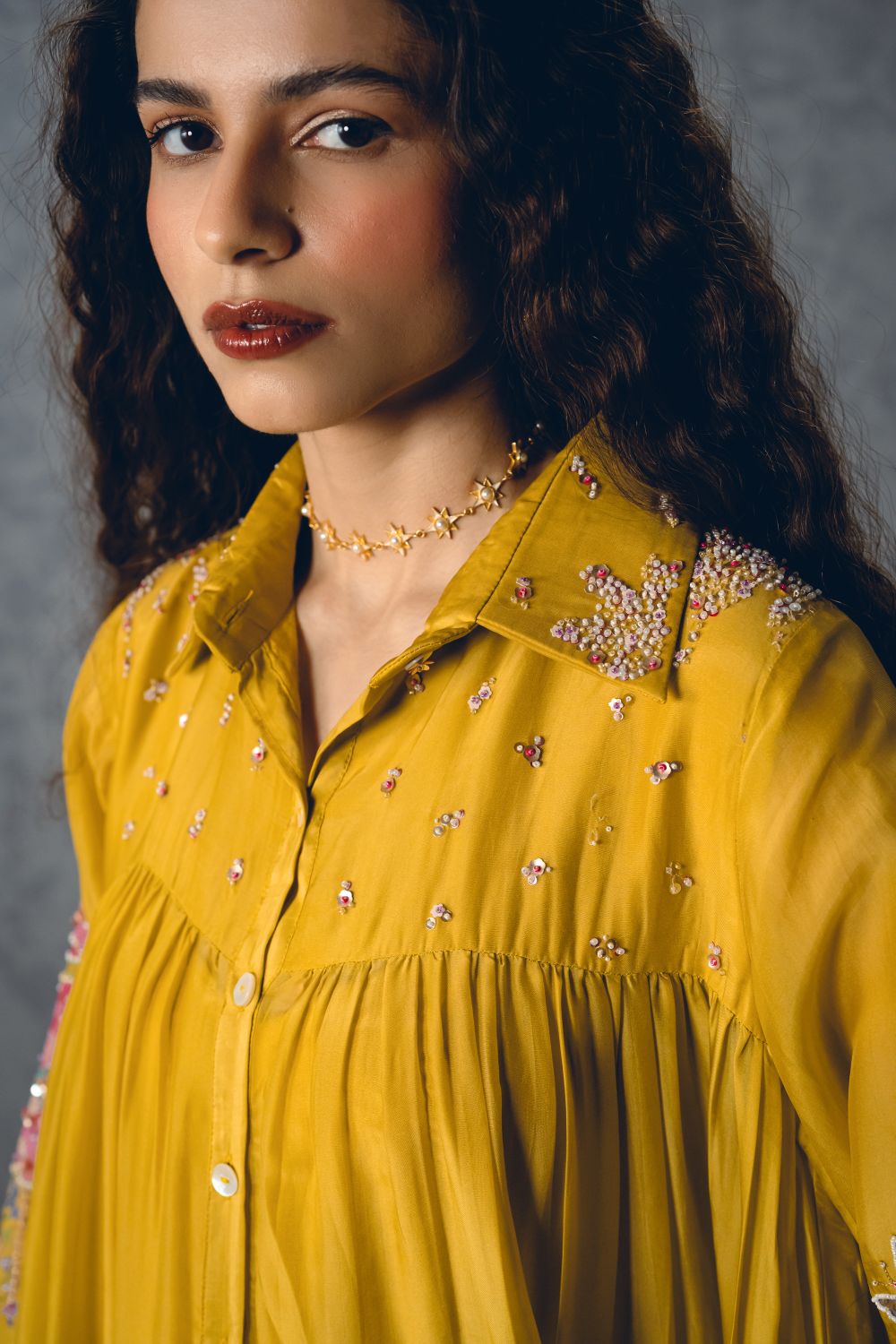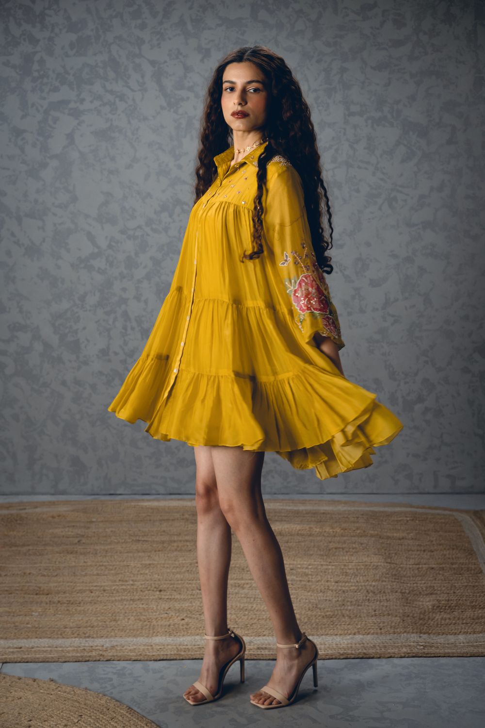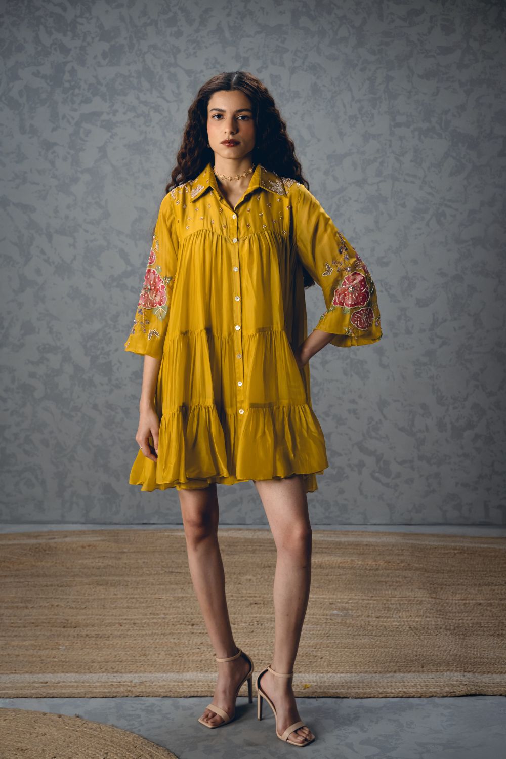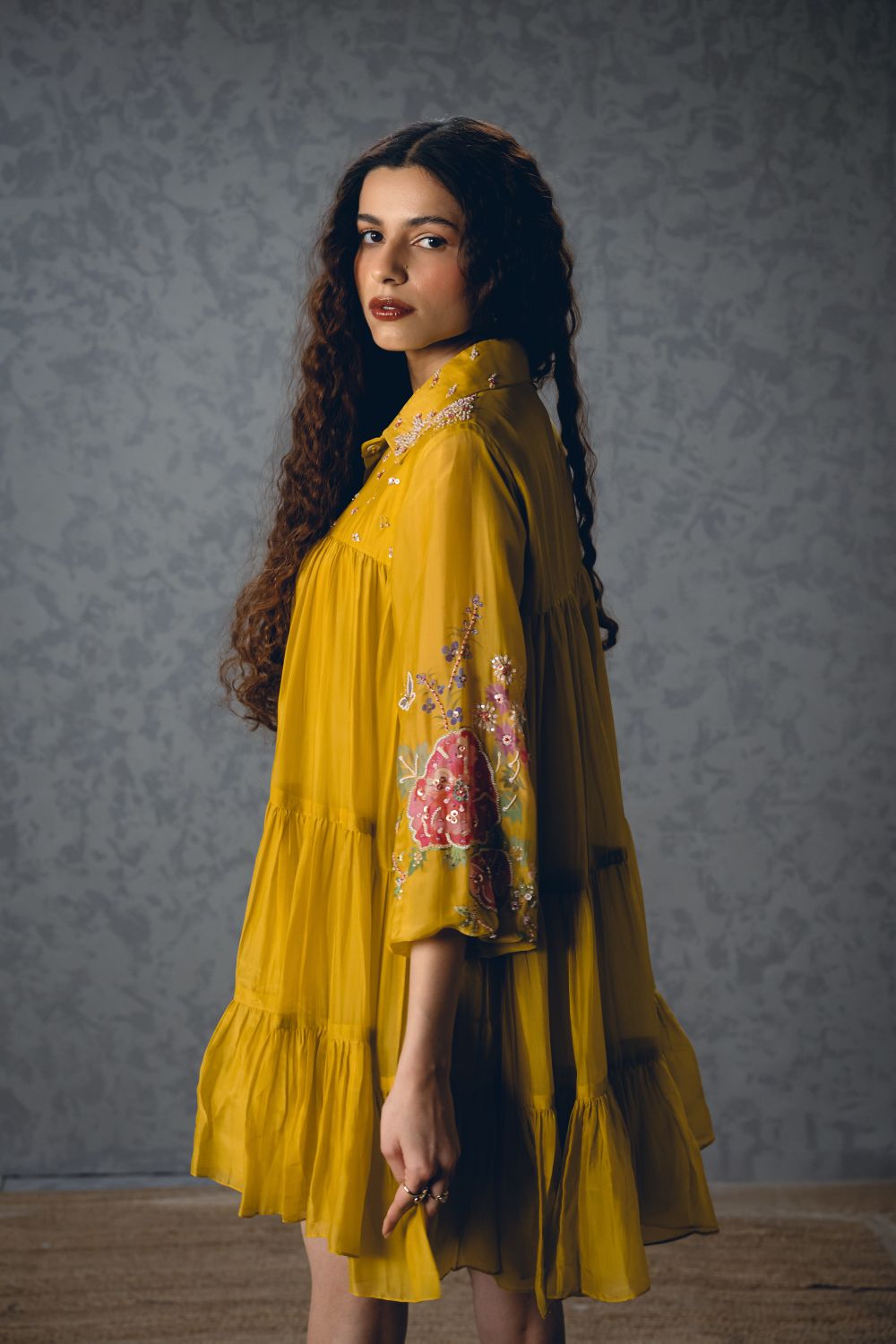 A mustard yellow short dress crafted from luxurious silk organza, designed in a relaxed, loose-fit silhouette for effortless elegance. It features printed sleeves and a delicately embroidered collar and yoke, adding intricate detail to the airy design.